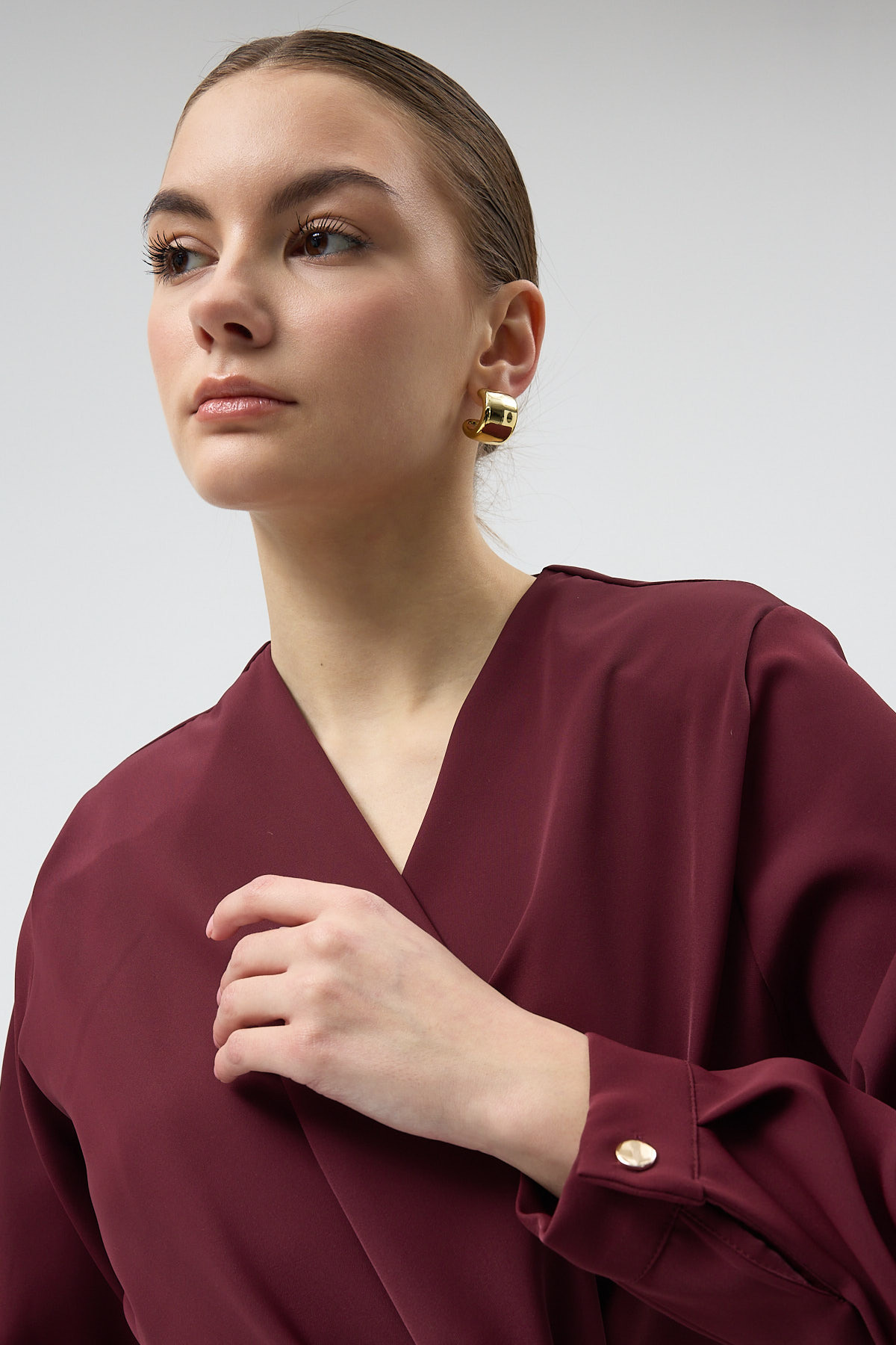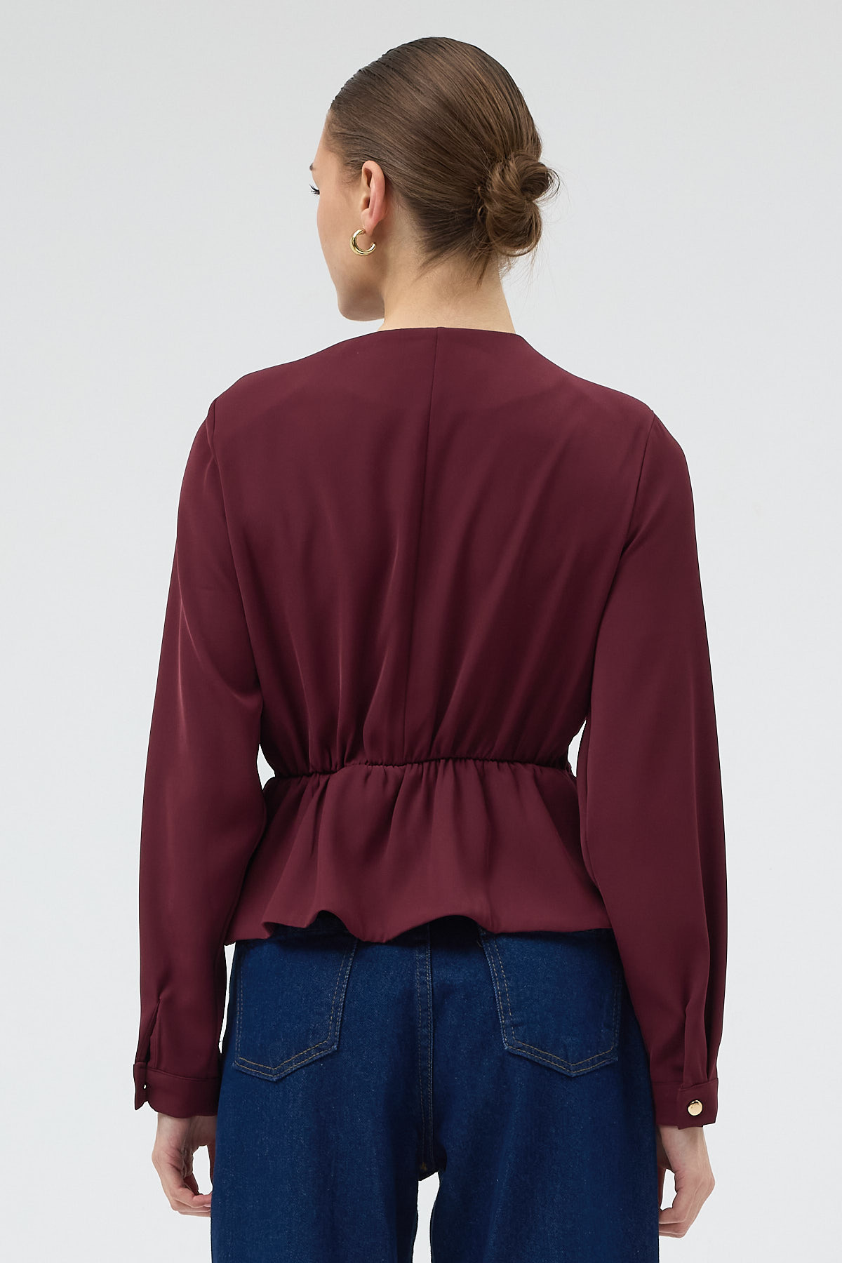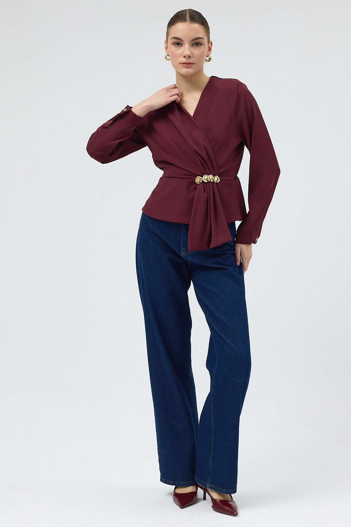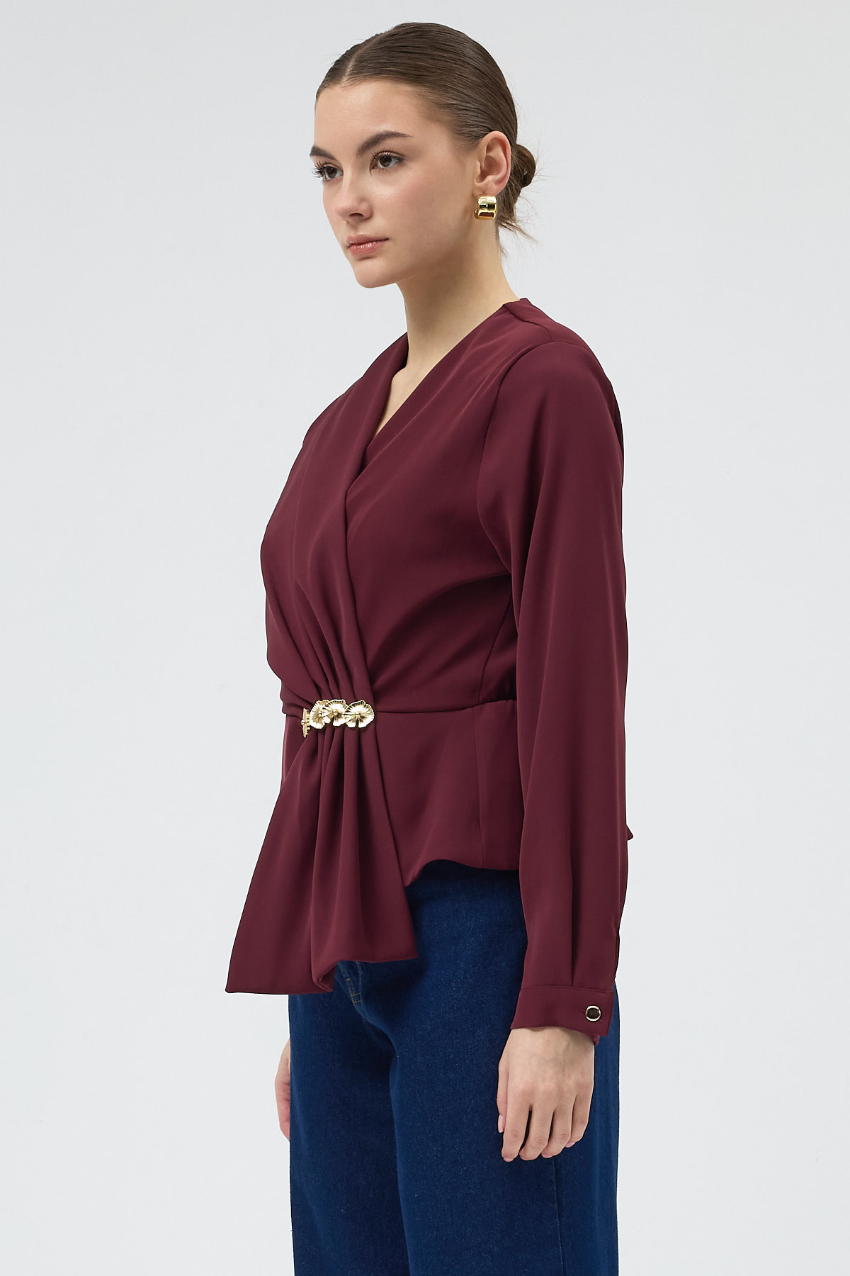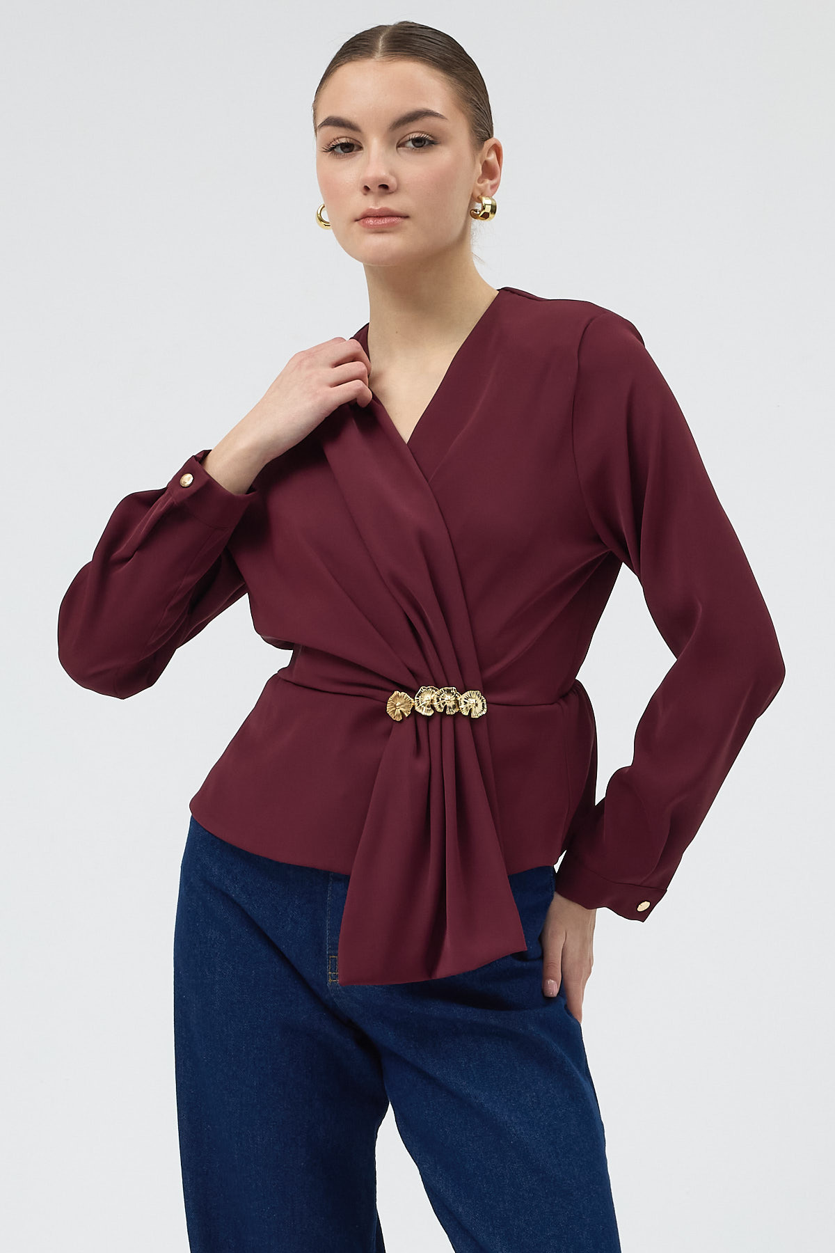 Bordo Kruvaze Yaka Taş Toka Detaylı Uzun Kollu Kadın Bluz 251279
