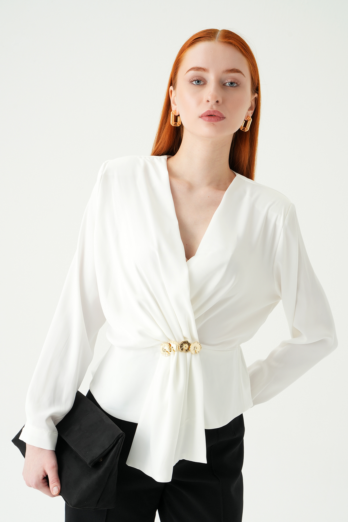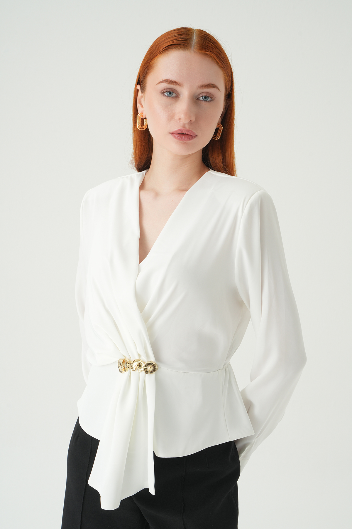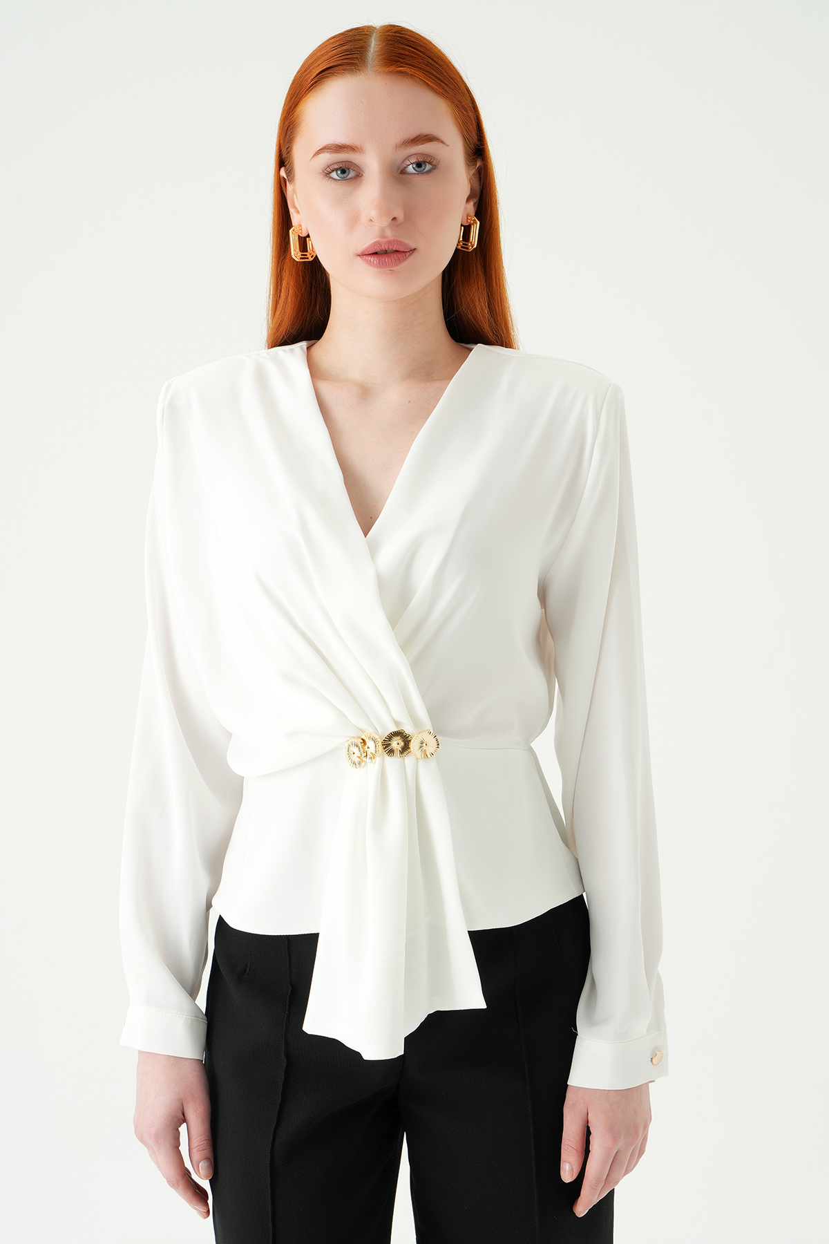 Ekru Kruvaze Yaka Taş Toka Detaylı Uzun Kollu Kadın Bluz 251279