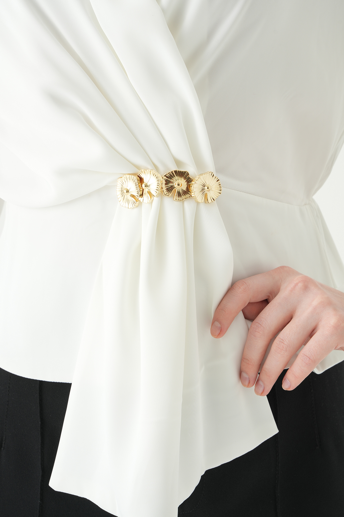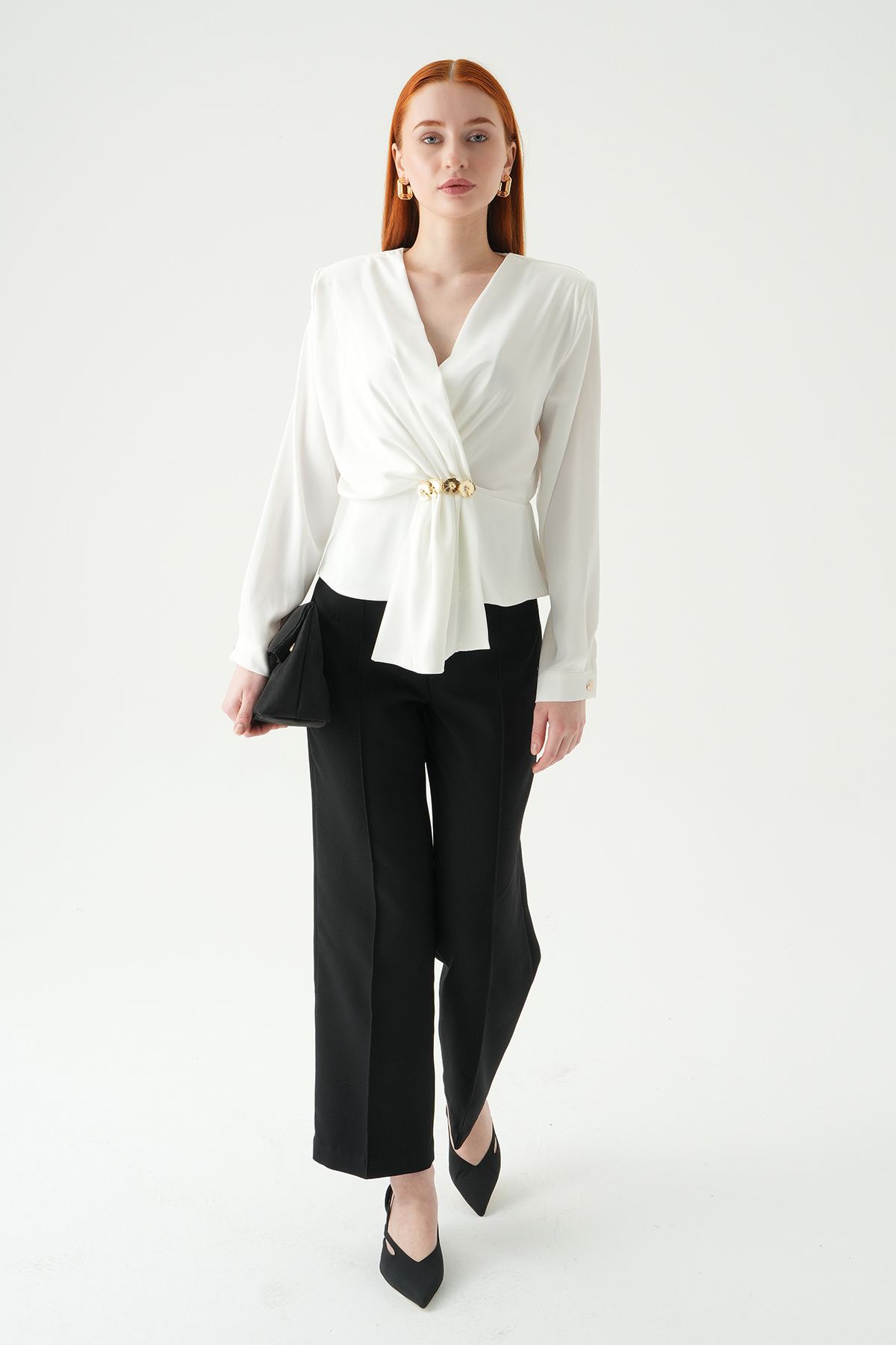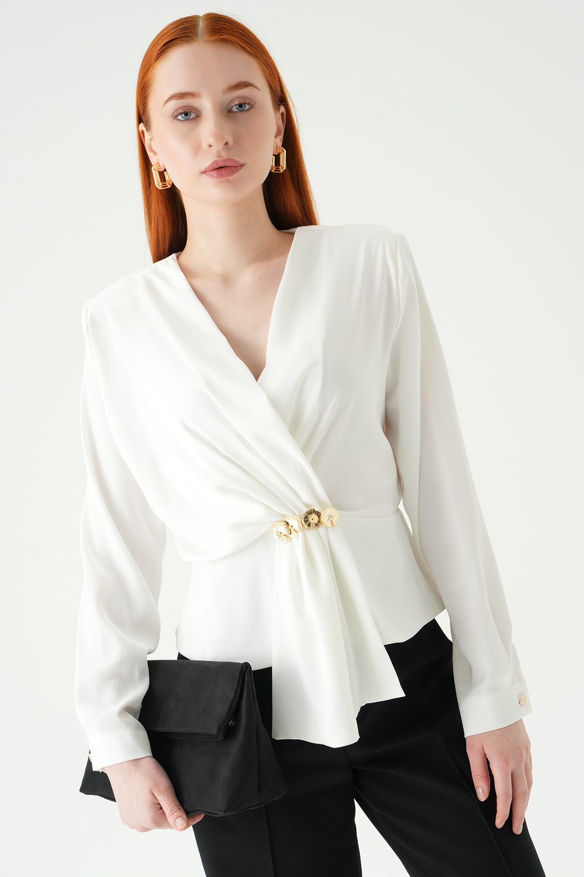Ekru Kruvaze Yaka Taş Toka Detaylı Uzun Kollu Kadın Bluz 251279