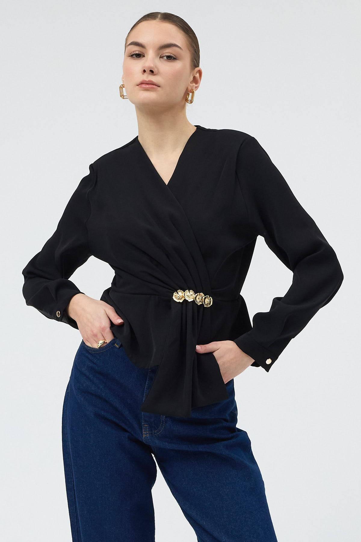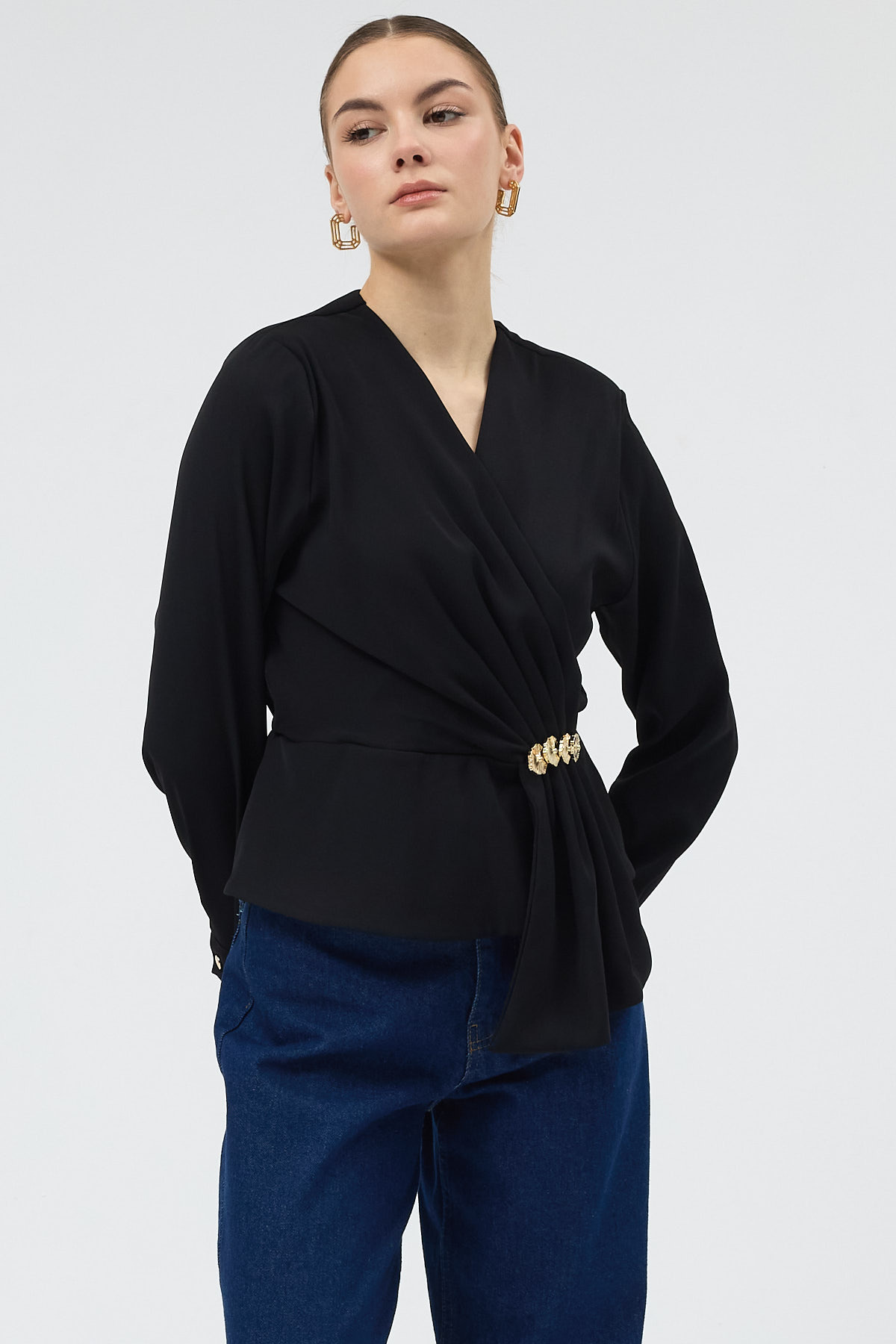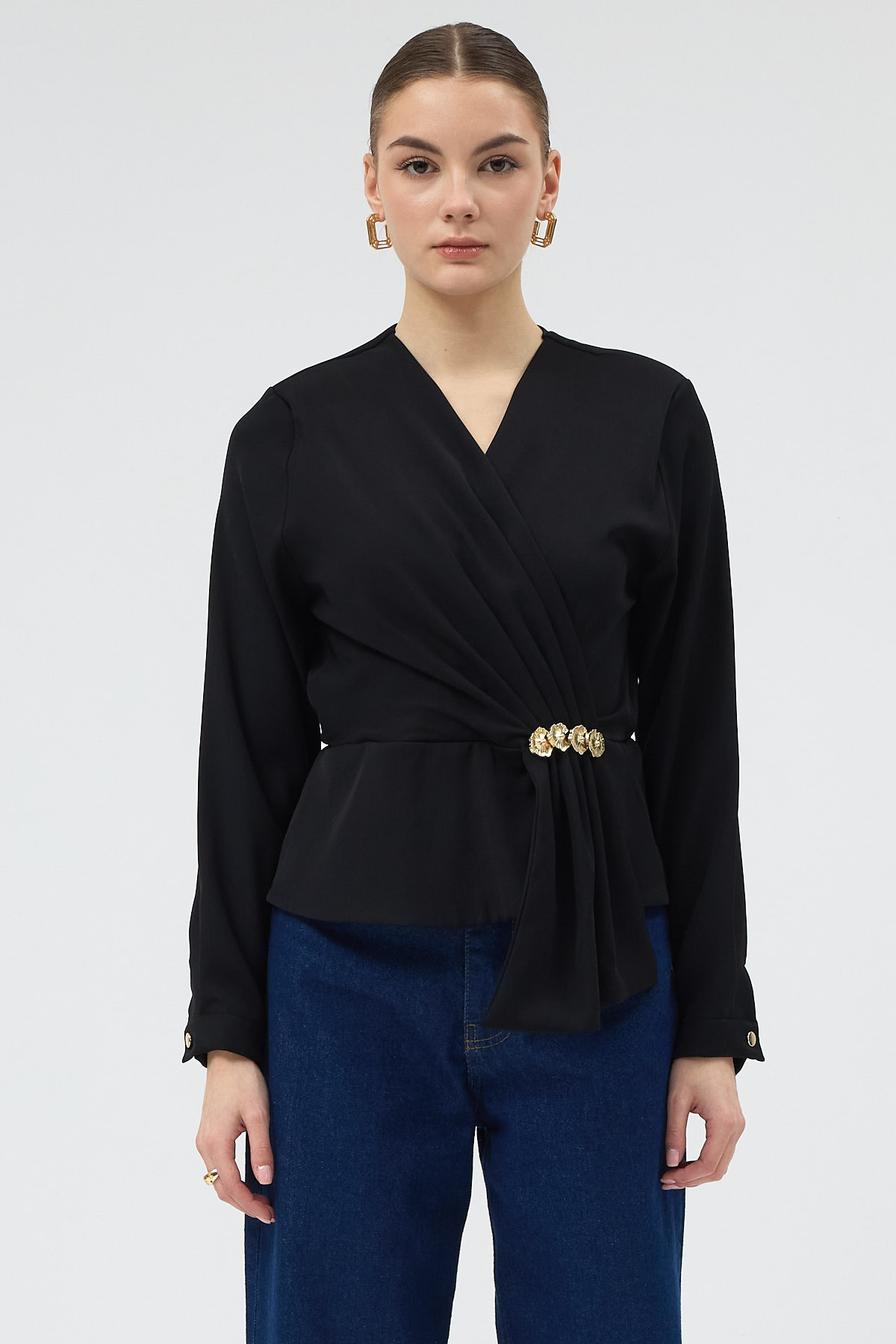 Siyah Kruvaze Yaka Taş Toka Detaylı Uzun Kollu Kadın Bluz 251279