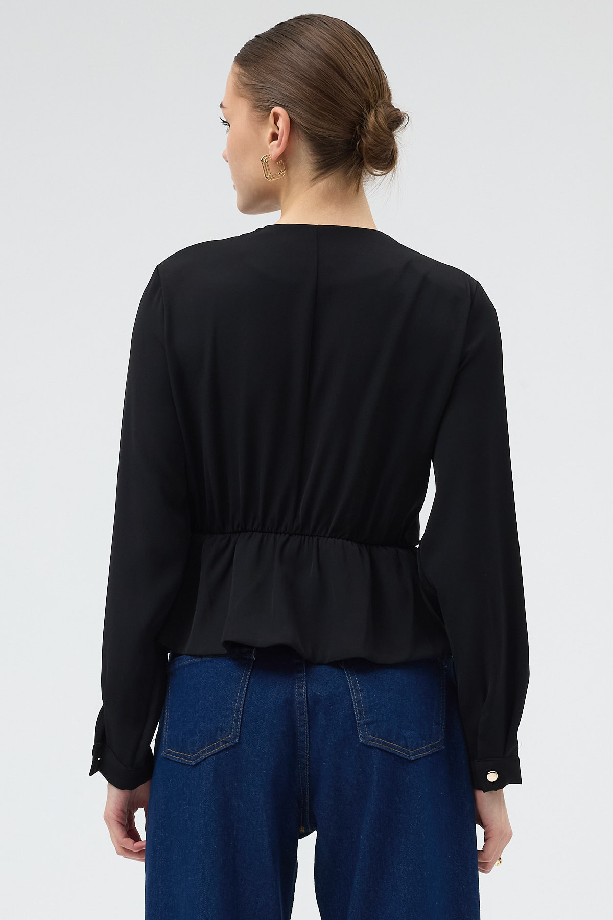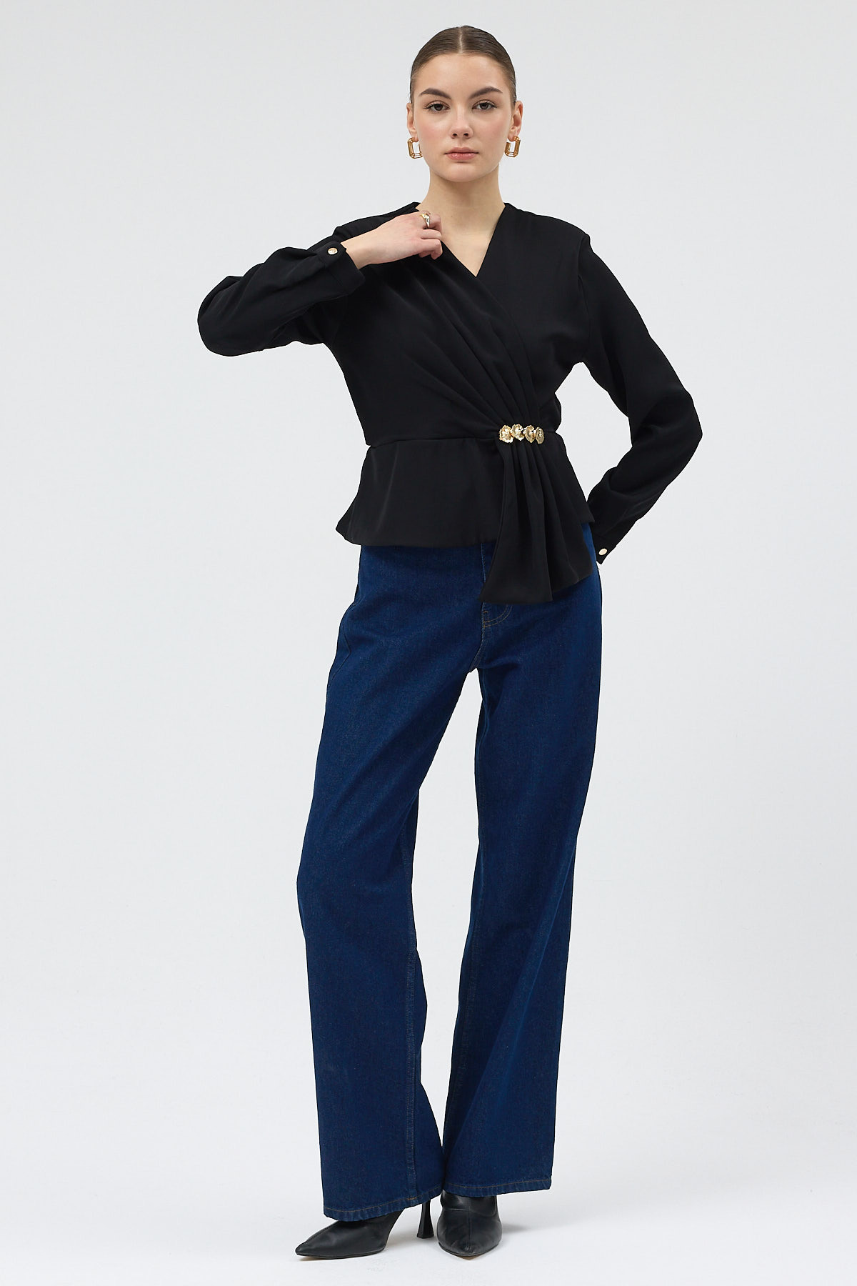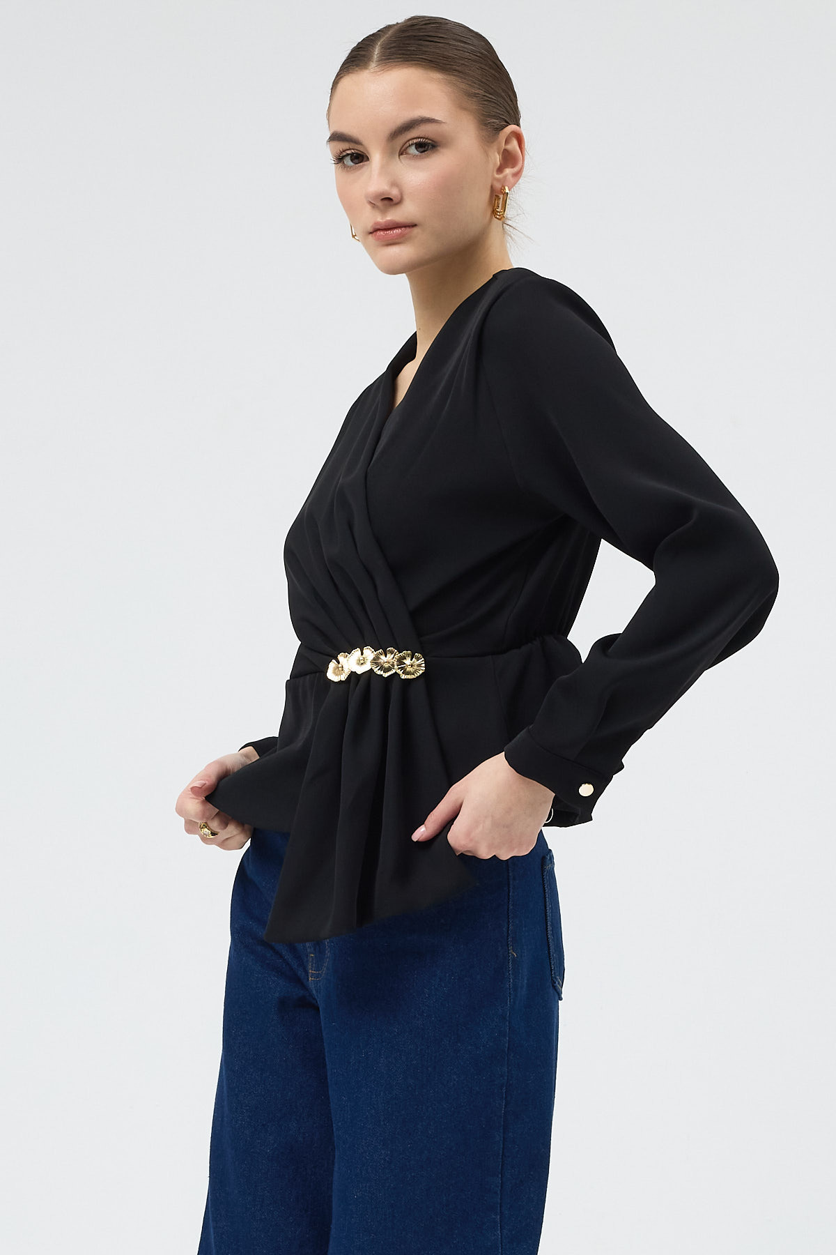 Siyah Kruvaze Yaka Taş Toka Detaylı Uzun Kollu Kadın Bluz 251279