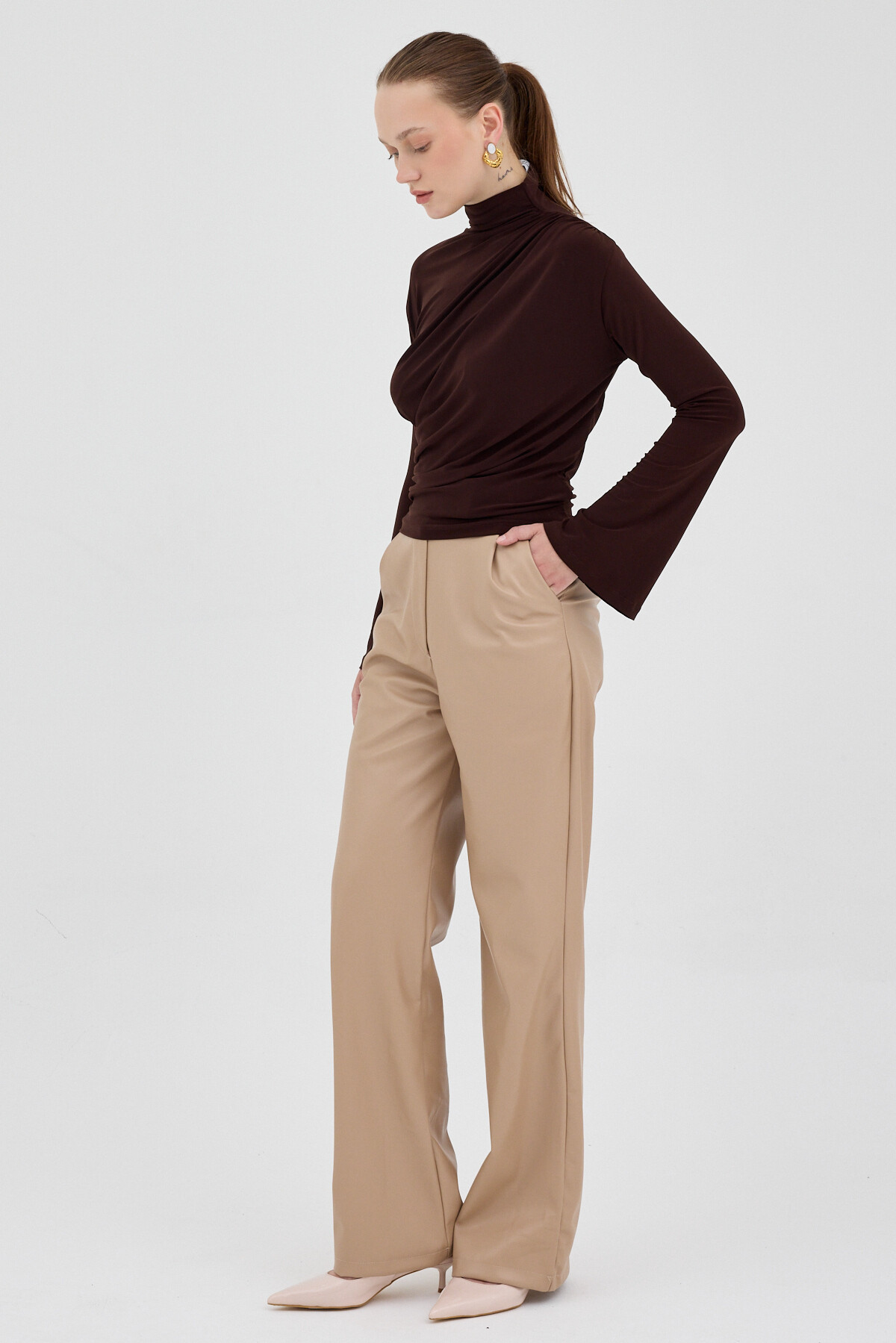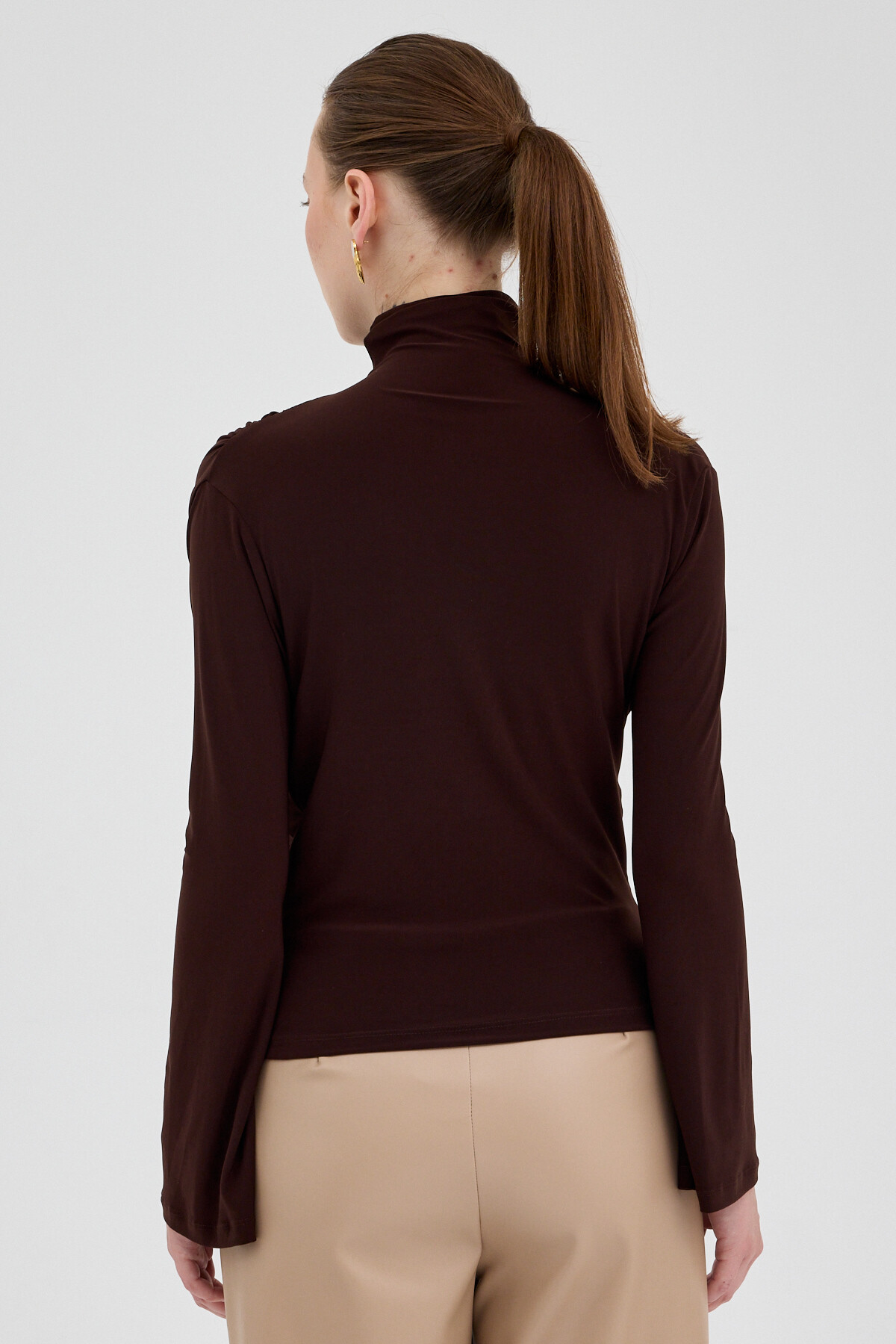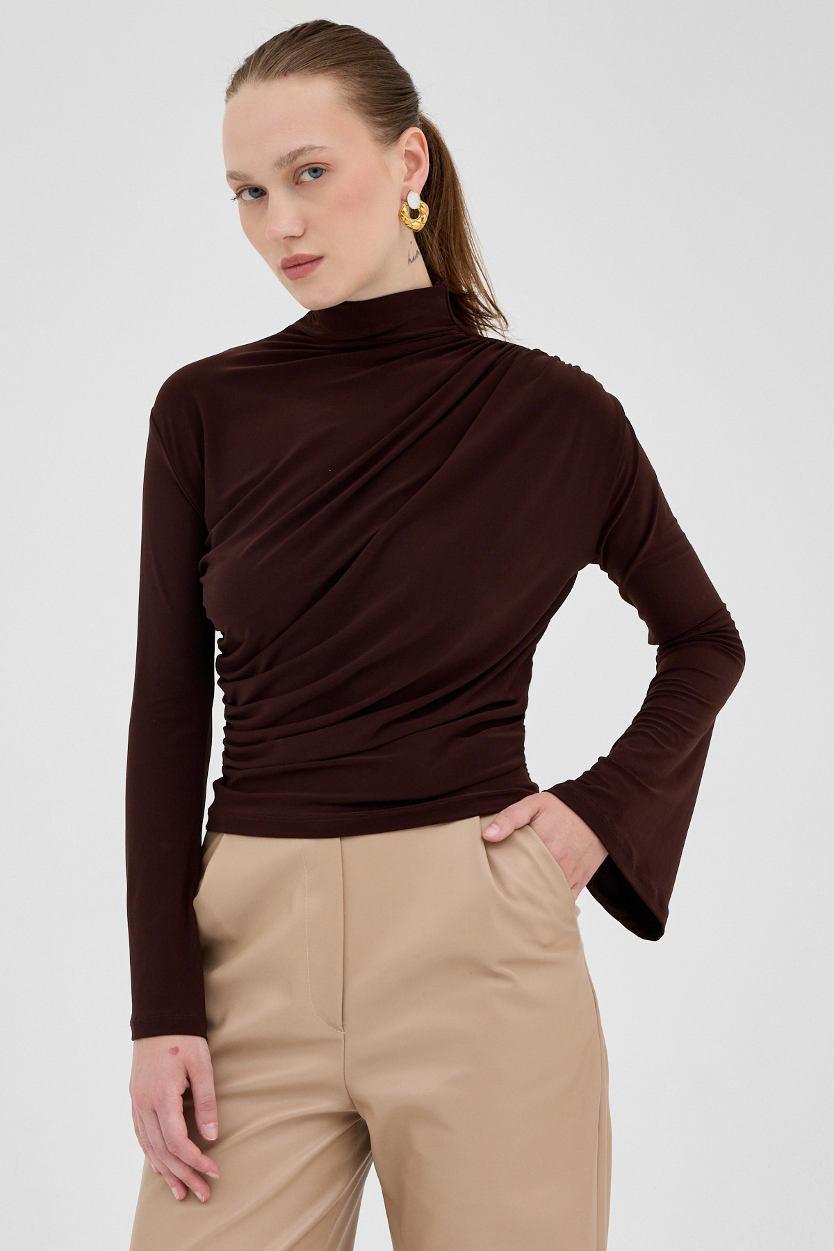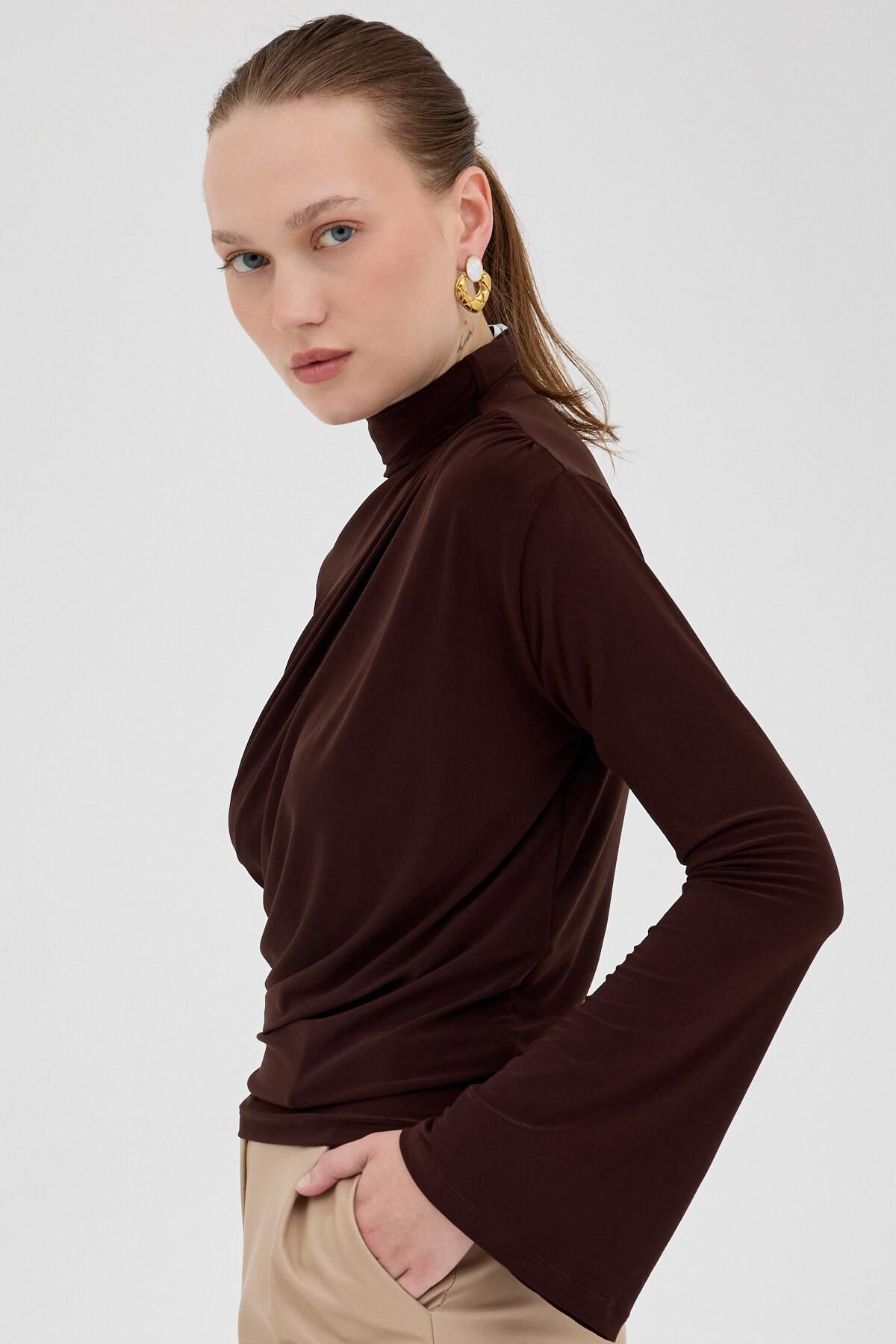 Acı Kahve Balıkçı Yaka Drapeli Bluz 2517