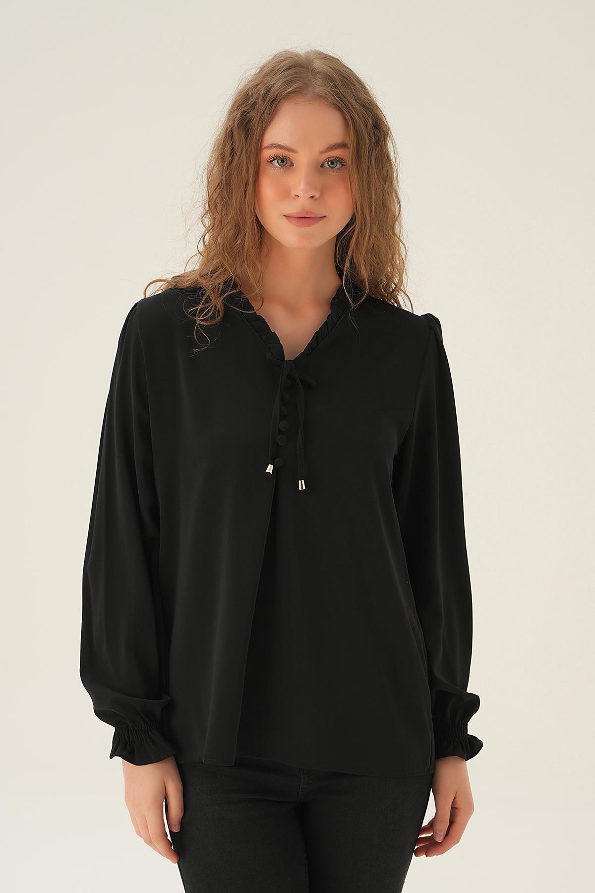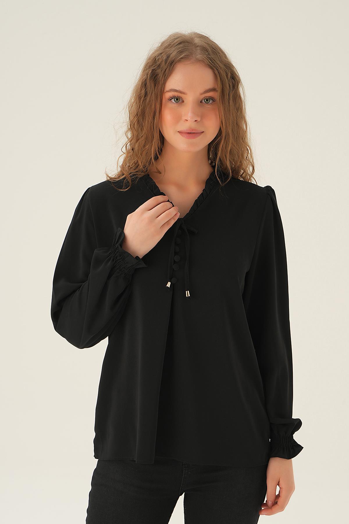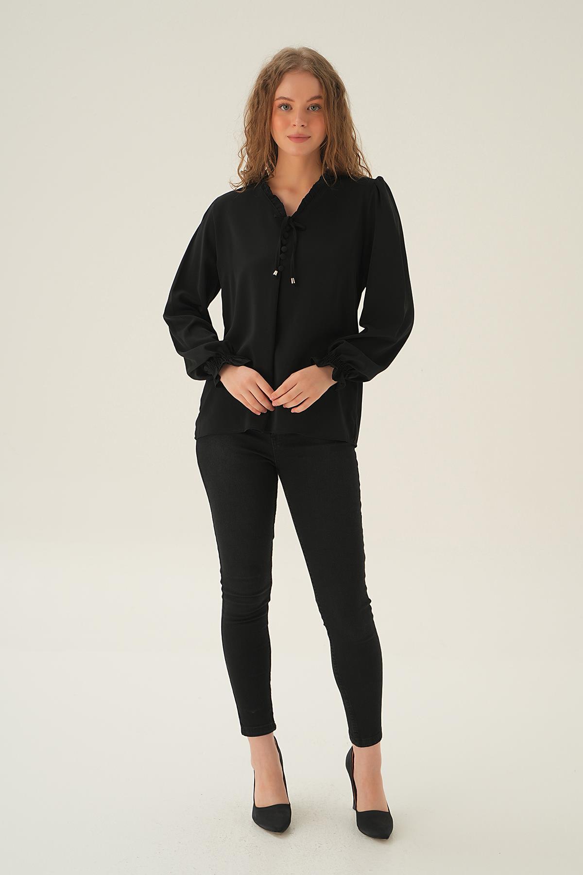 Siyah Yaka Bağlamalı Bluz 25541