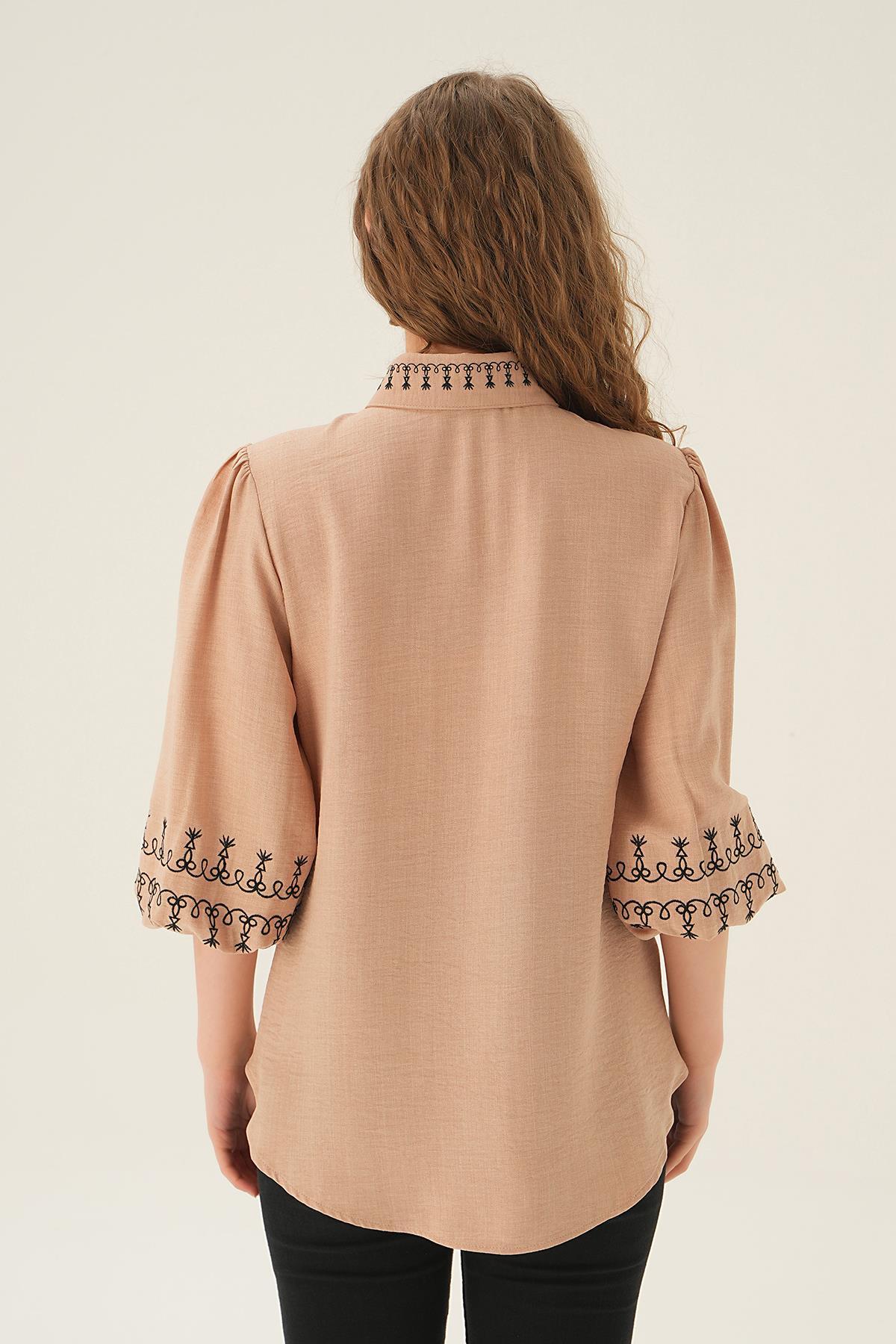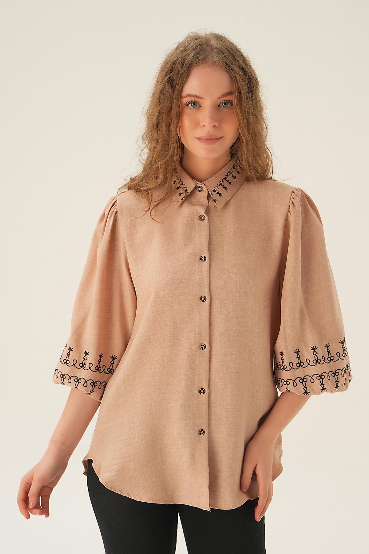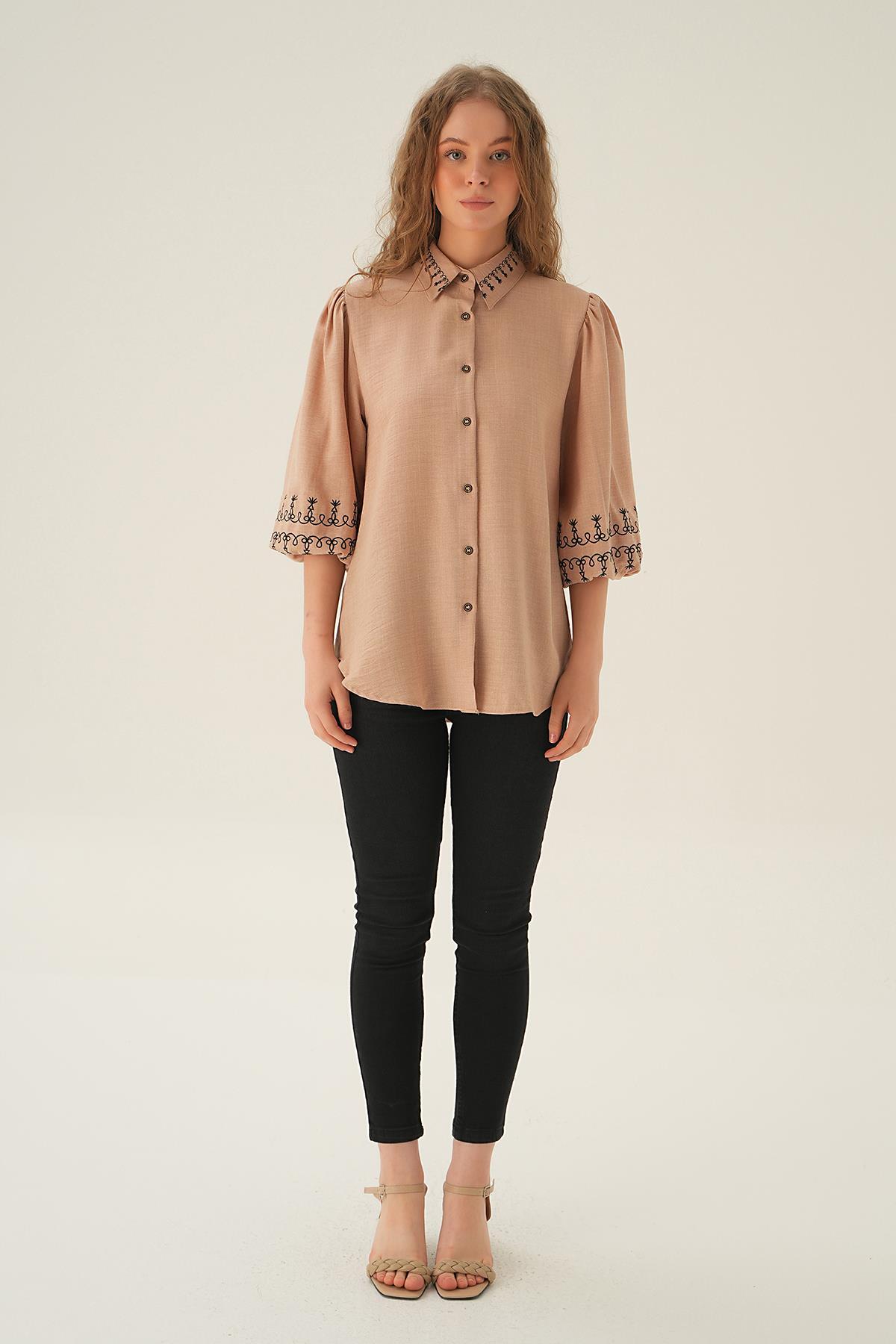 Bej Nakış Detay Gömlek 26033