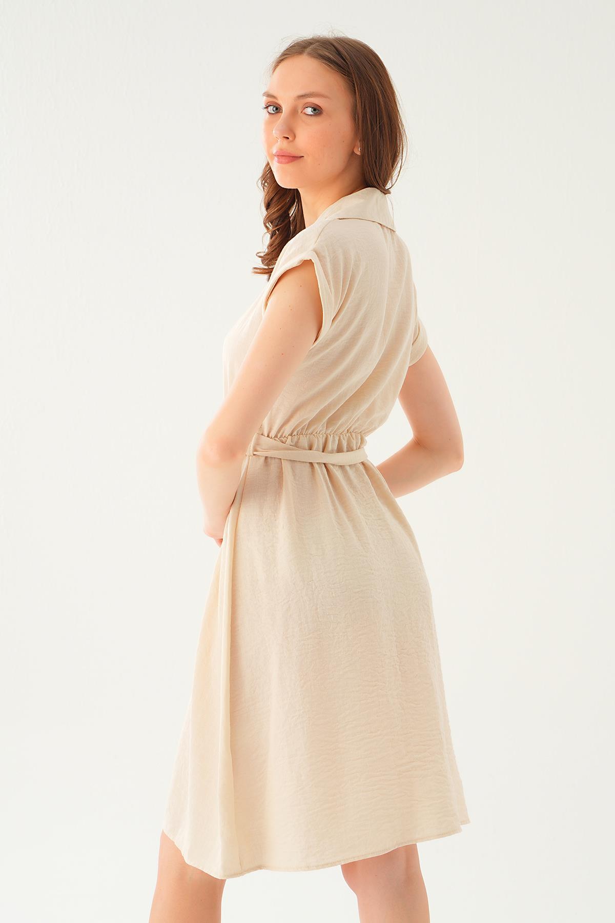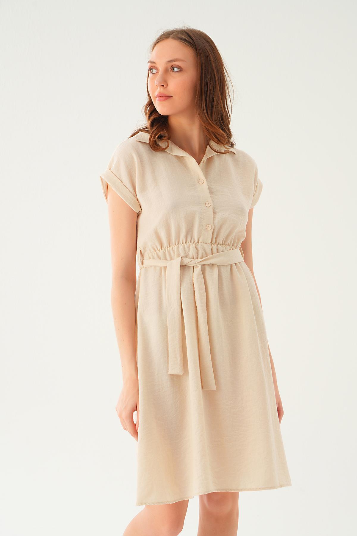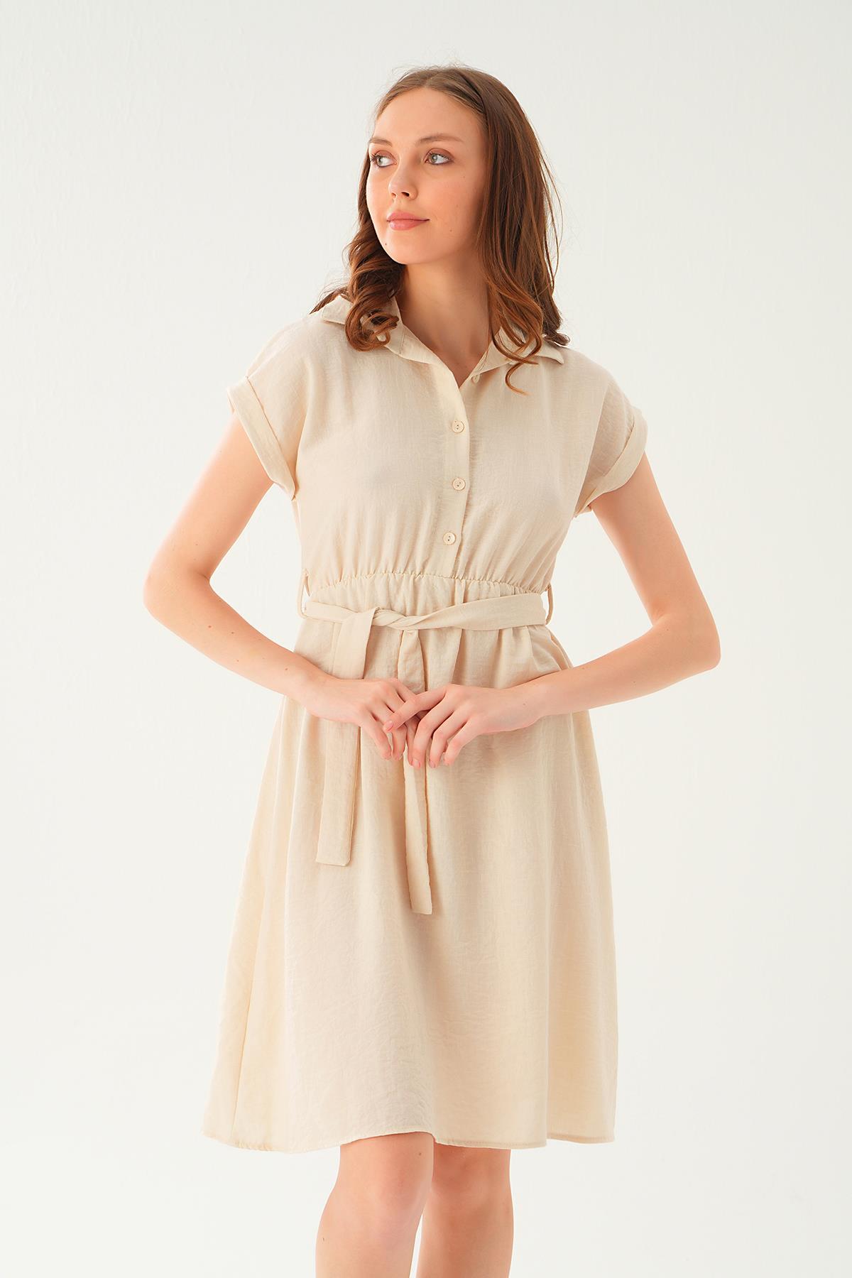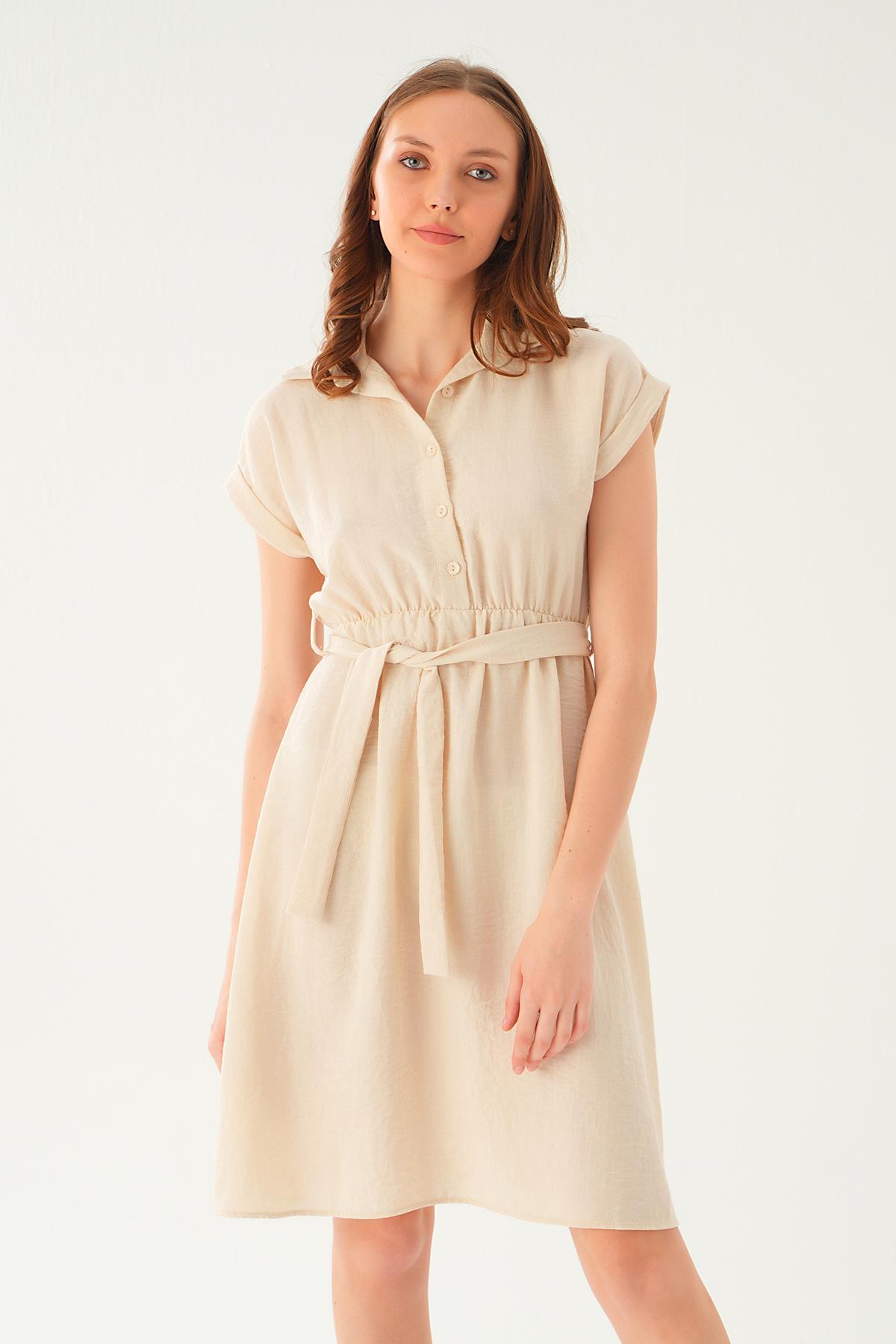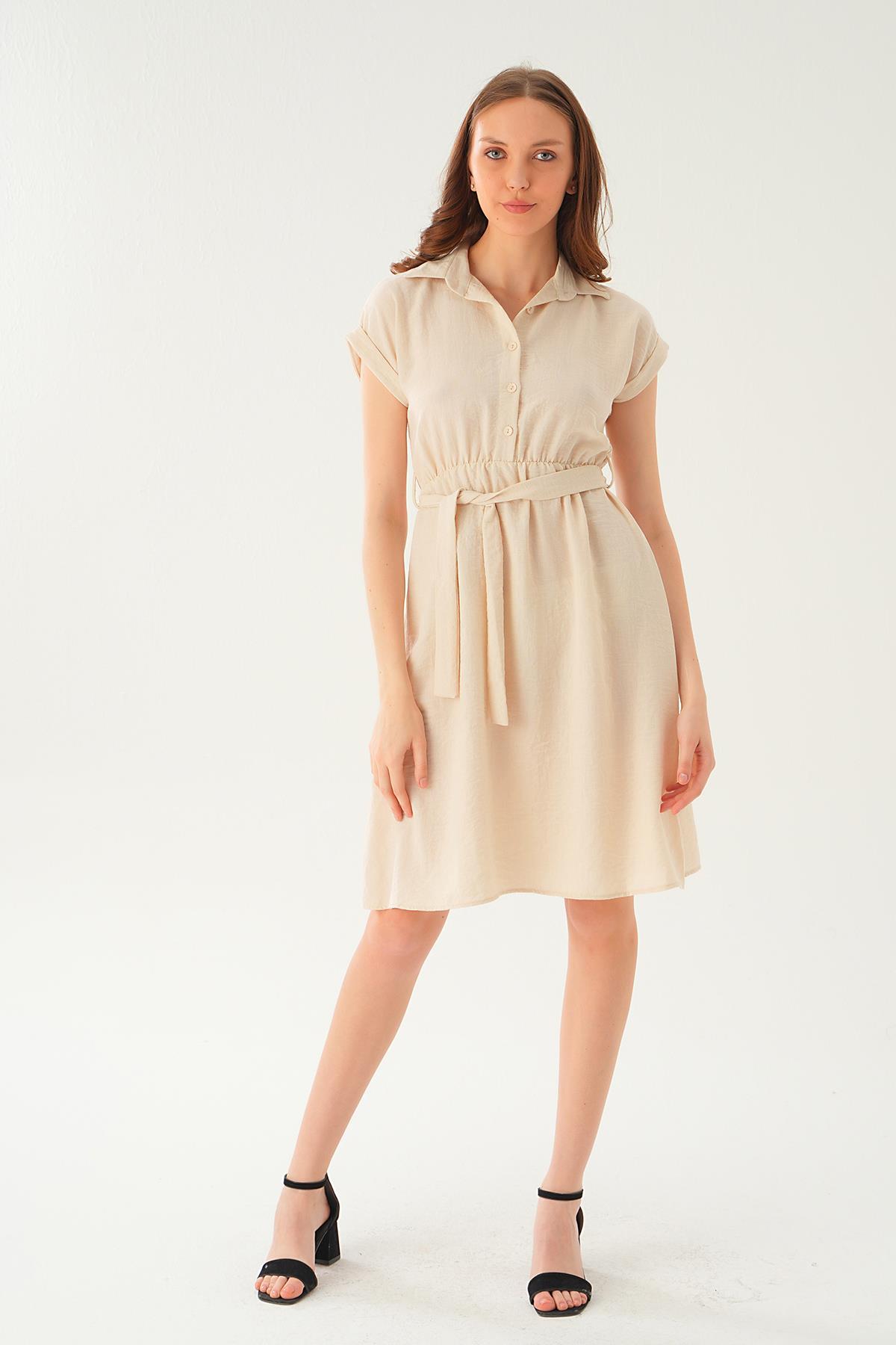 Bej Bel Kuşak Detay Elbise 2629