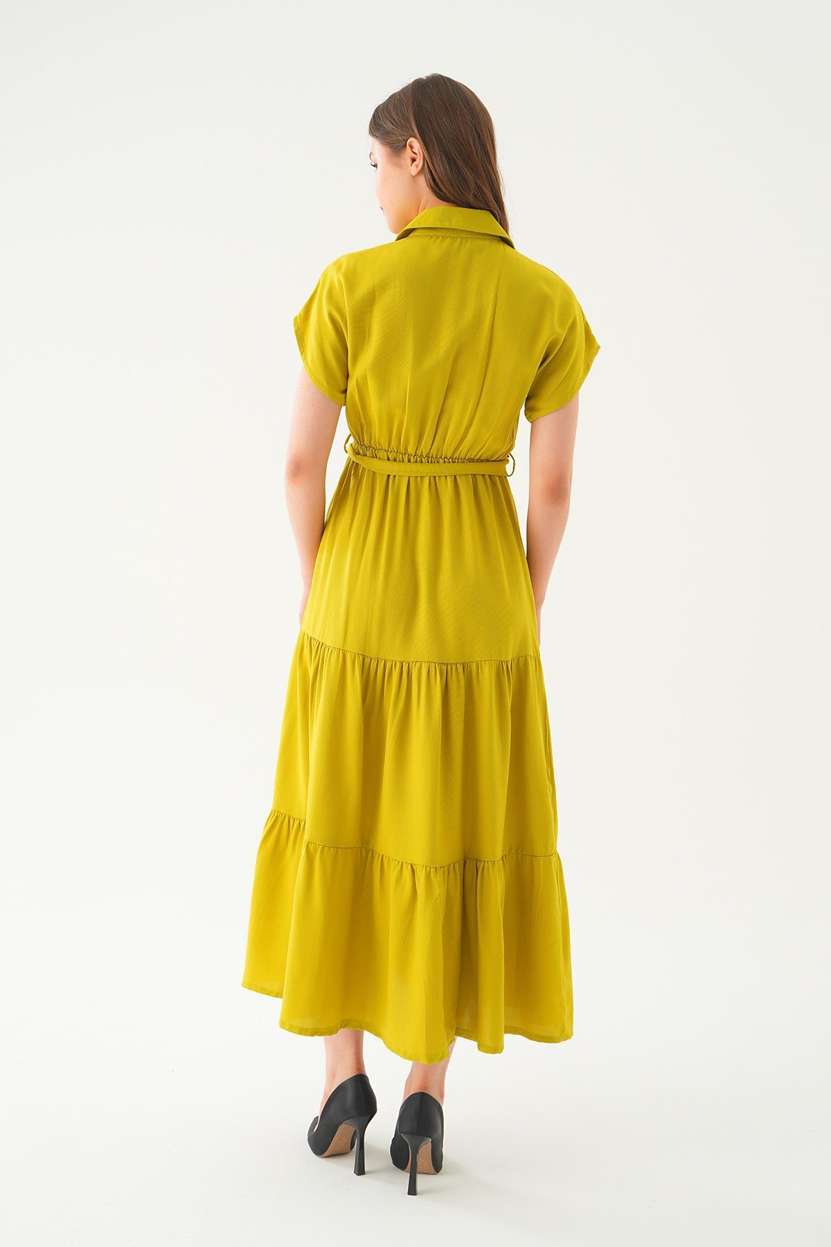 2630 Bel Kuşak Detay Uzun Elbise Yağ Yeşili