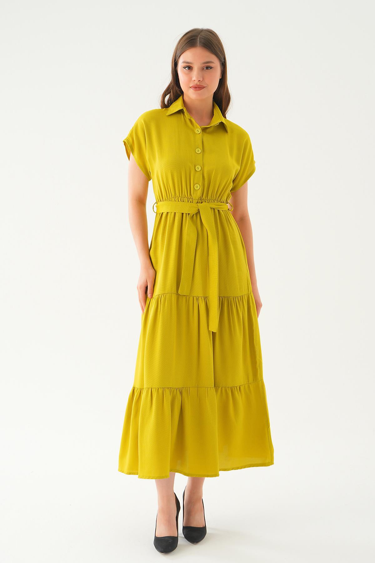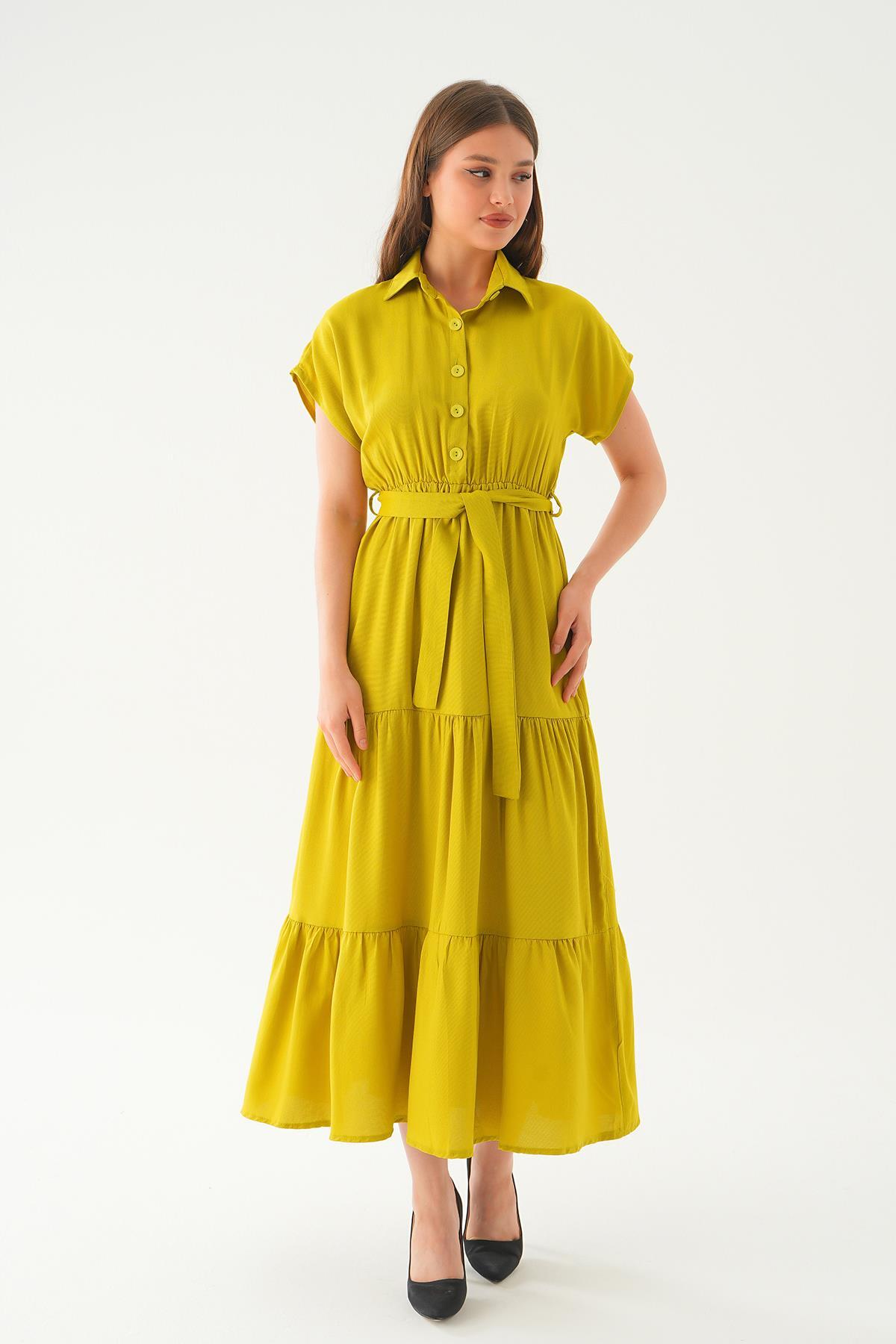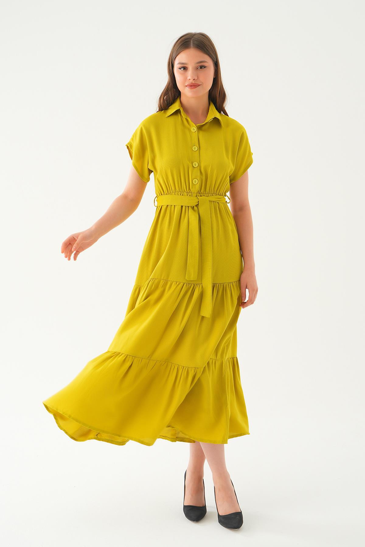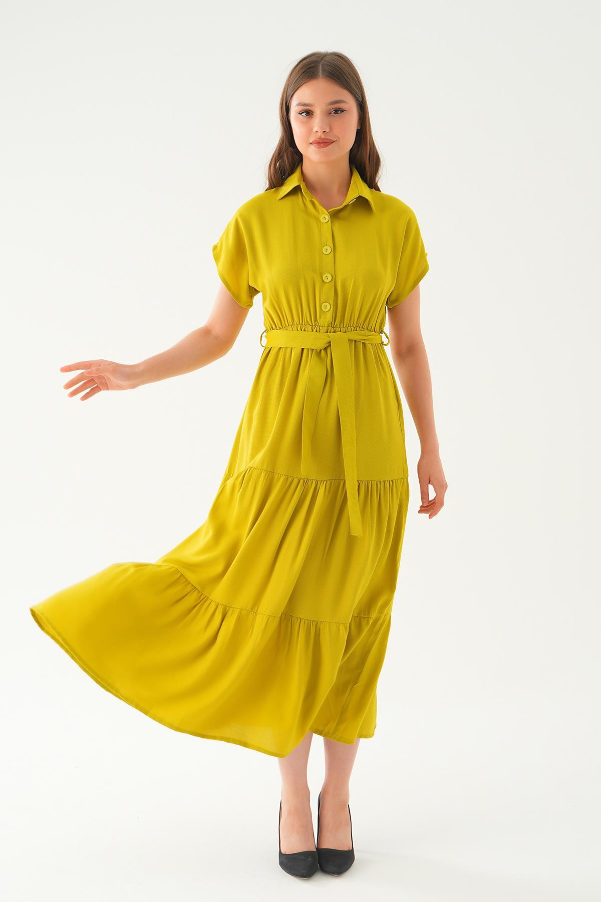 Yağ Yeşili Bel Kuşak Detay Uzun Elbise 2630