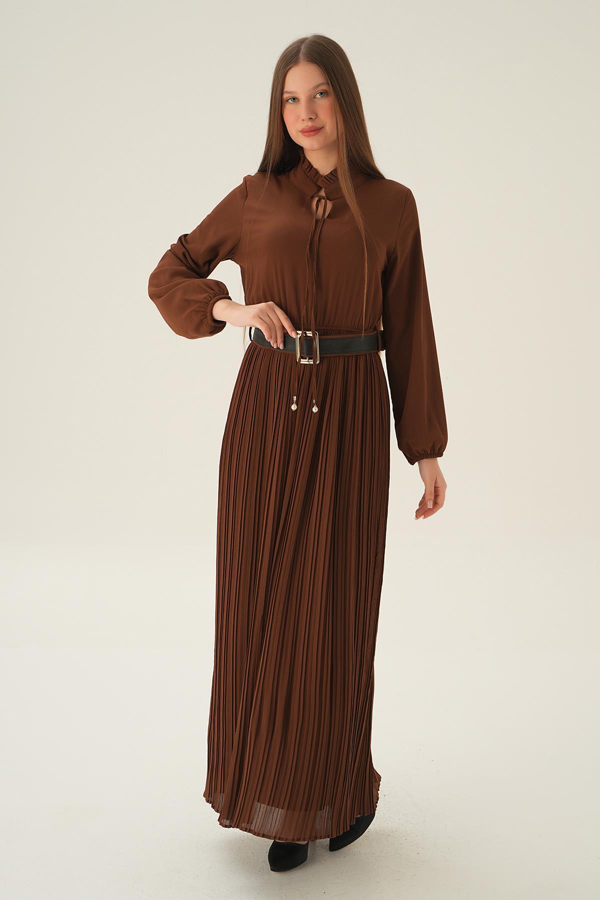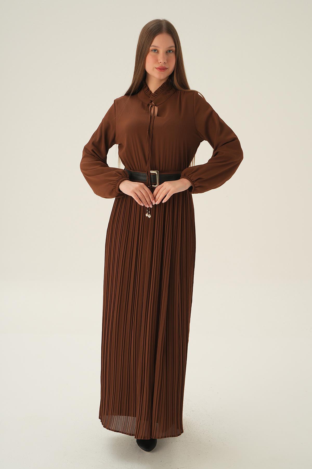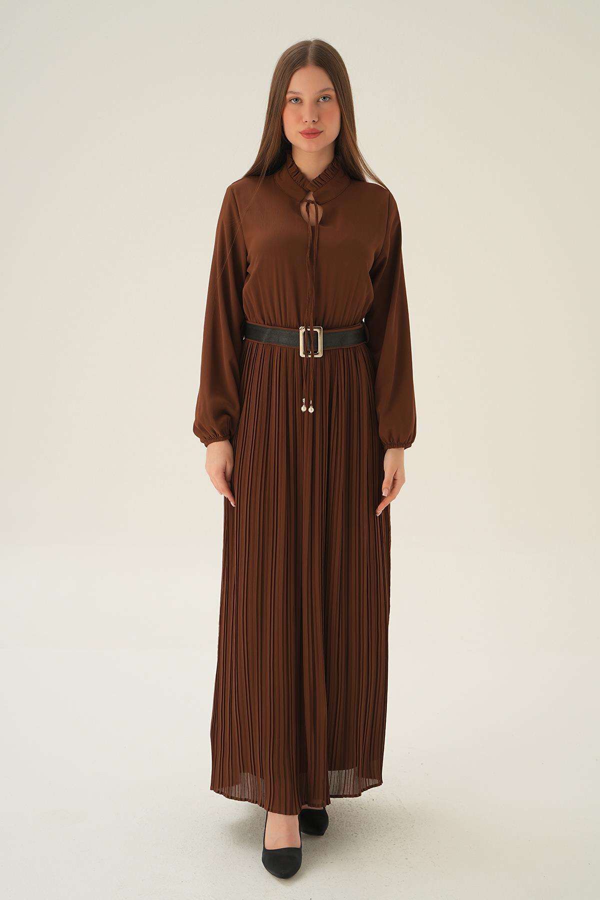 Kahve Pliseli Uzun Elbise 2641