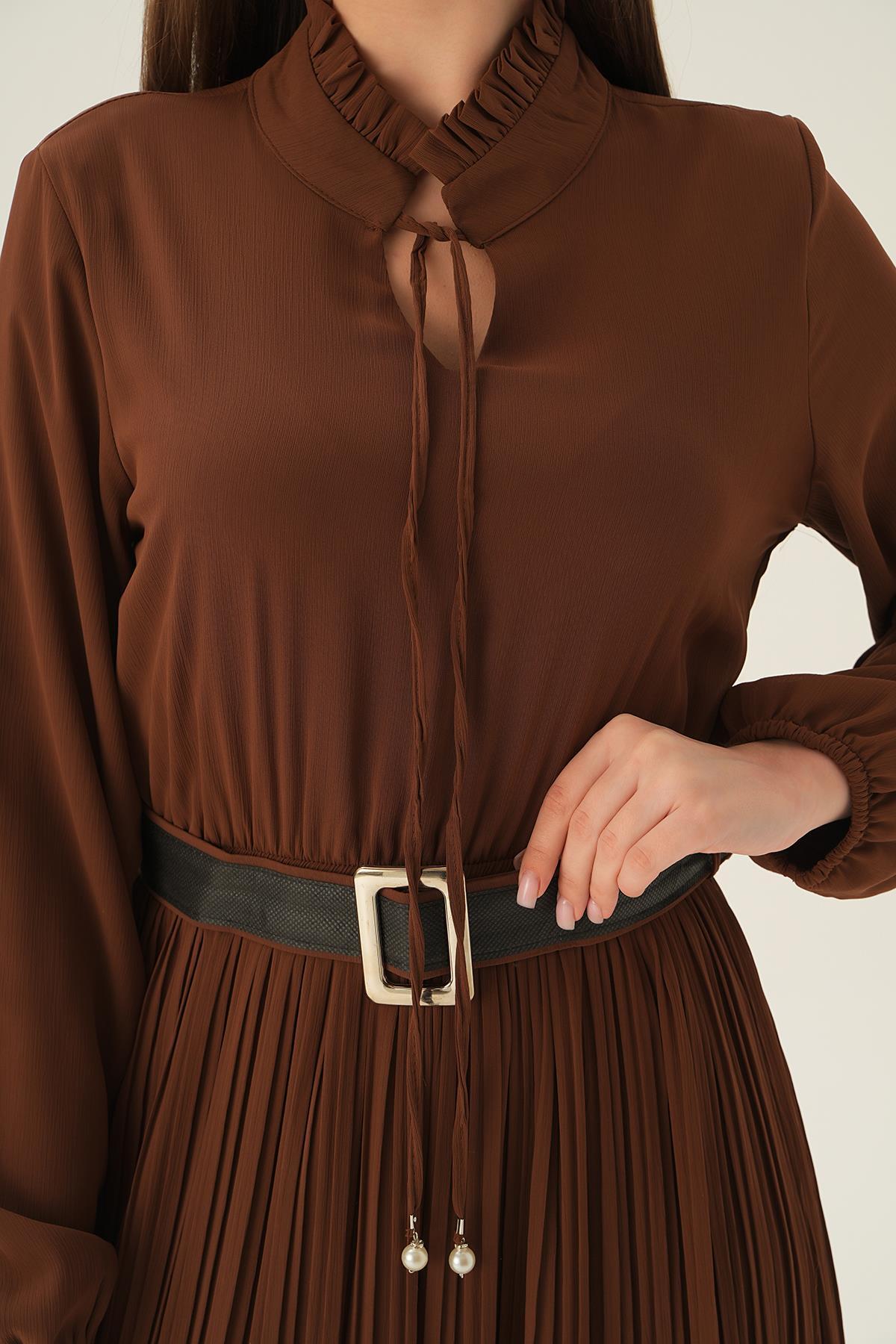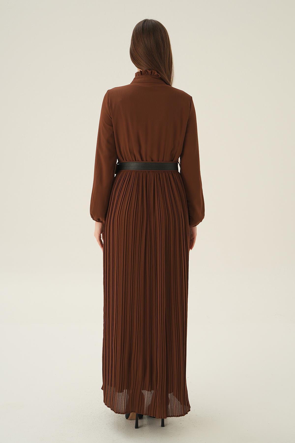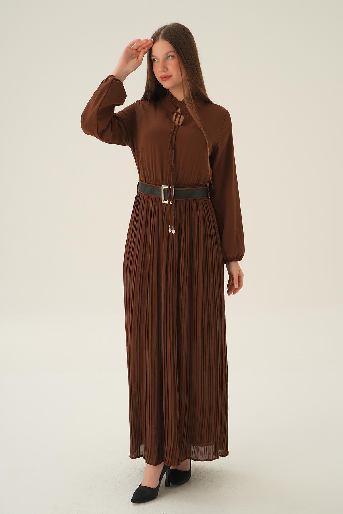 Kahve Pliseli Uzun Elbise 2641