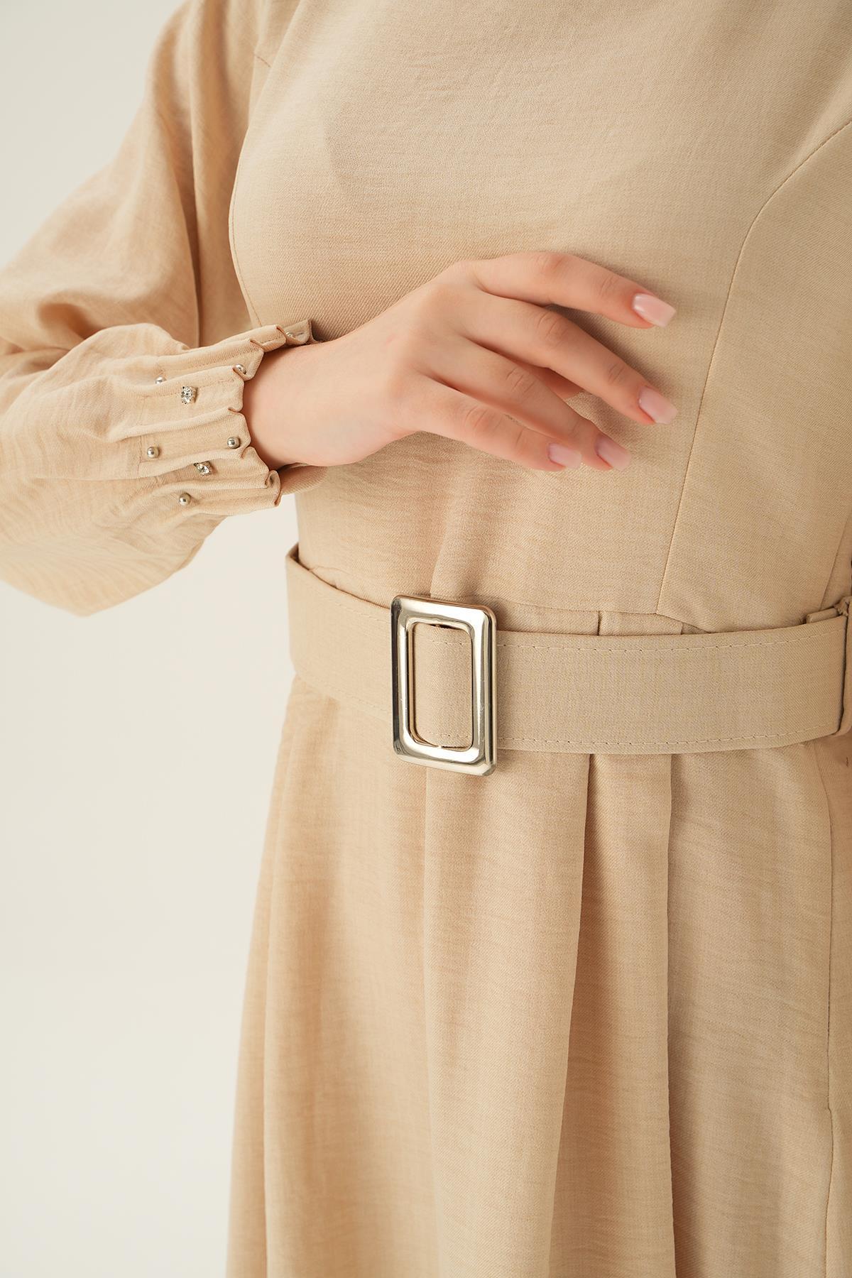 Bej Kol Drape Detay Kemerli Elbise 2659
