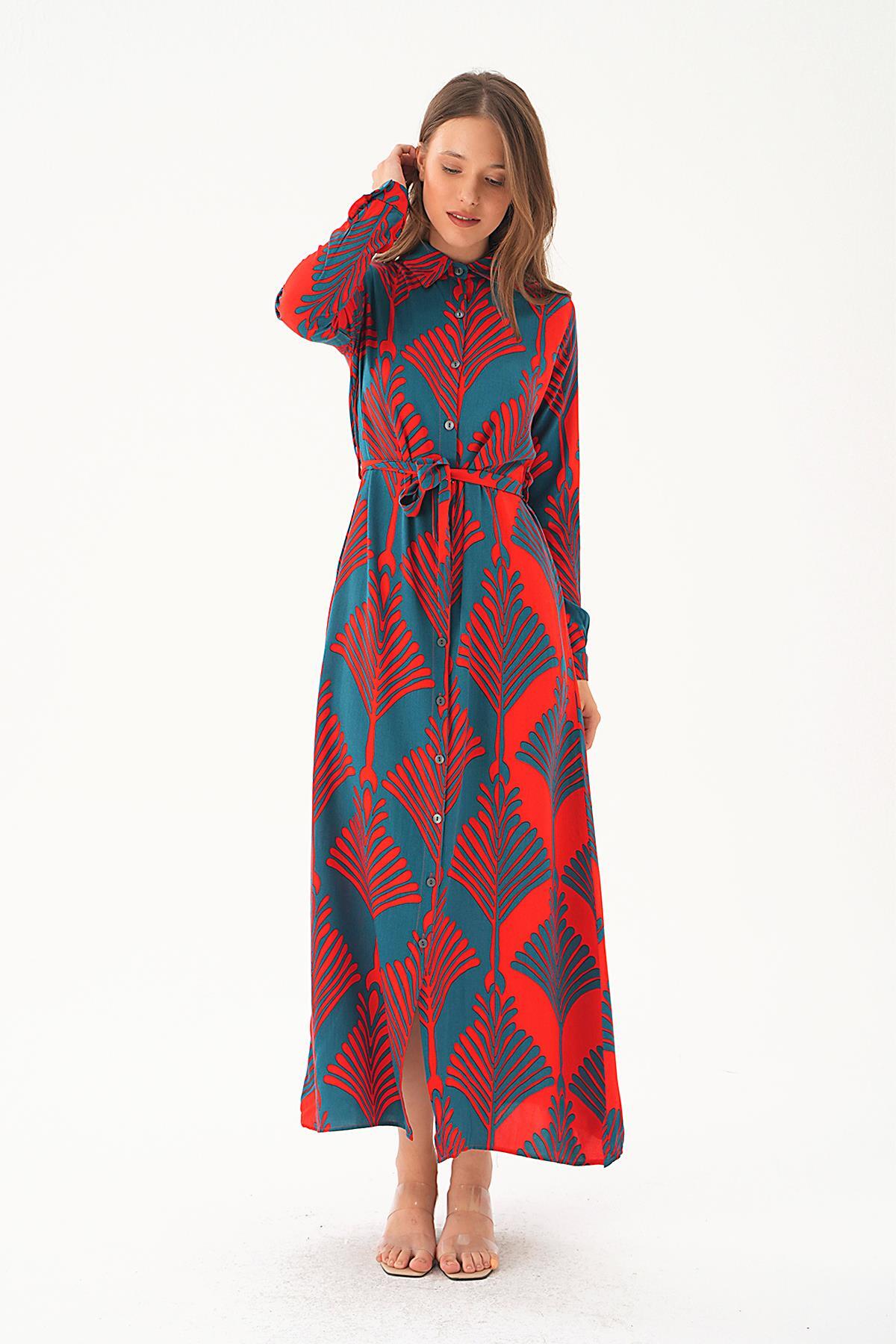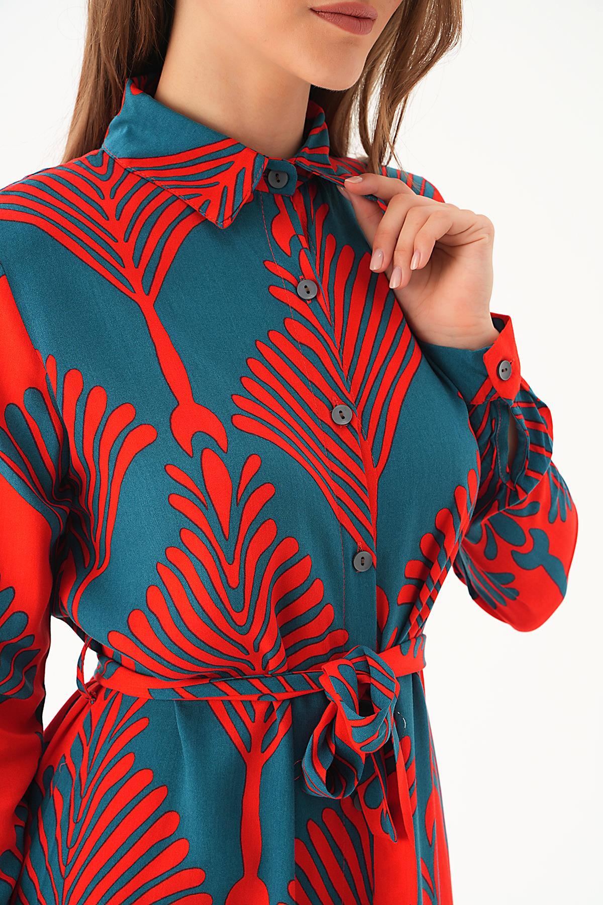 Nefti-Kırmızı Bel Bağlama Detay Desenli Elbise 2683