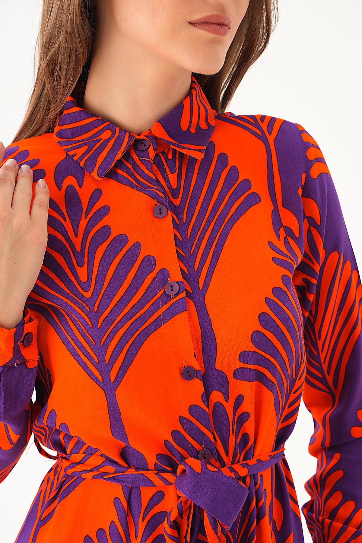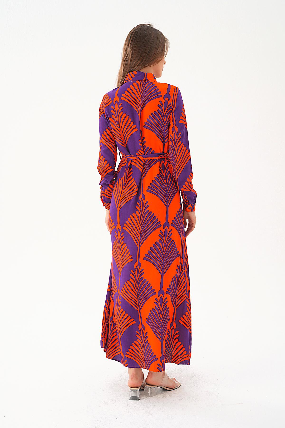 2683 Bel Bağlama Detay Desenli Elbise Orange-Mor