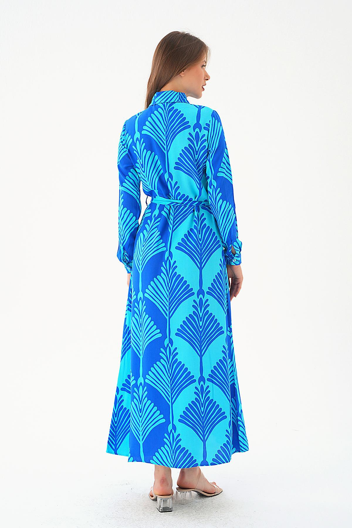 2683 Bel Bağlama Detay Desenli Elbise Turkuaz