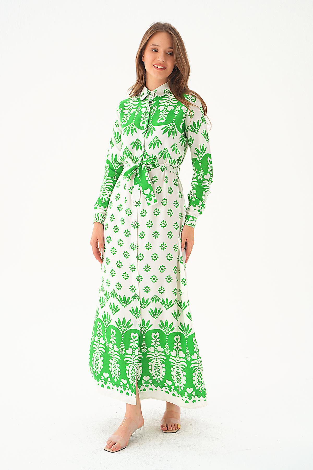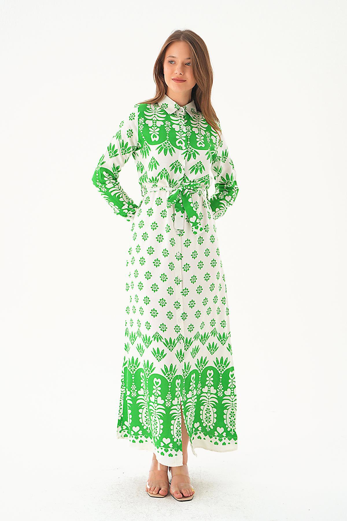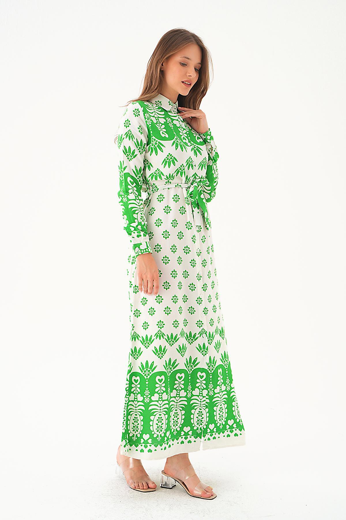Yeşil Bel Bağlama Detay Desenli Elbise 2683