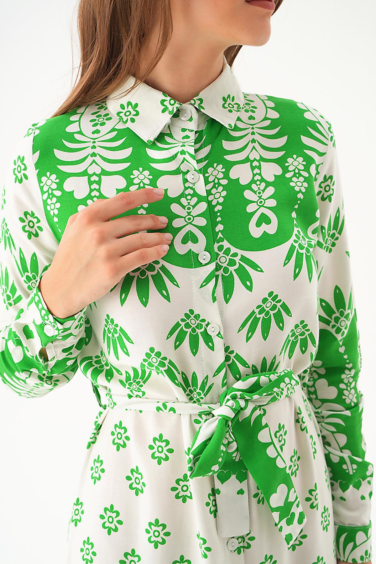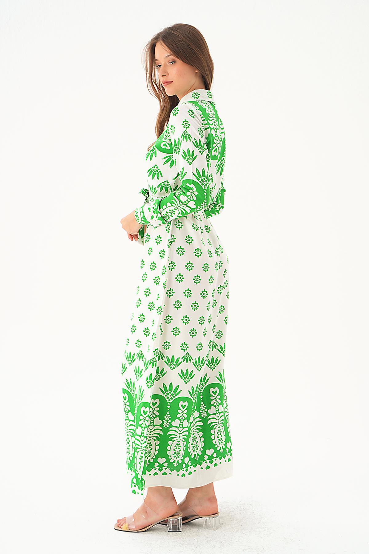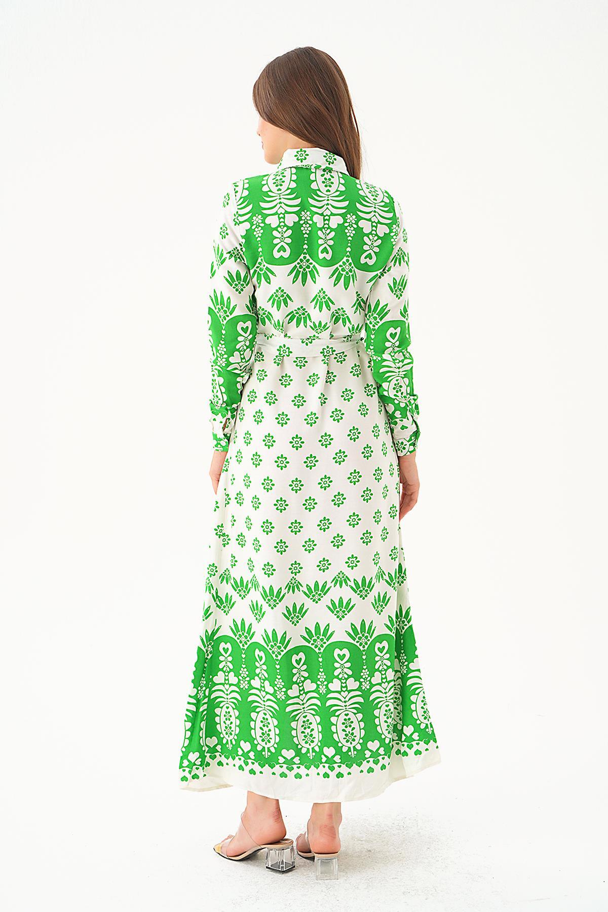 Yeşil Bel Bağlama Detay Desenli Elbise 2683