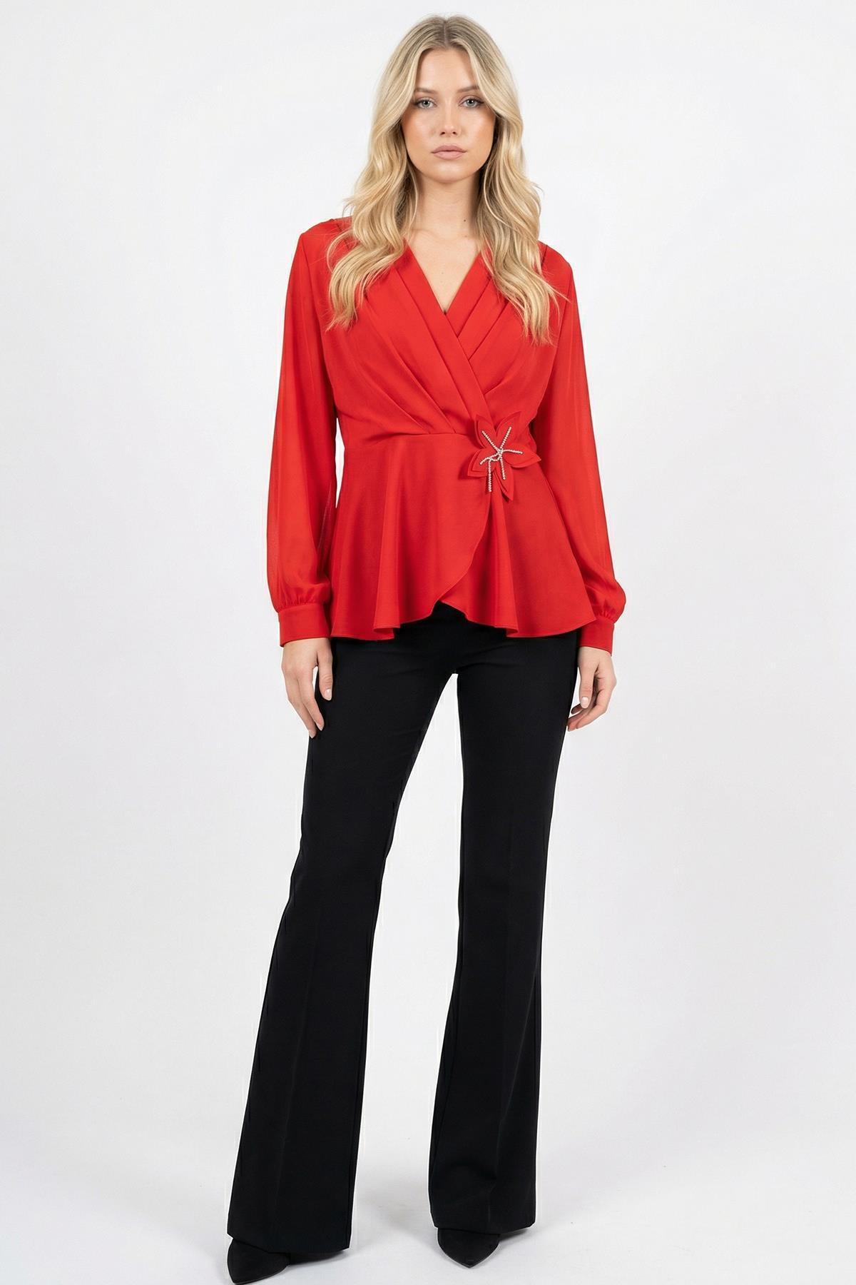 Kırmızı Pens Detay Çiçekli Bluz 2791