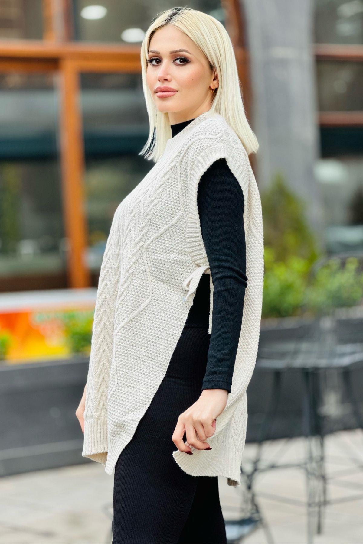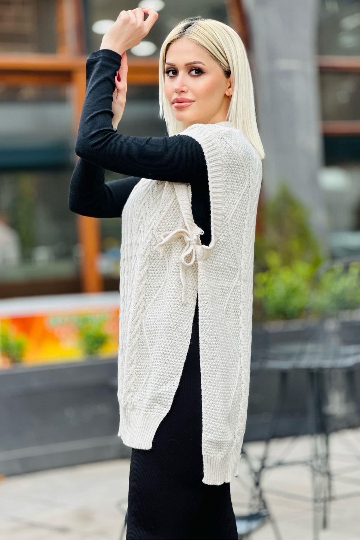 Krem Yan Bağlamalı Örgü Detay Süveter 280