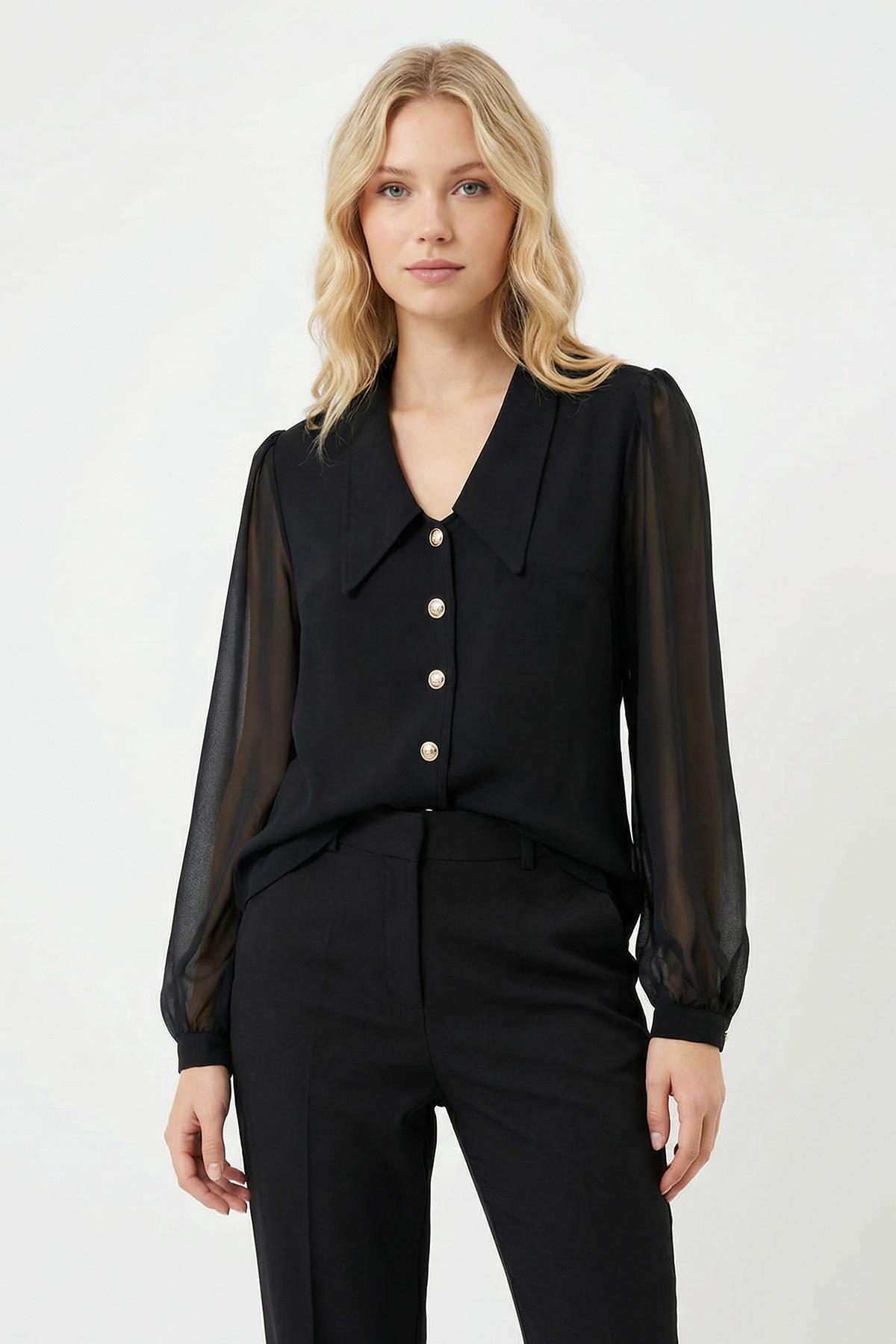 Siyah Düğmeli Tüllü Bluz 2832