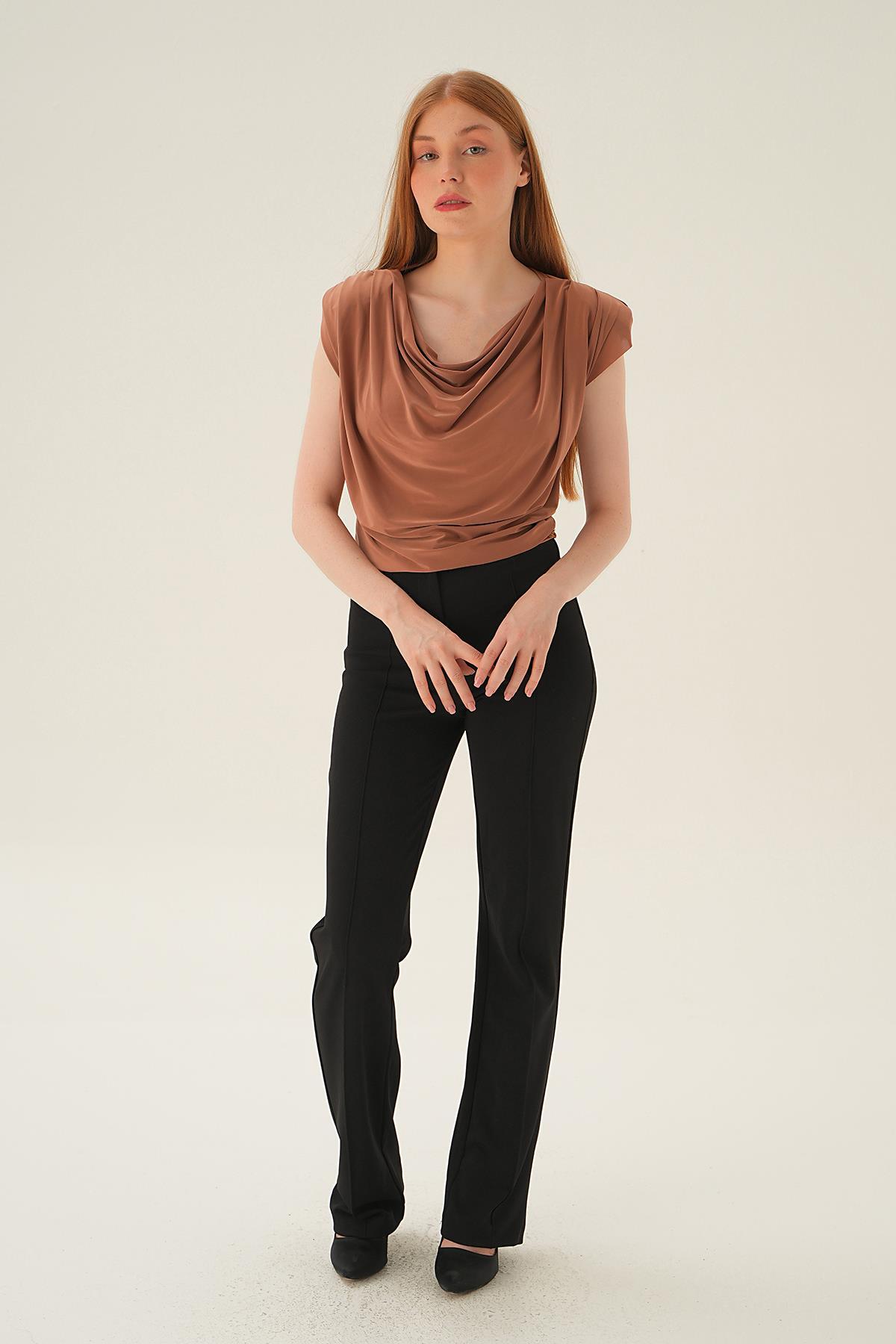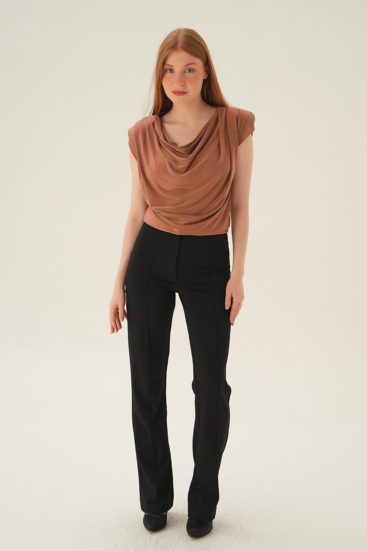 Kahve Bisiklet Yaka Uzun Kol Düğmeli Bluz 8492A