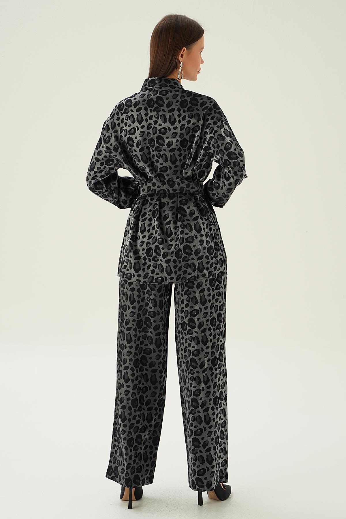 Siyah Leopar Desen Pantolon Takım 3001