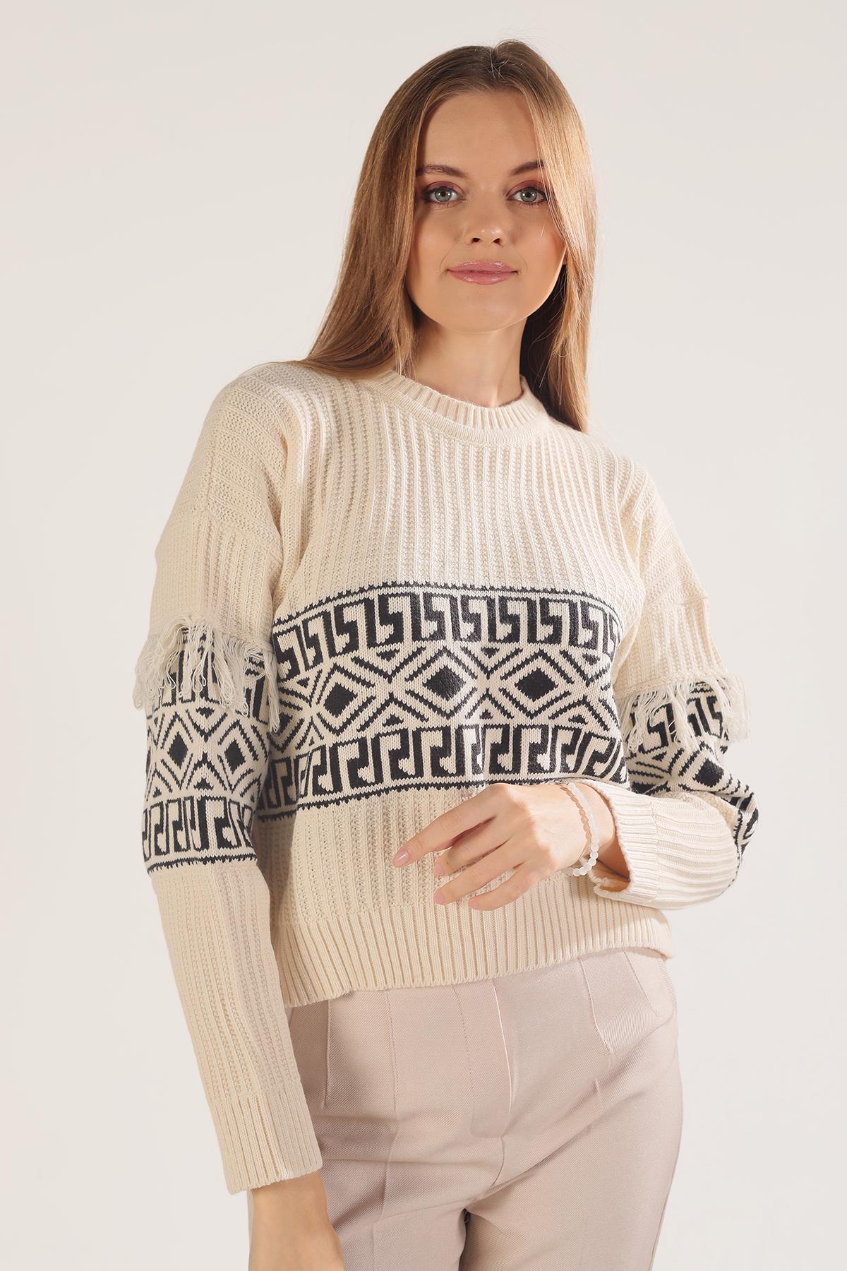 3002 Kol Püskül Detay Desenli Kazak Ekru