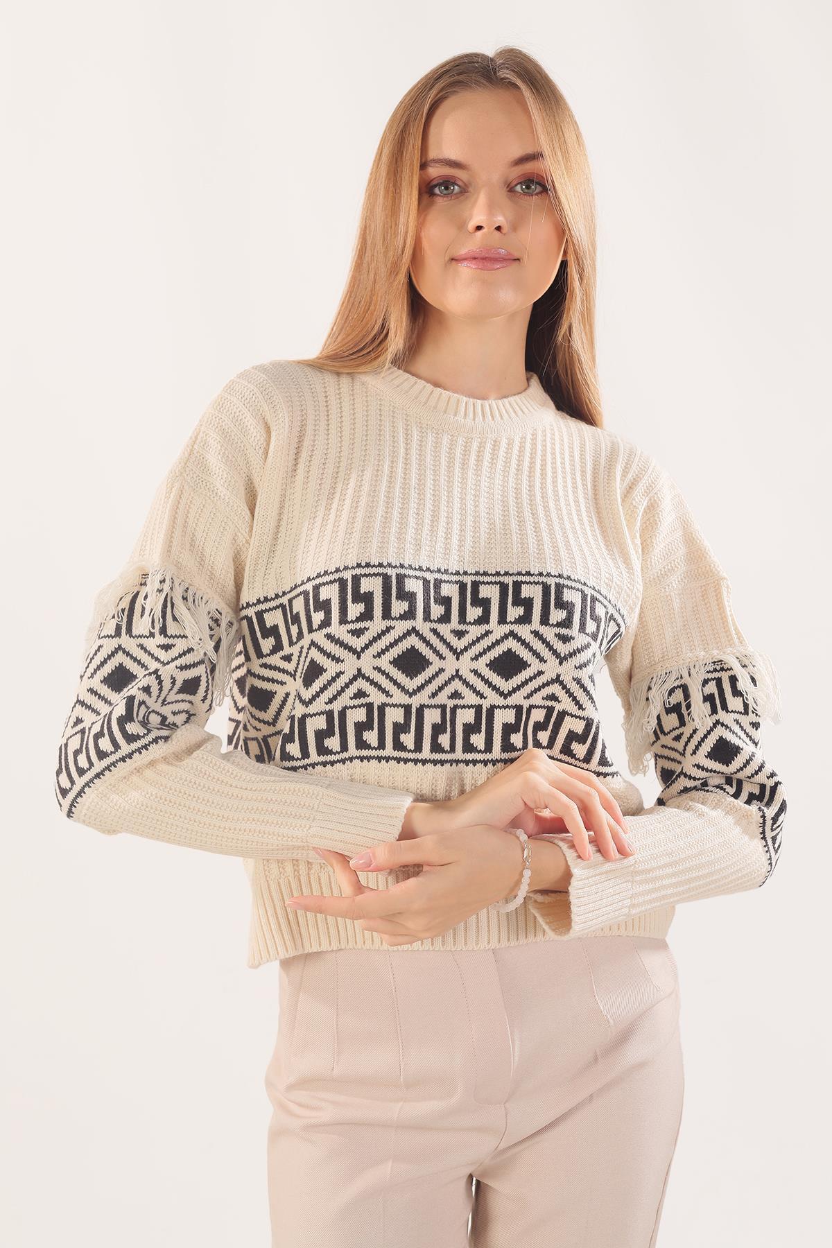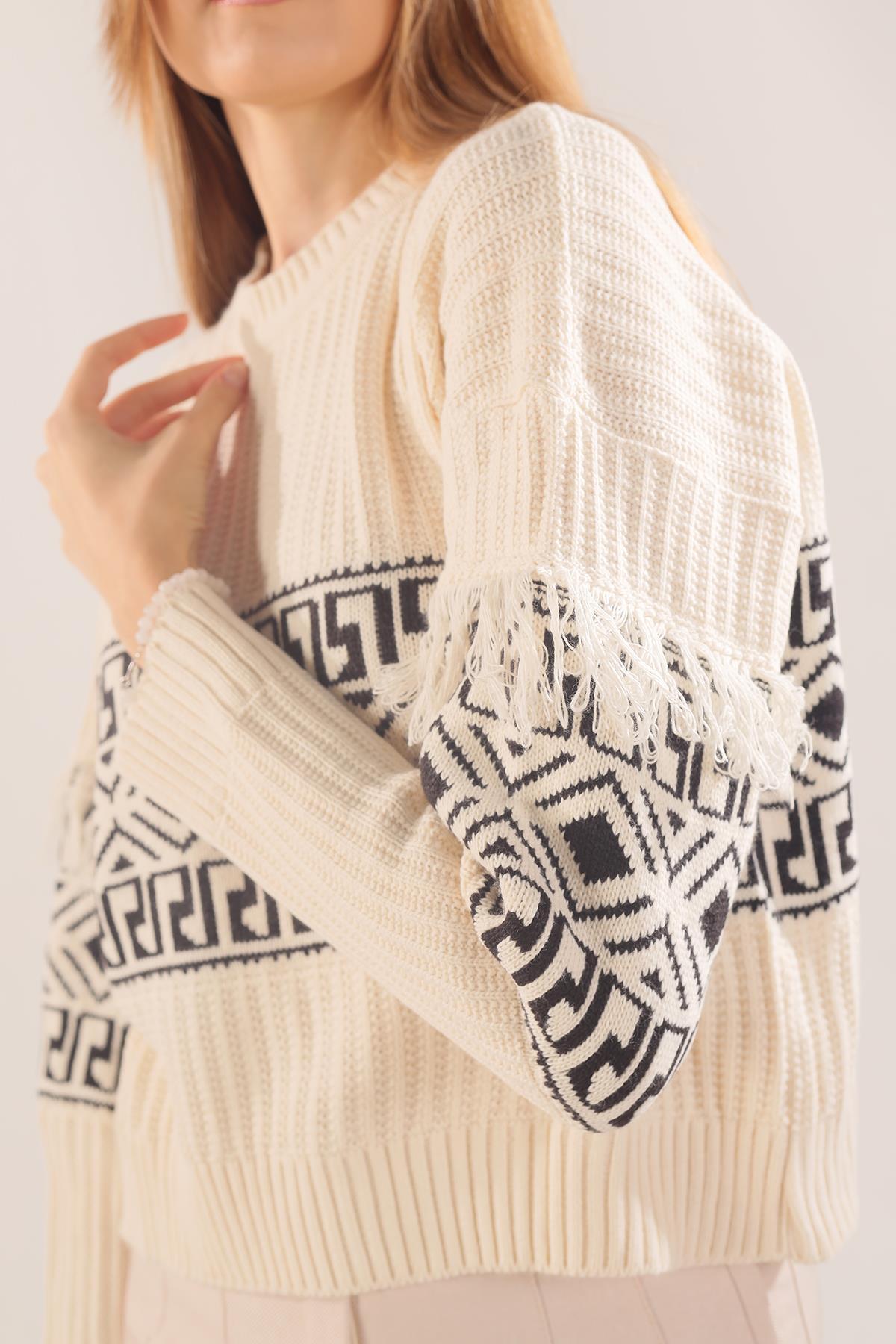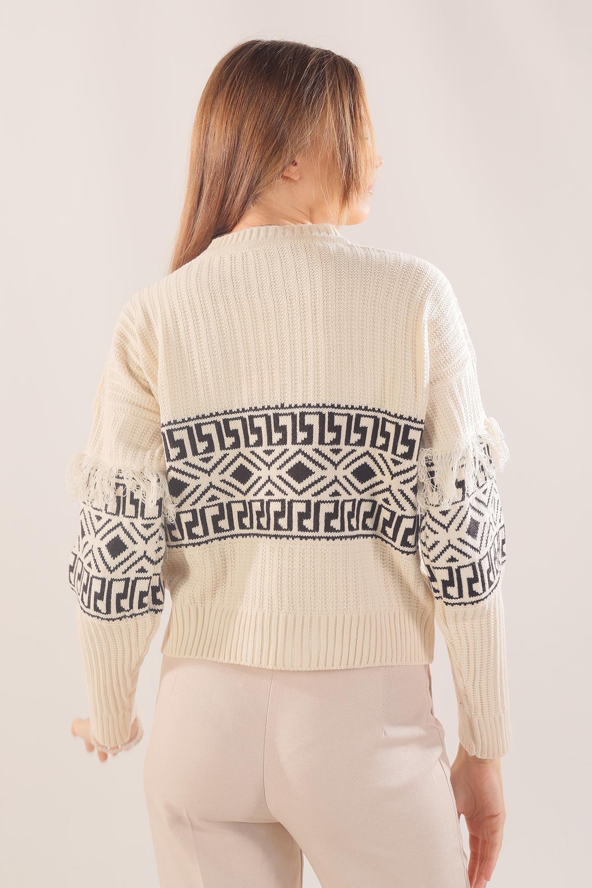 Ekru Kol Püskül Detay Desenli Kazak 3002