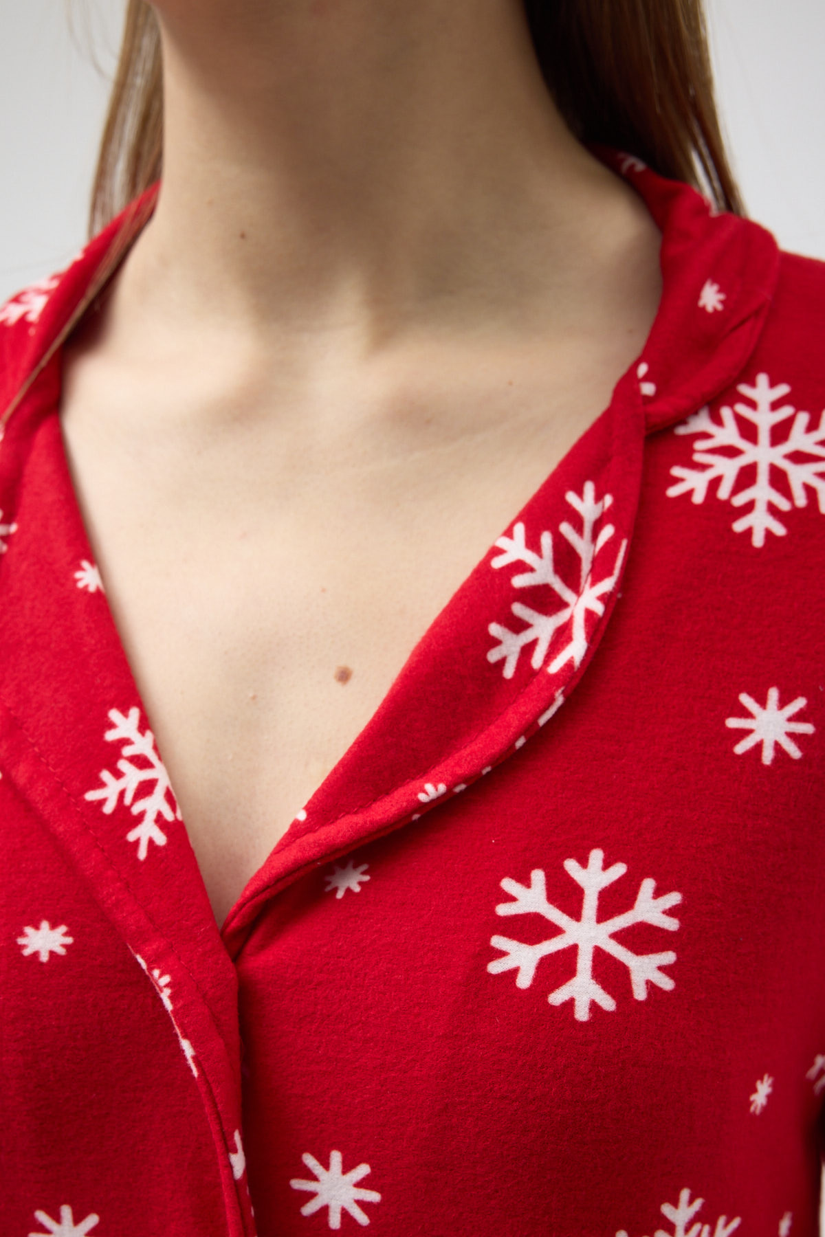 Kırmızı Kar Tanesi Desenli Düğmeli Kadın Pijama Takımı 3005