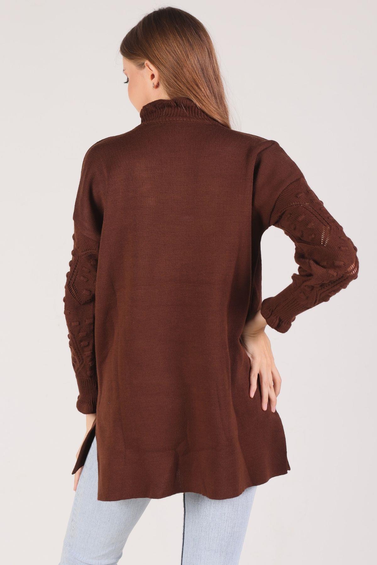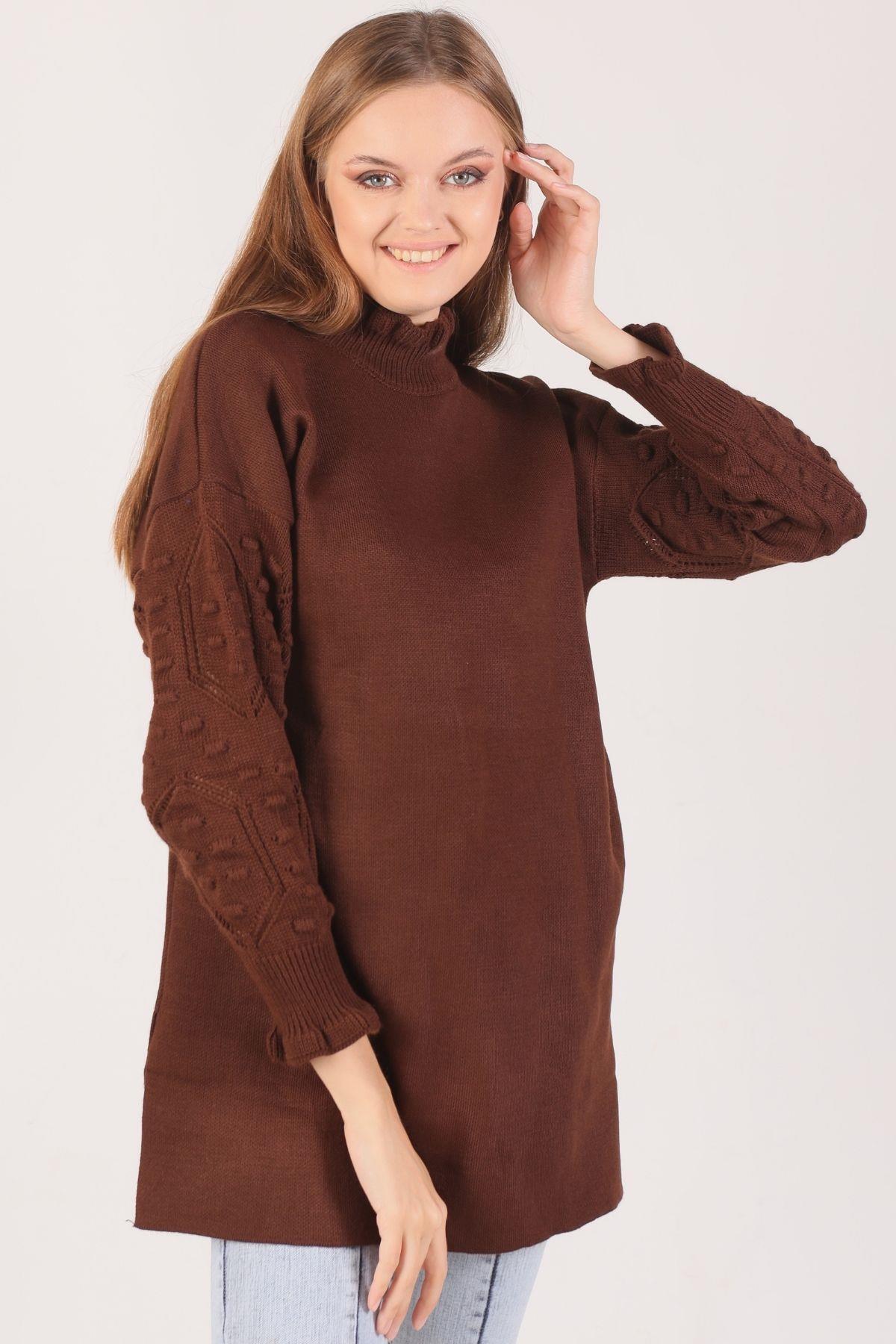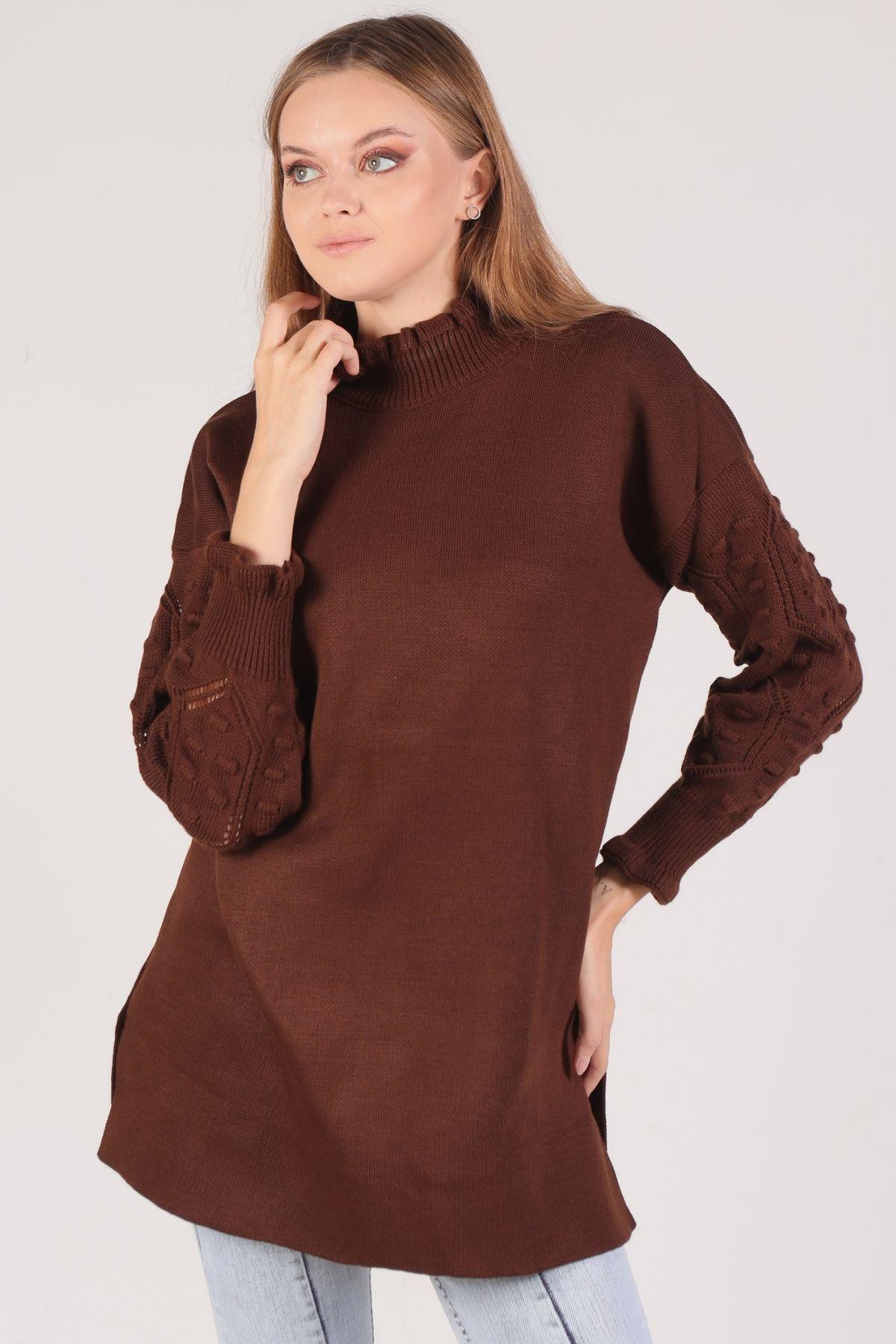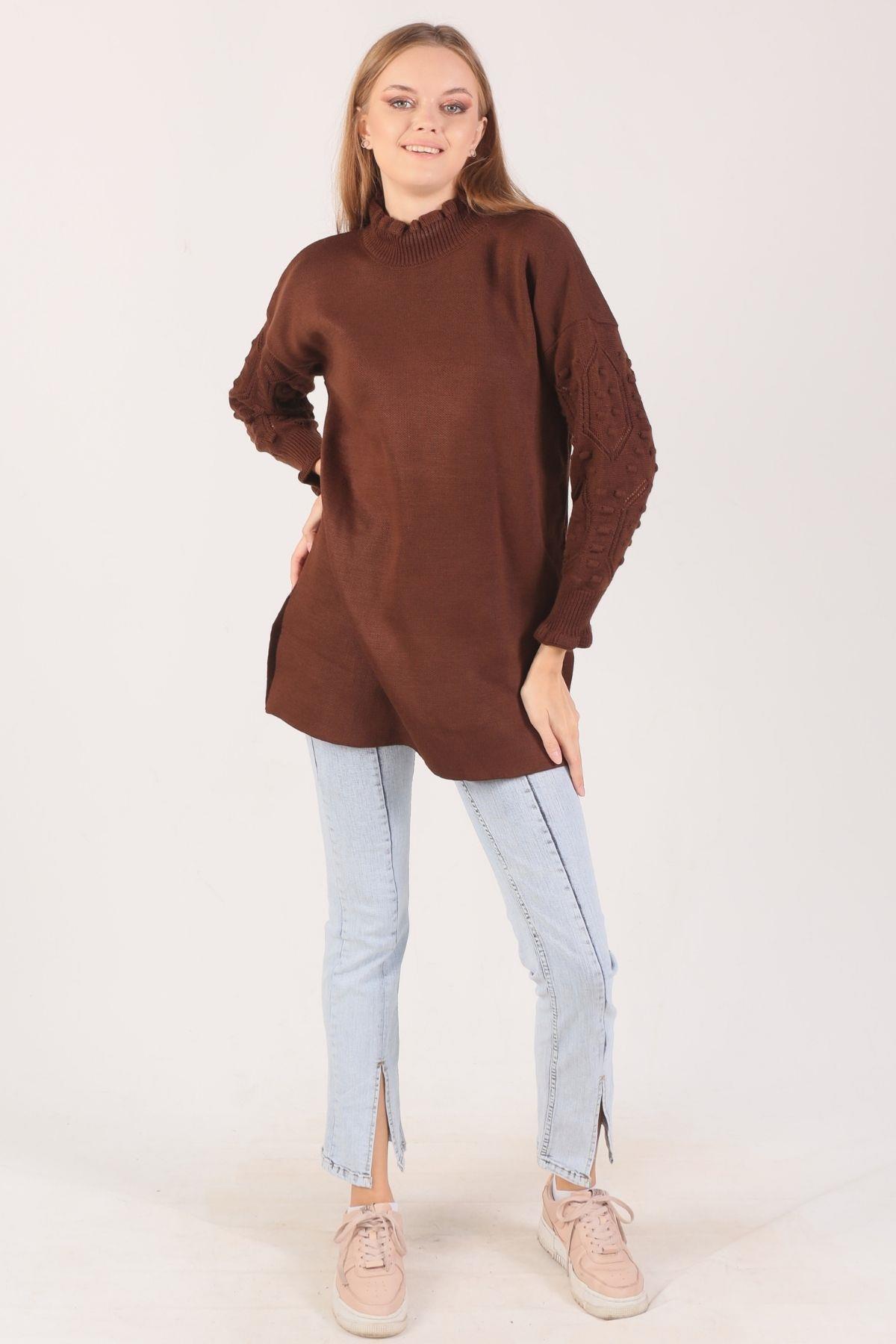 Acı Kahve Yaka Fırfır Kol İşlemeli Kazak 3008