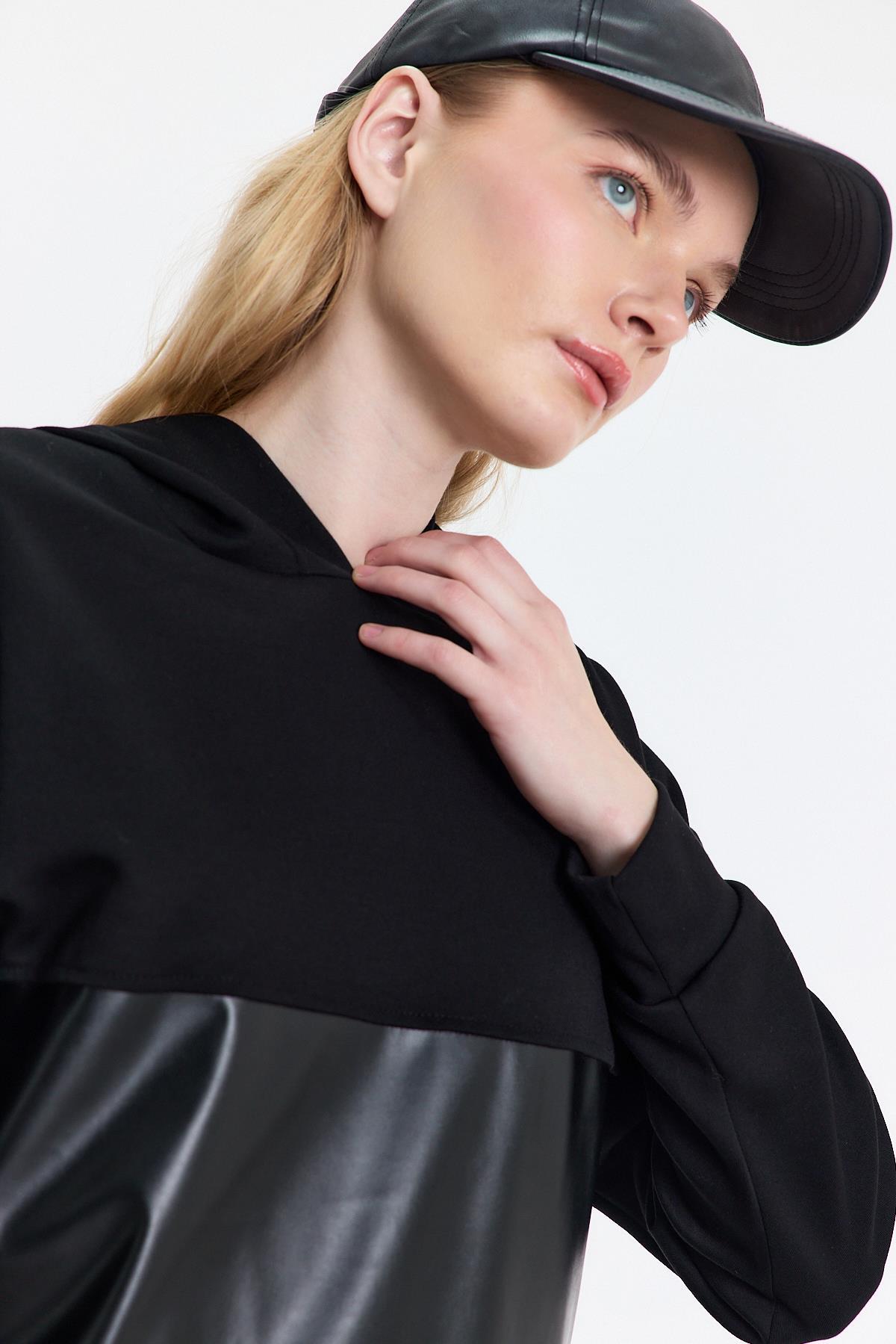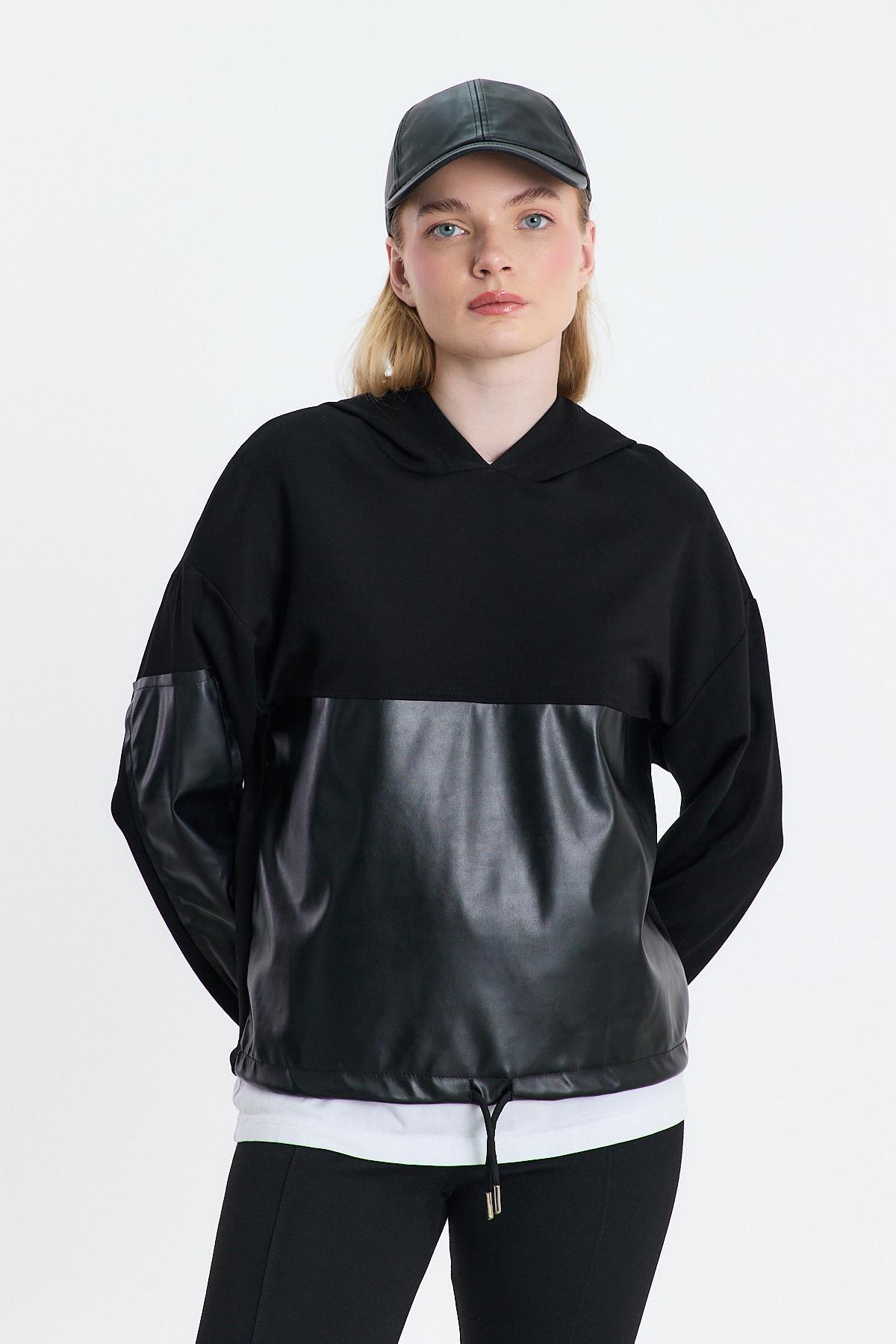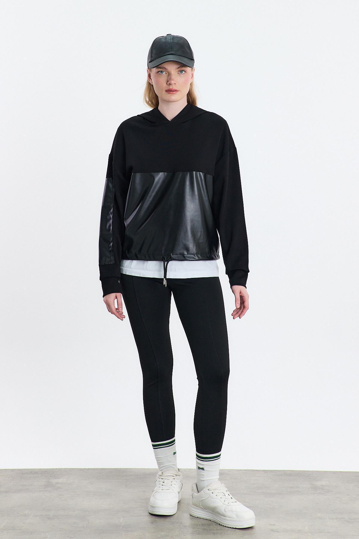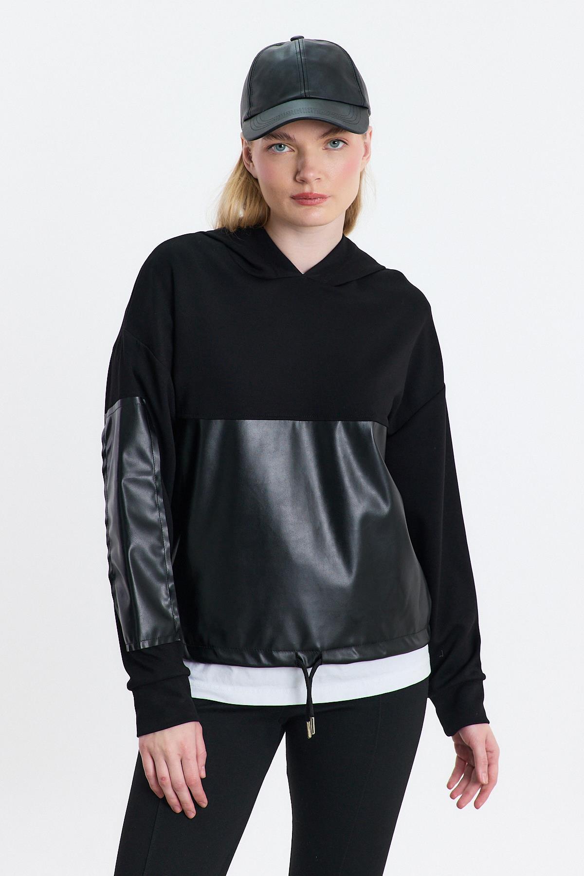 3012 Kapüşonlu Deri Detay Sweat Siyah