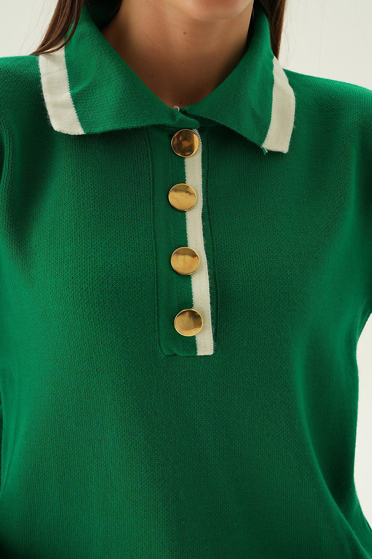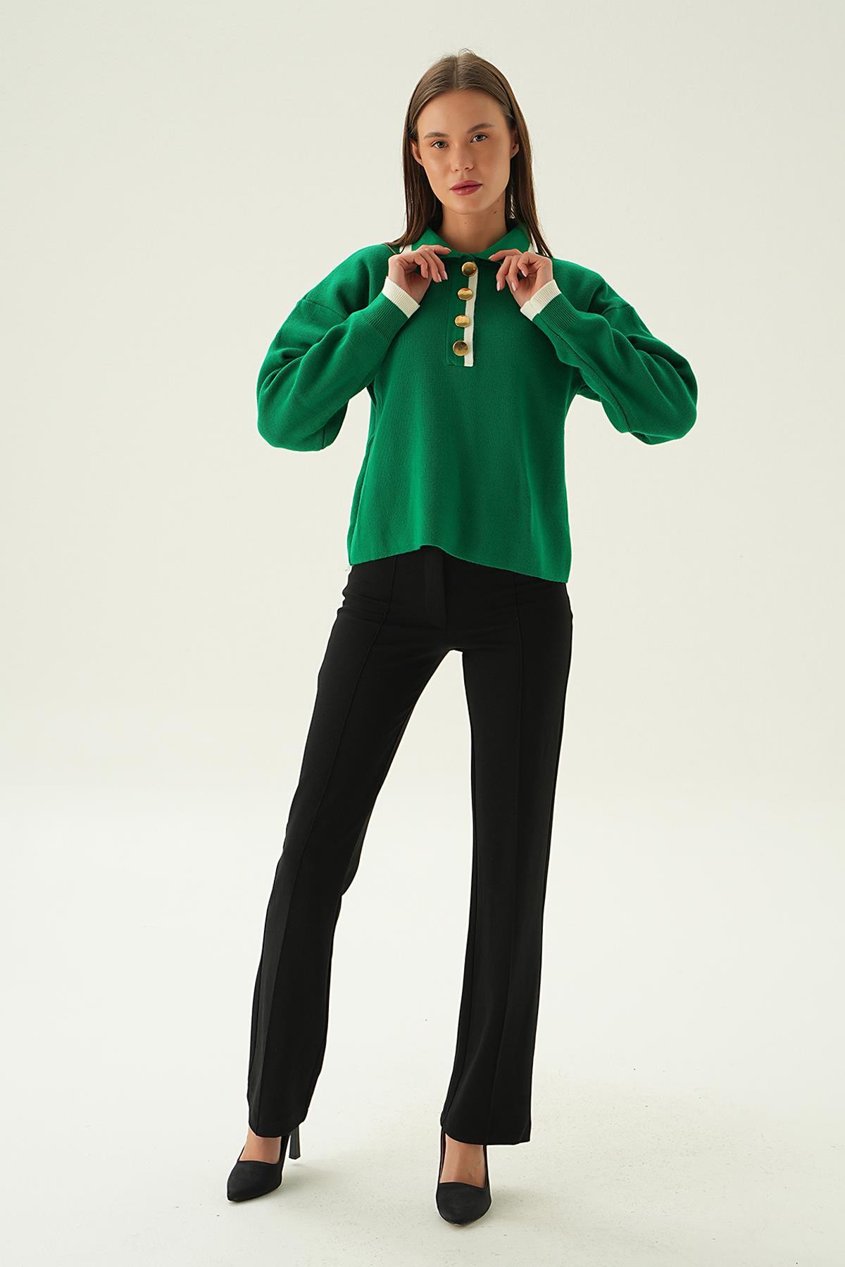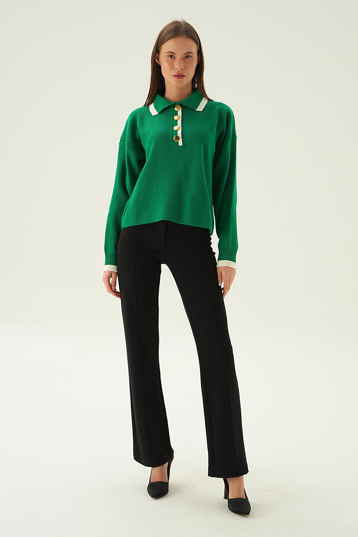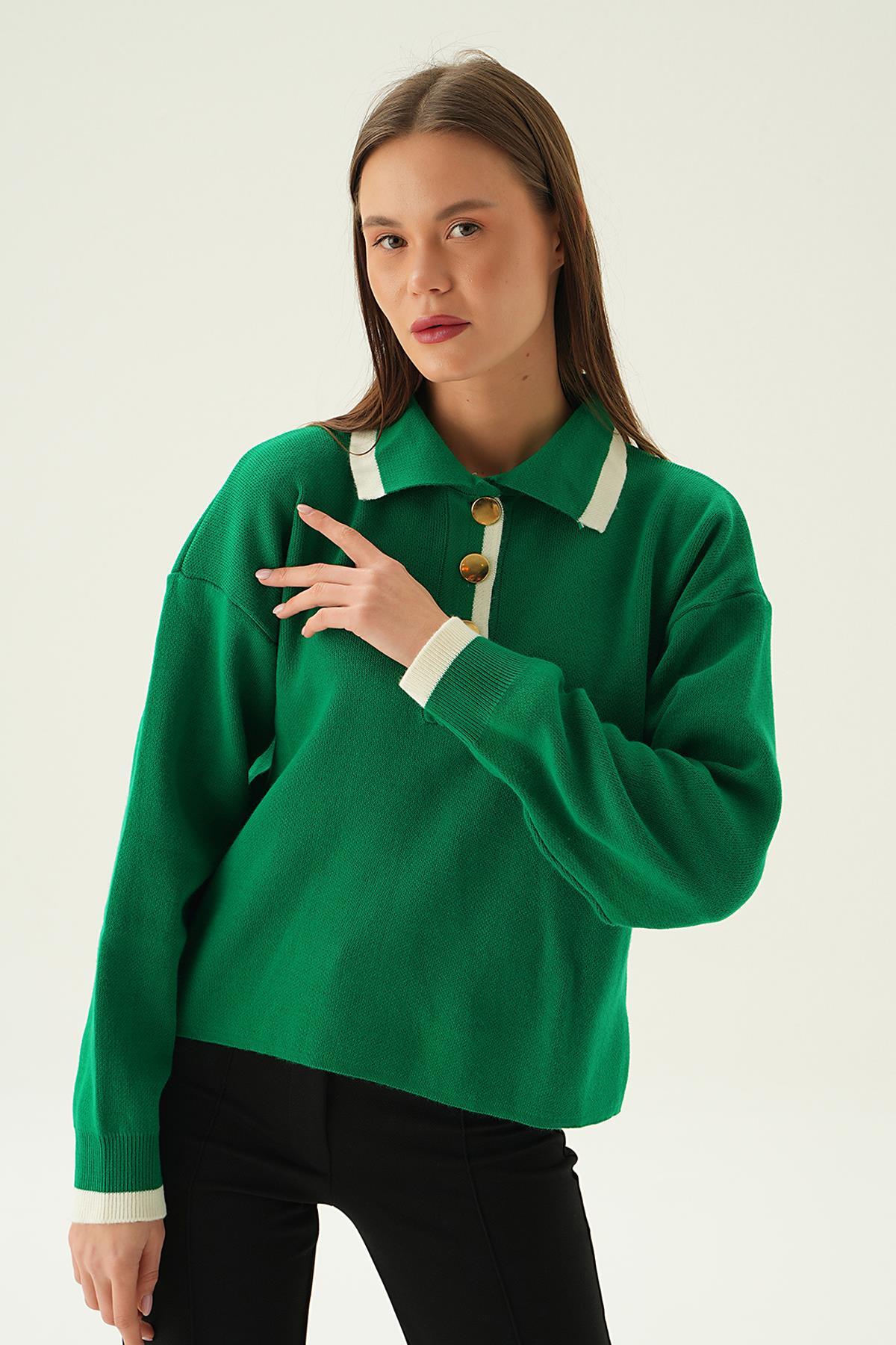 Benetton Yeşili Gömlek Yaka Şerit Detay Kazak 3033