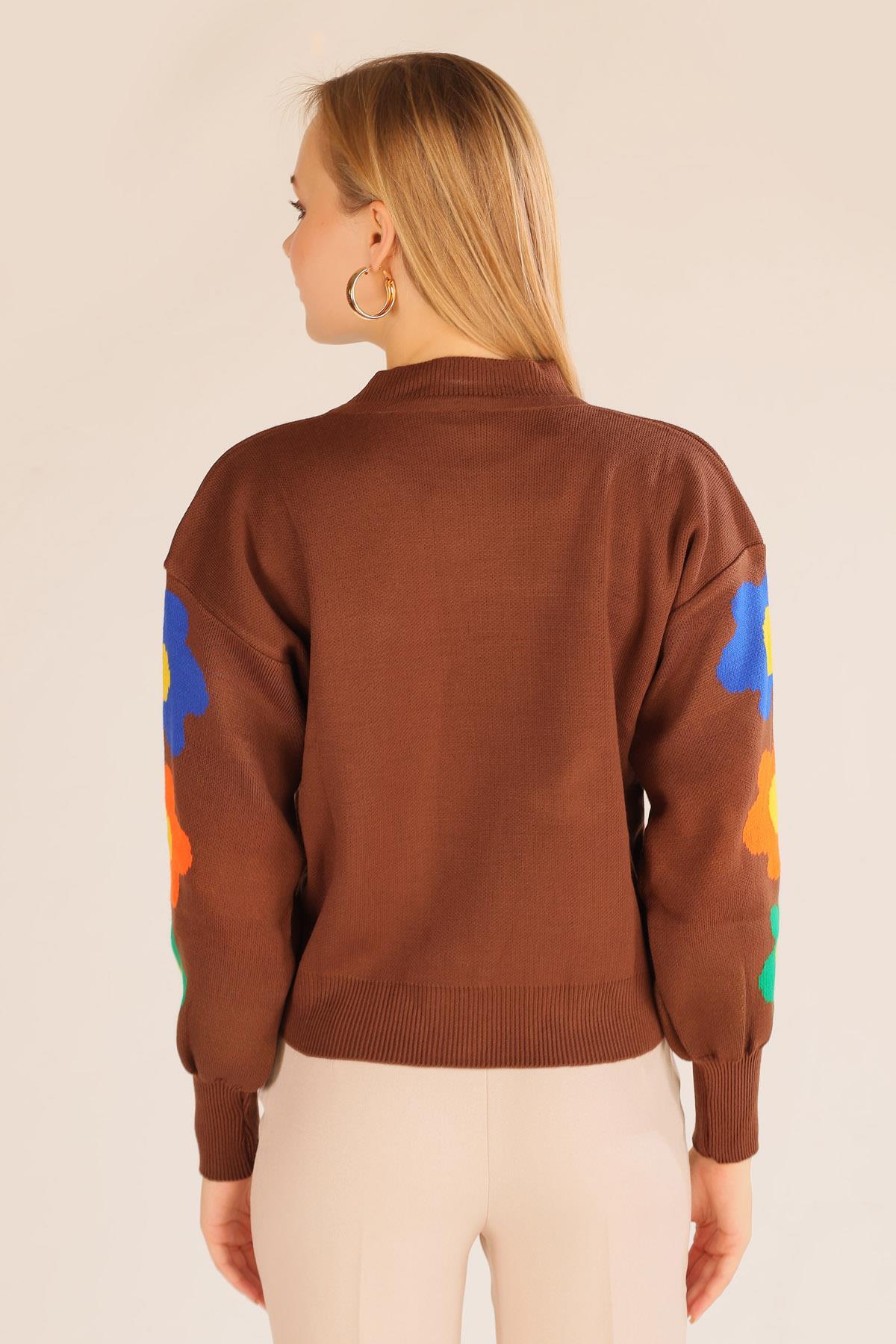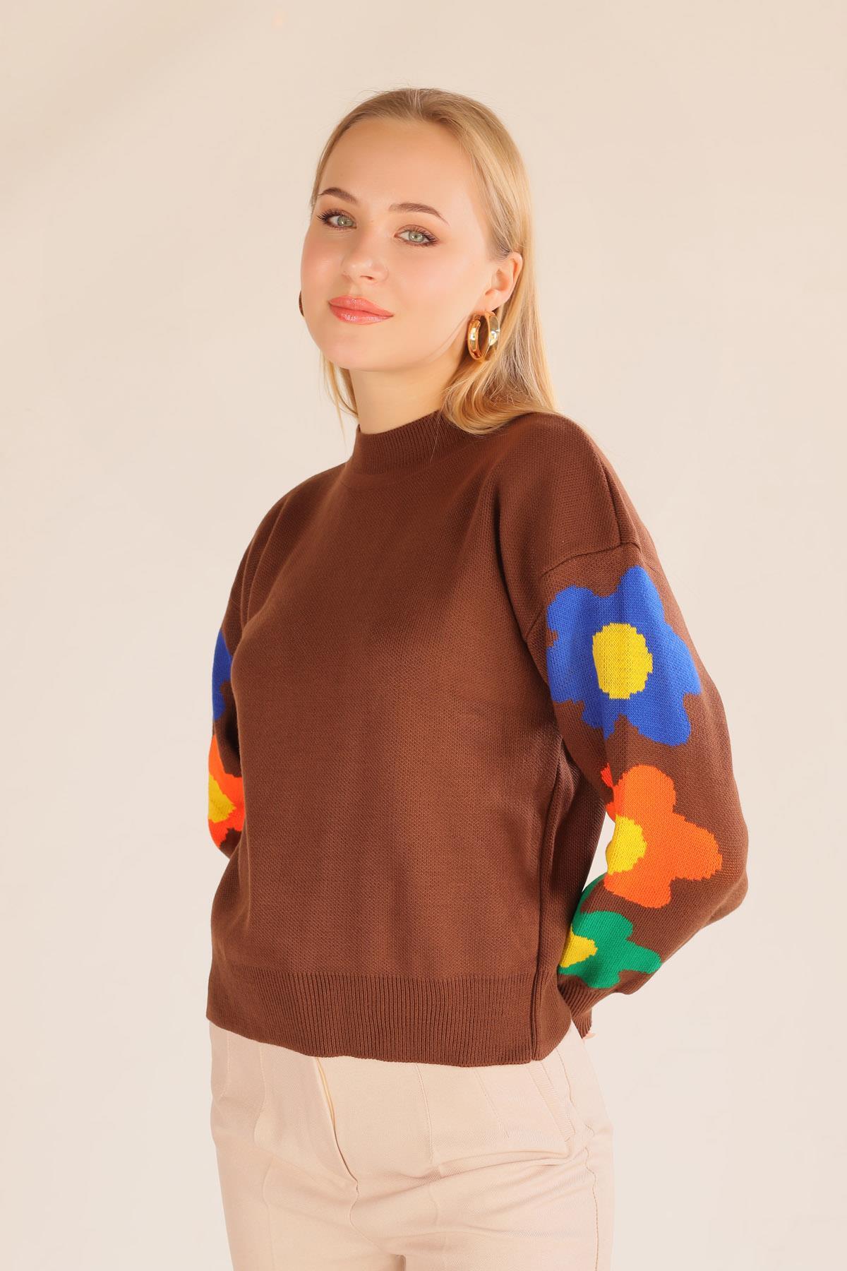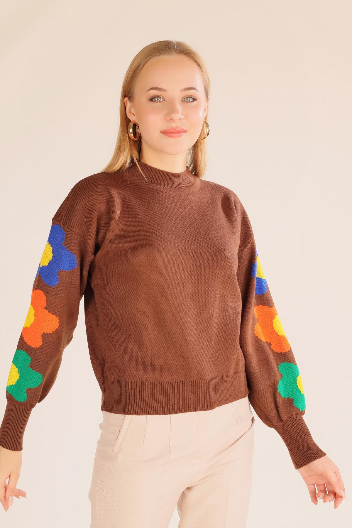 Kahve Kol Çiçek Desen Kazak 3018