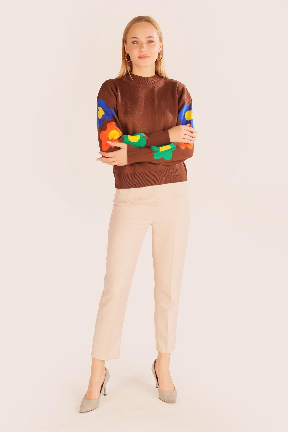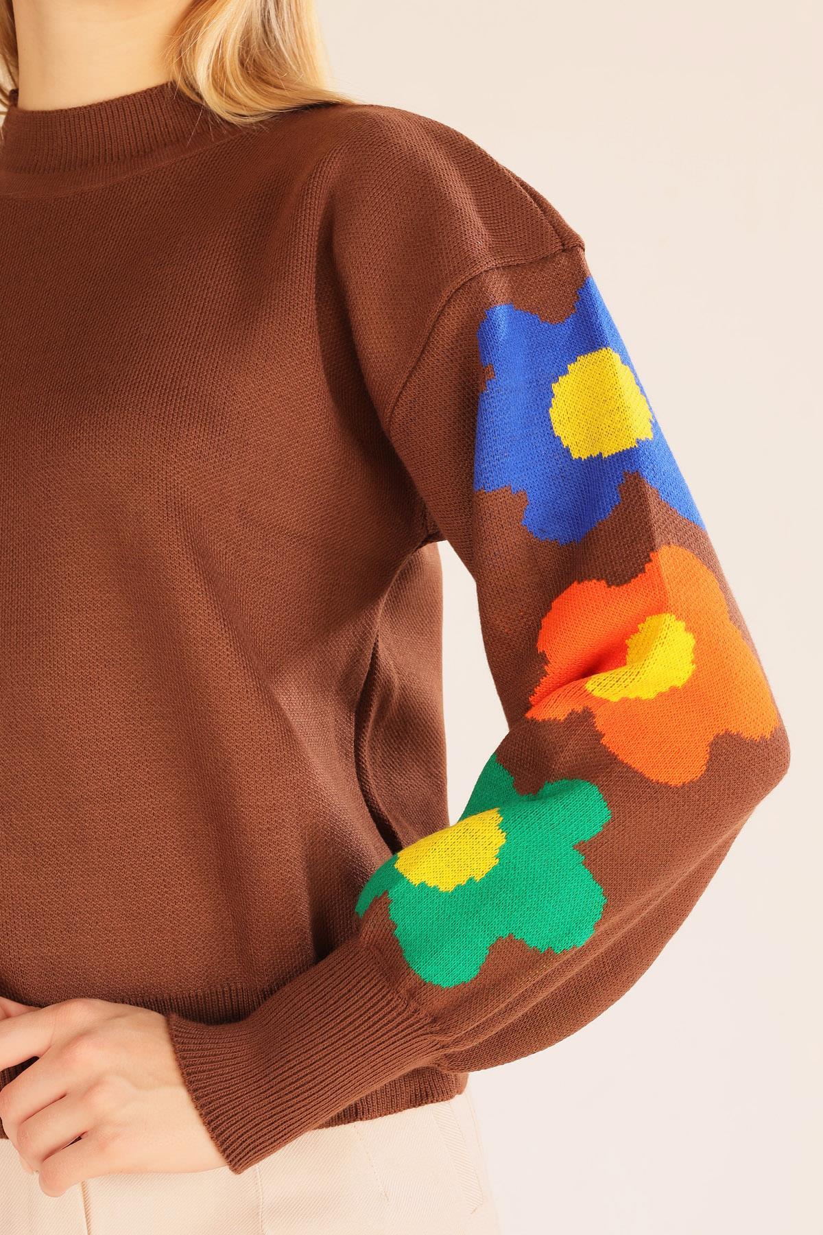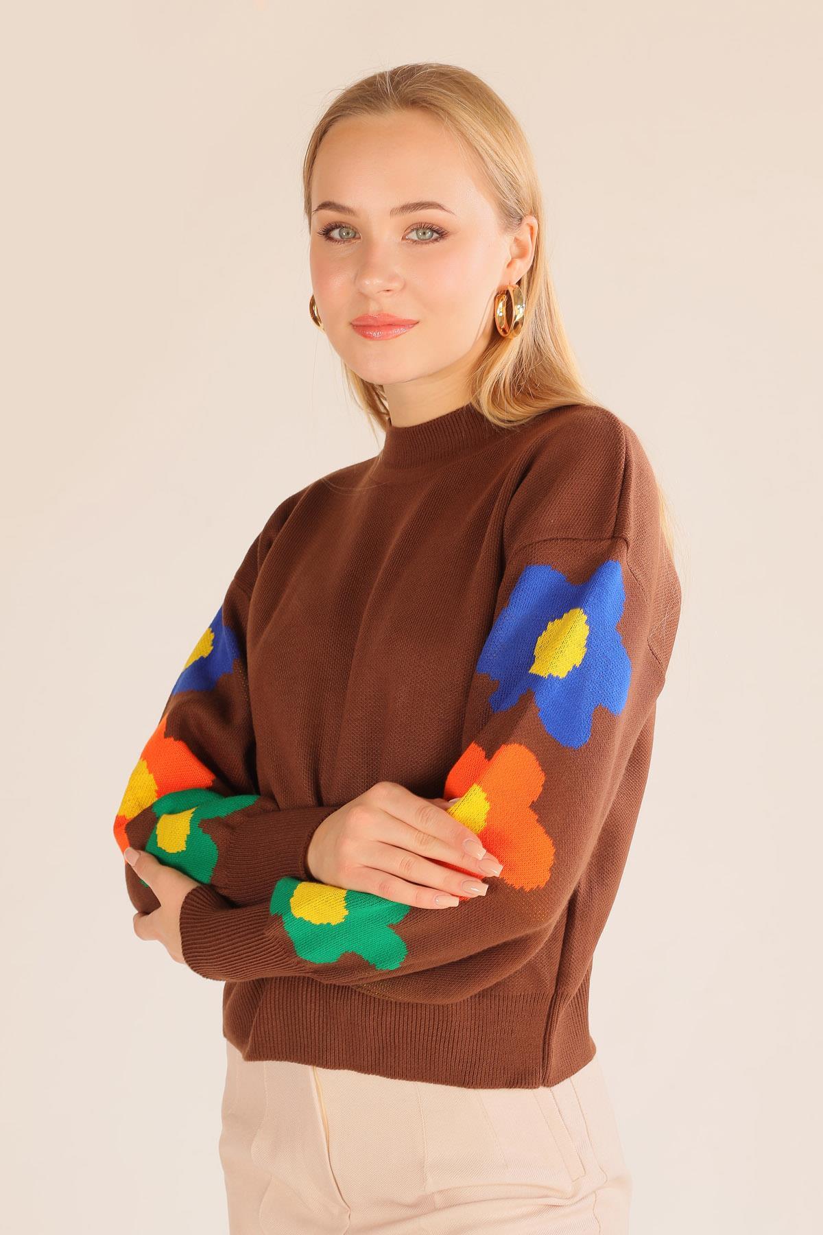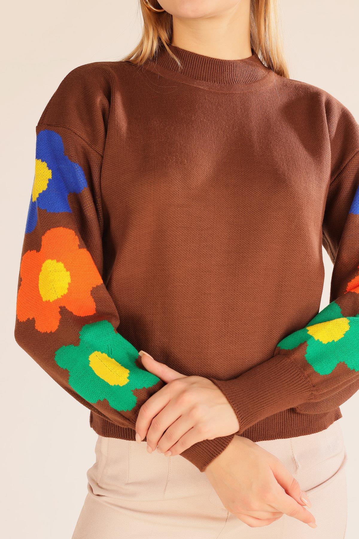 Kahve Kol Çiçek Desen Kazak 3018
