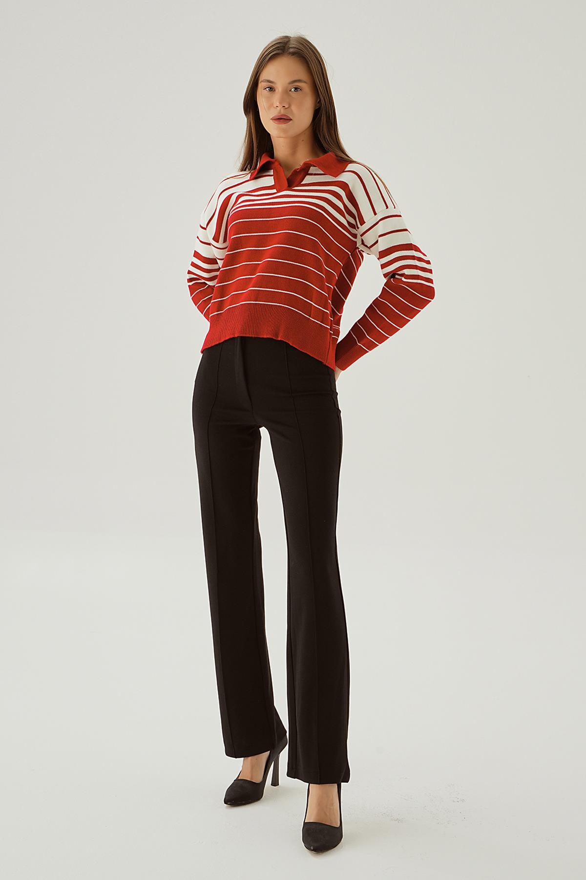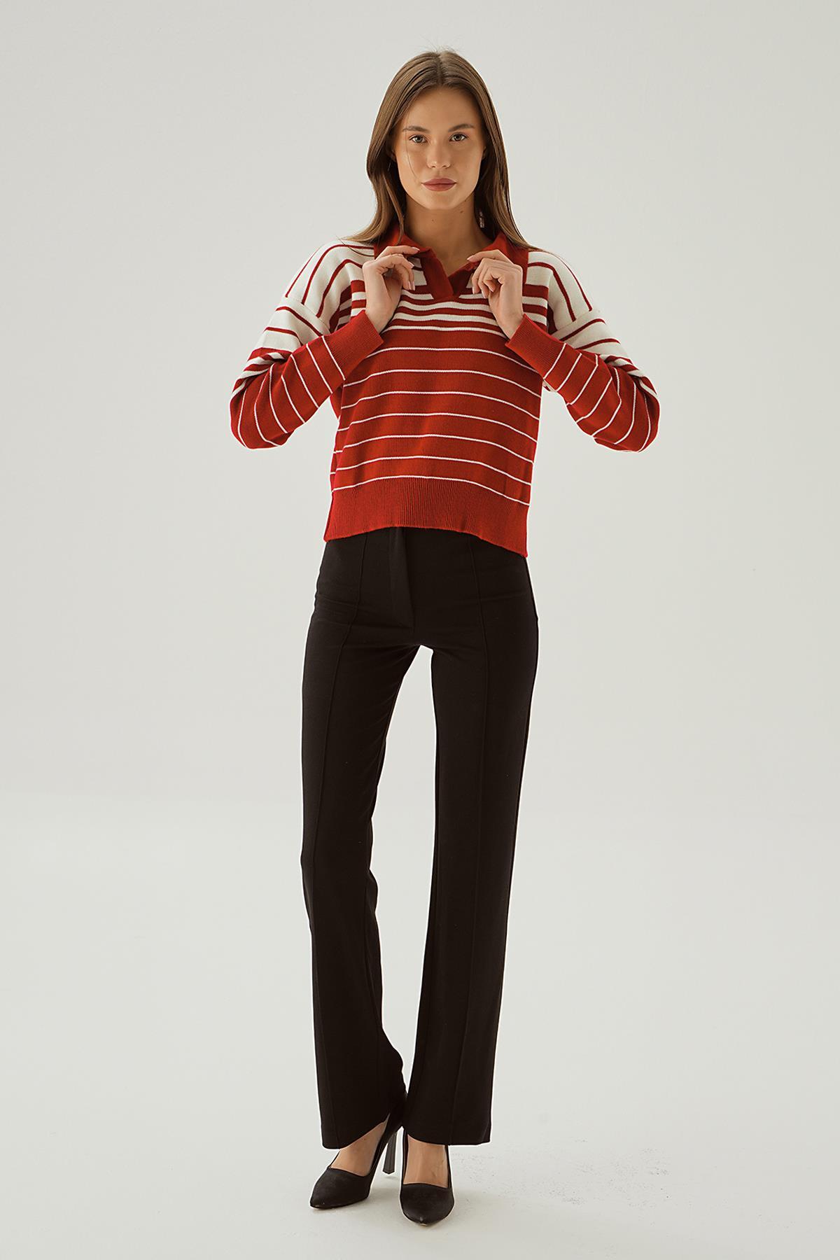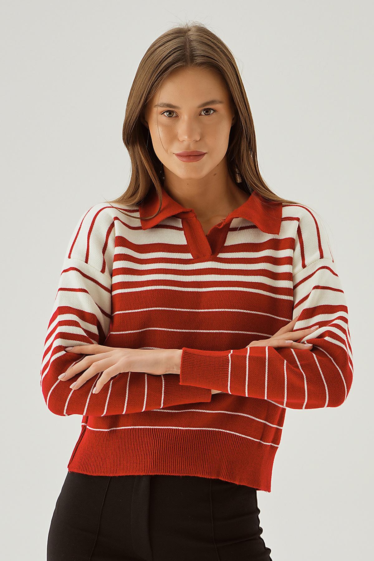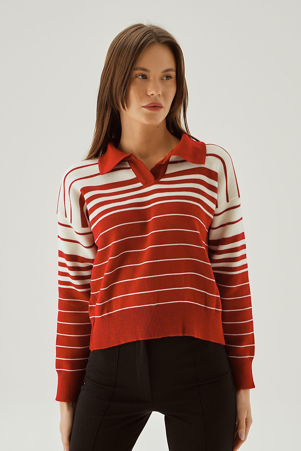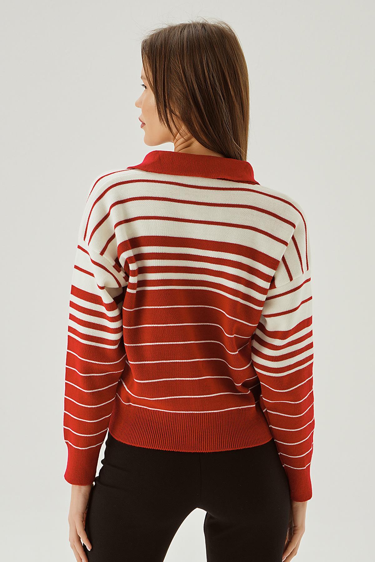 Kırmızı Polo Yaka Çizgili Kazak 3020