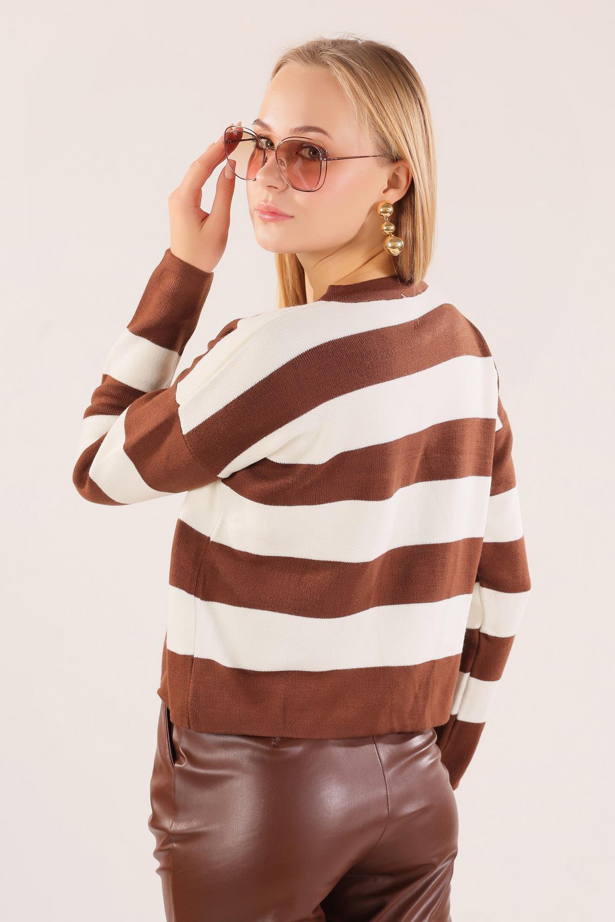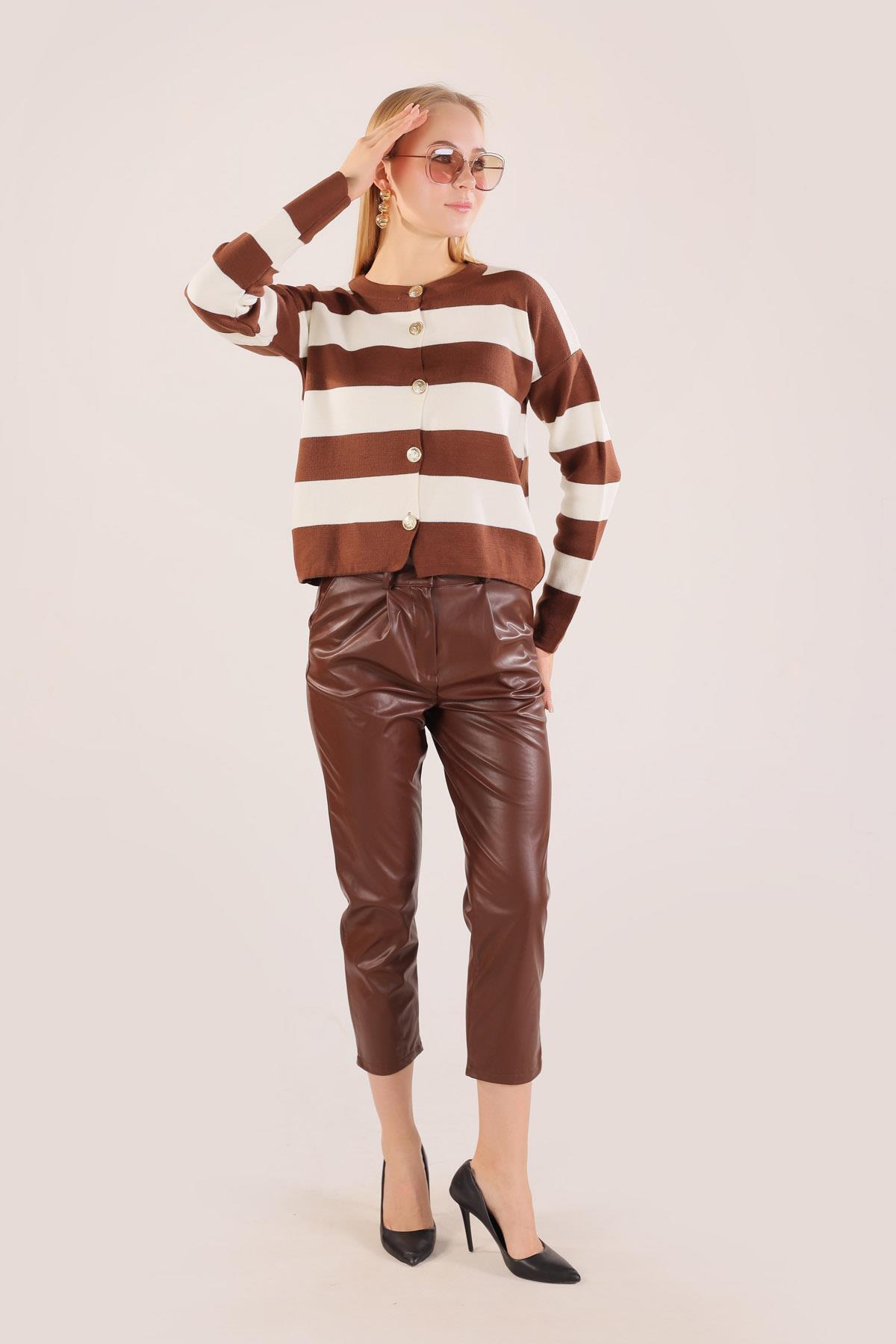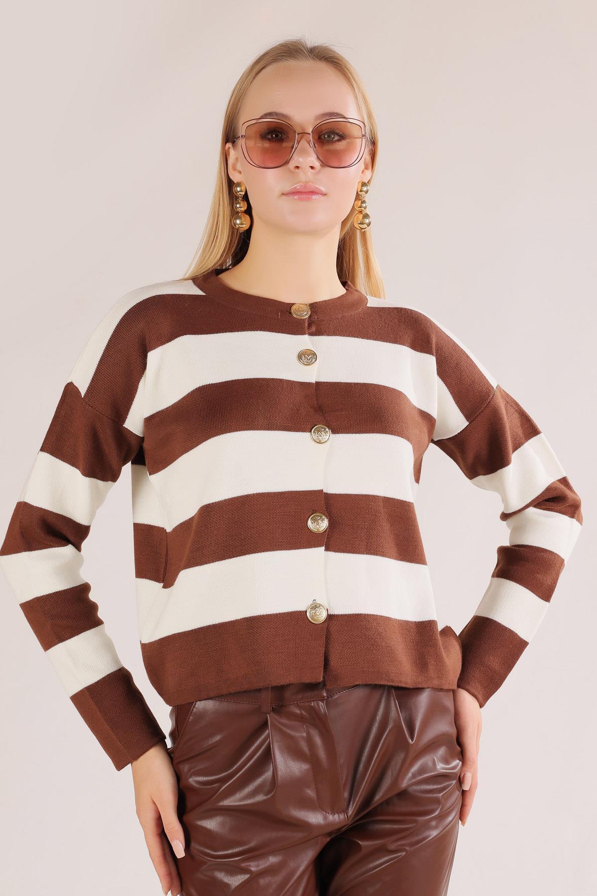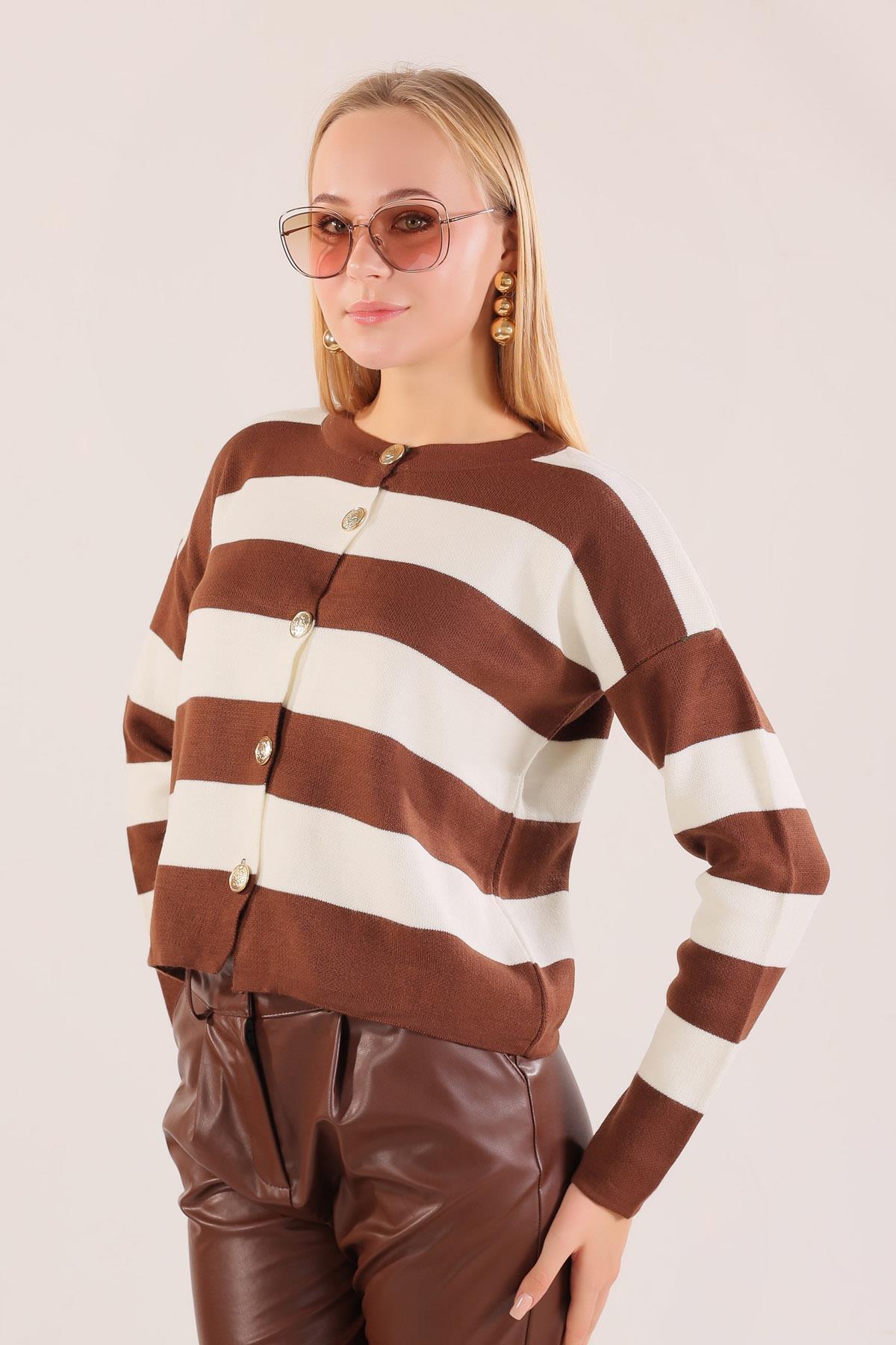 Kahve Düğmeli Çizgili Hırka 3025