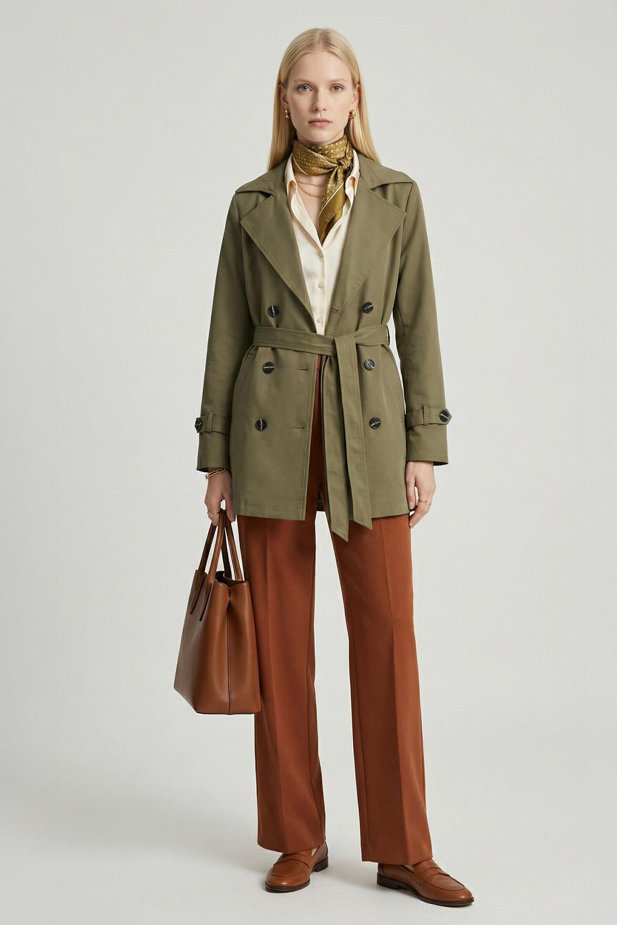 Haki Bel Bağlamalı Kısa Trençkot 3036A