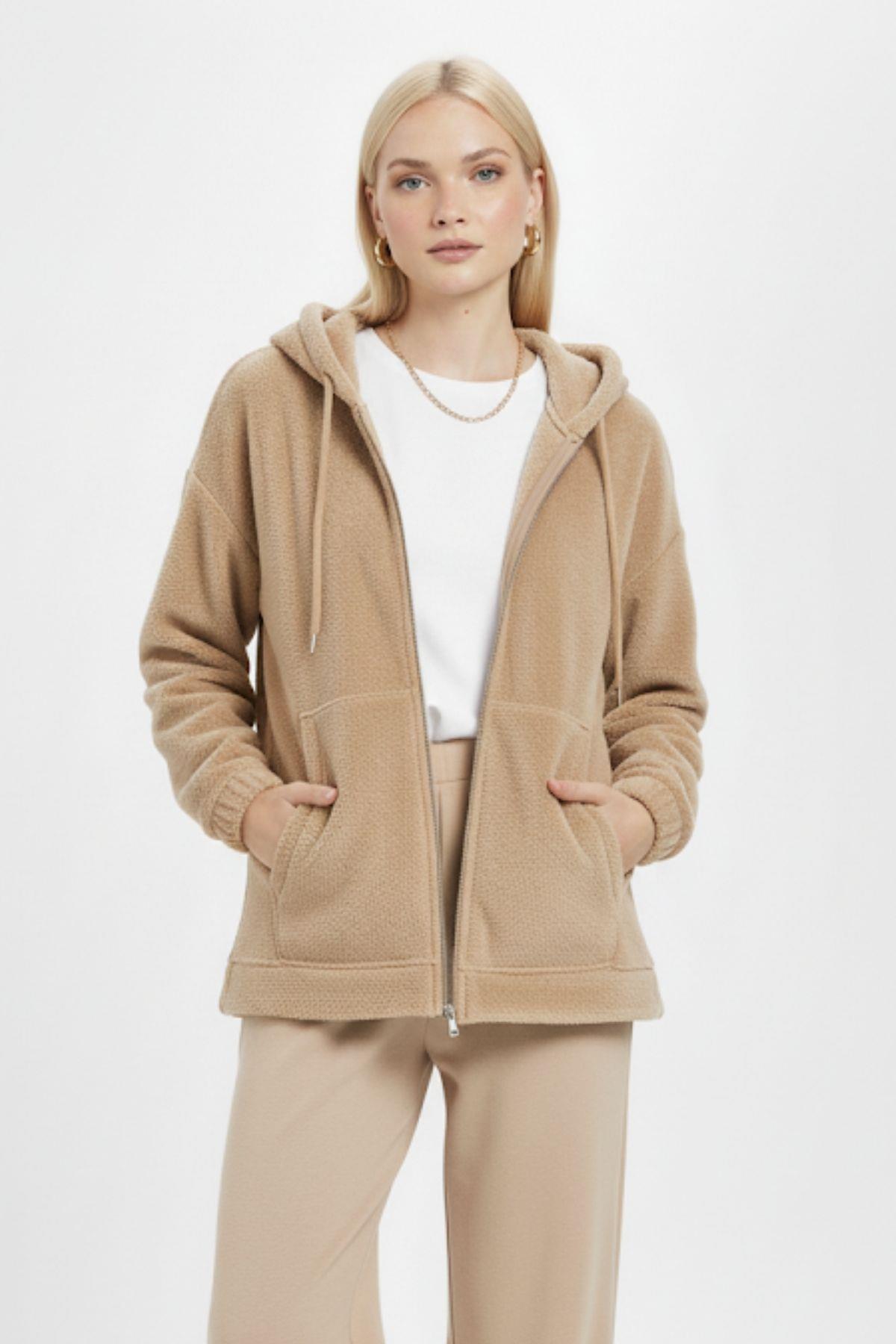 3057A Fermuarlı Peluş Ceket Vizon