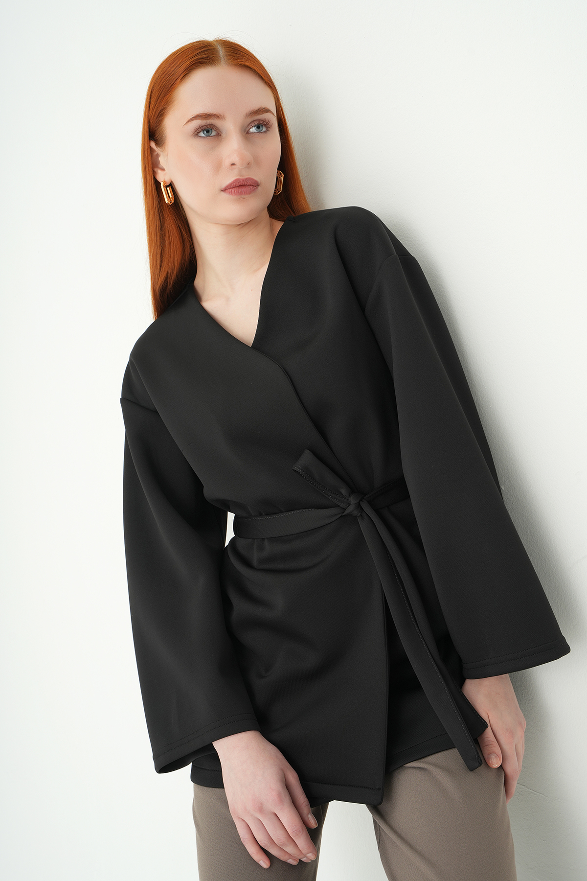 Siyah Kuşaklı Geniş Kol Kimono 3068A