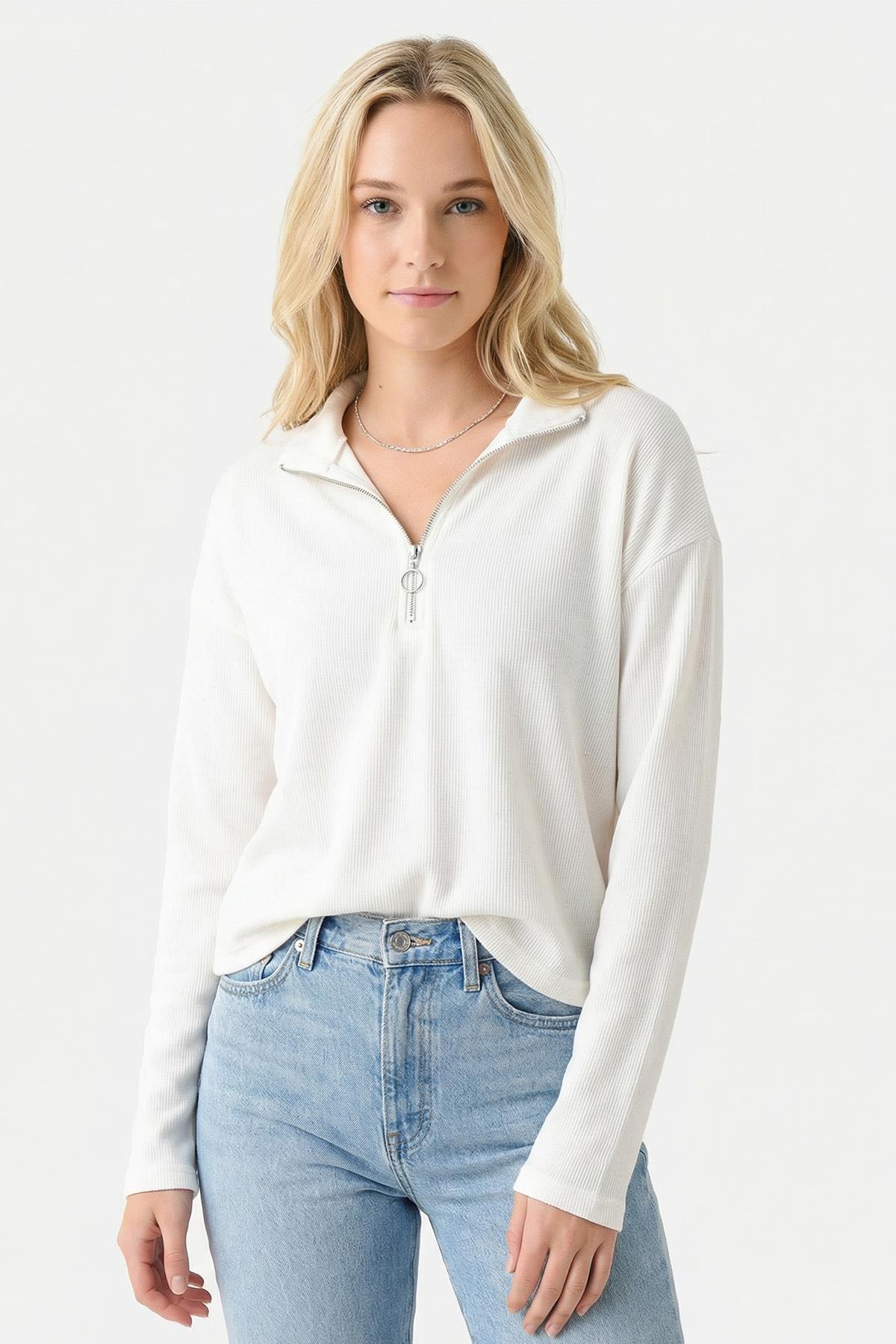 3069A Fermuarlı Uzun Kol Kazak Ekru