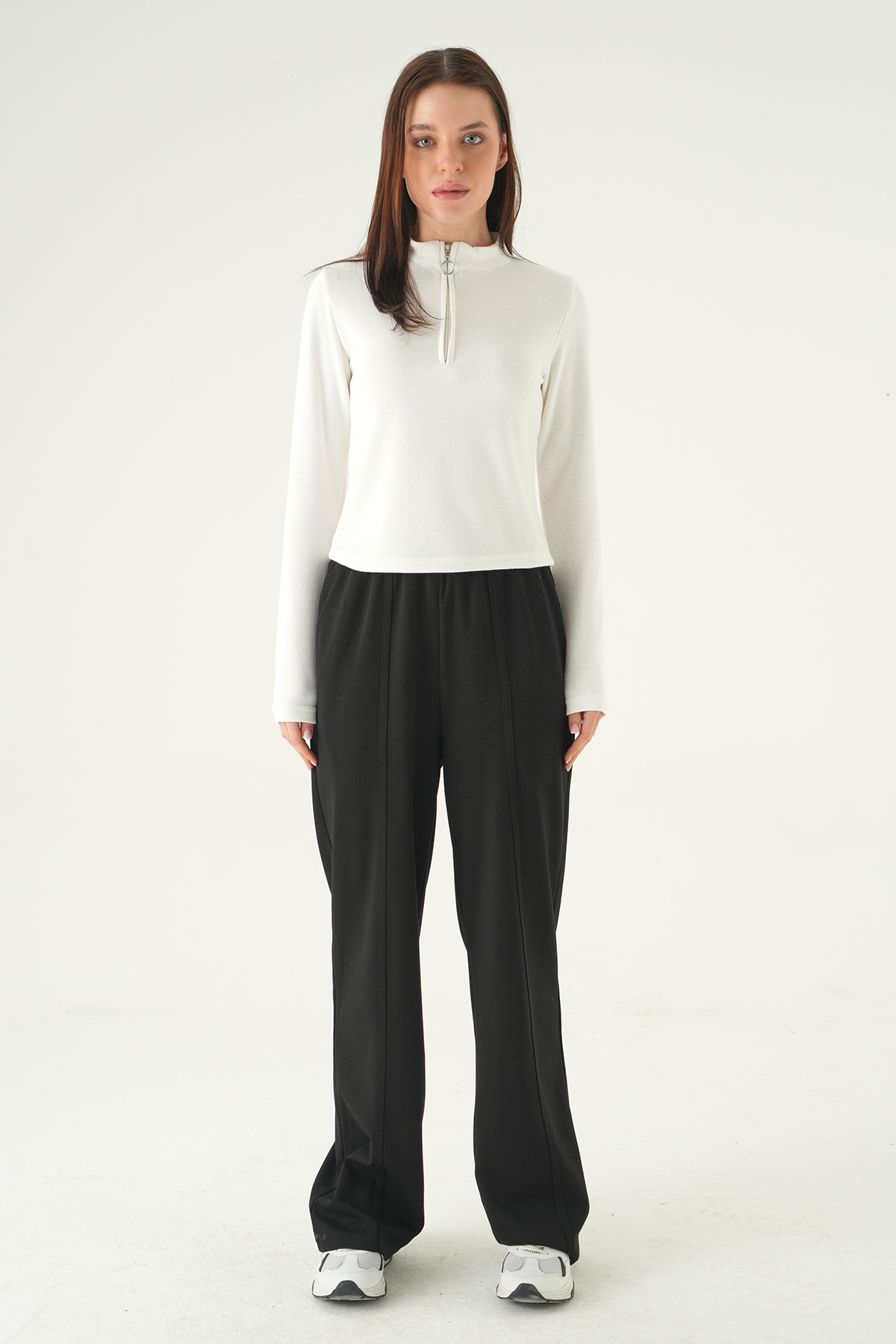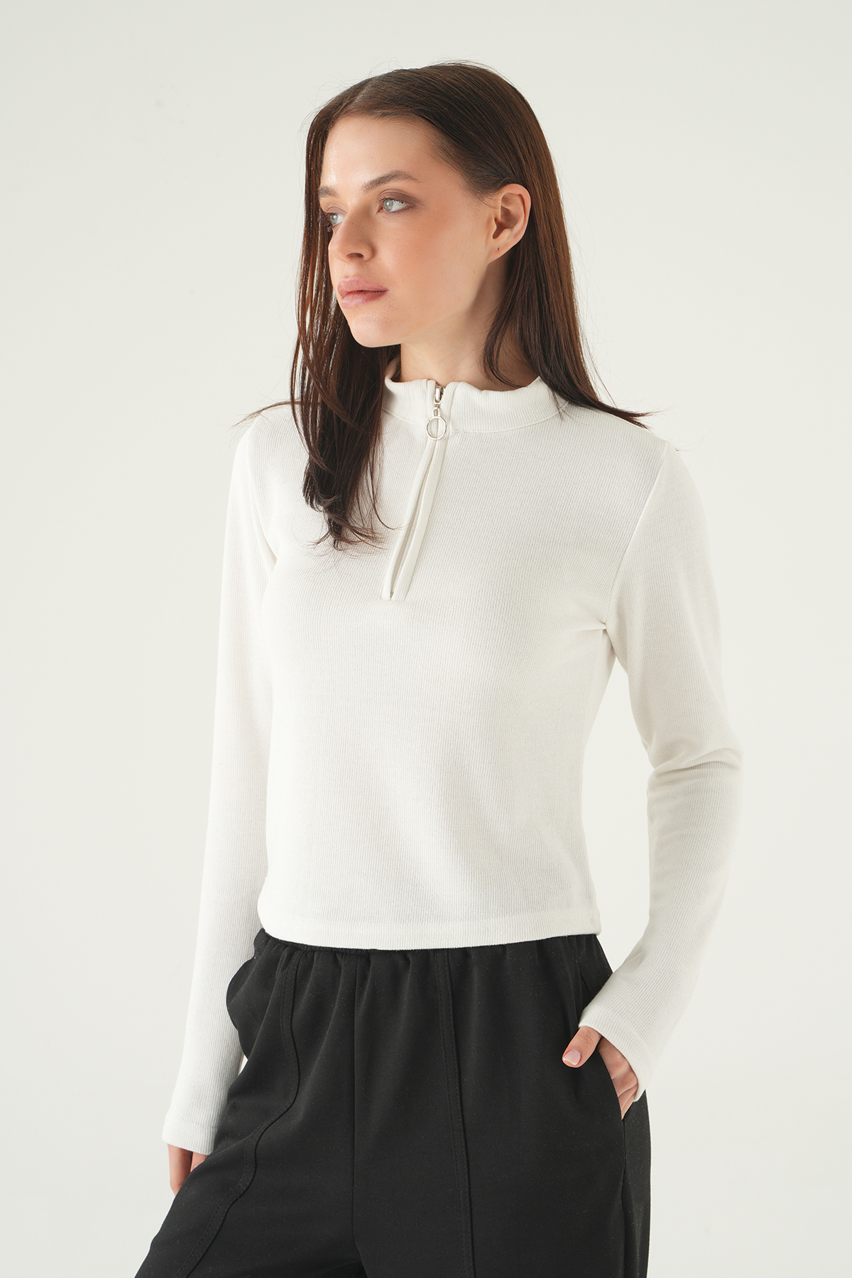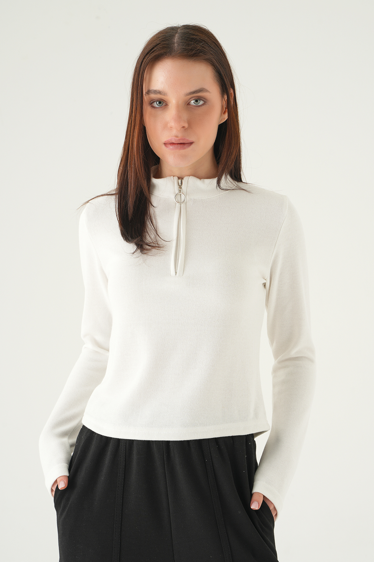Ekru Fermuarlı Uzun Kol Kazak 3069A