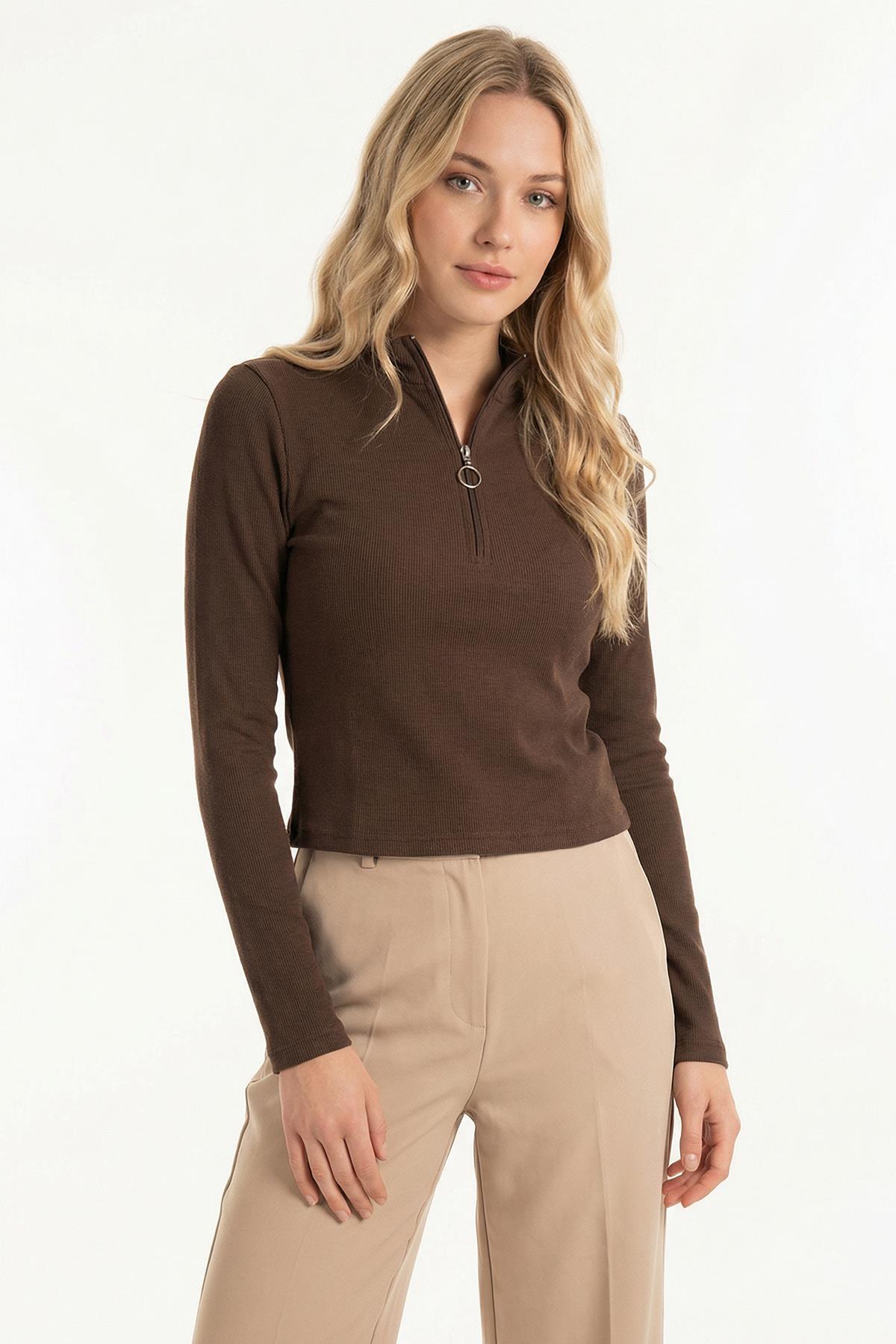 3069A Fermuarlı Uzun Kol Kazak Kahve