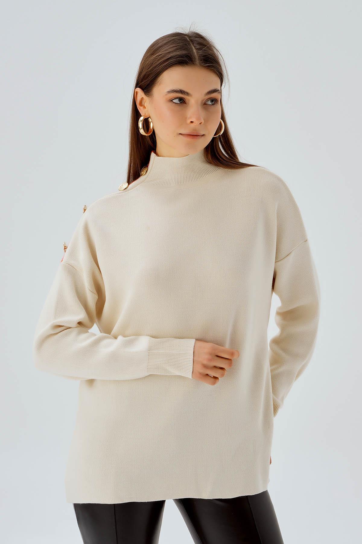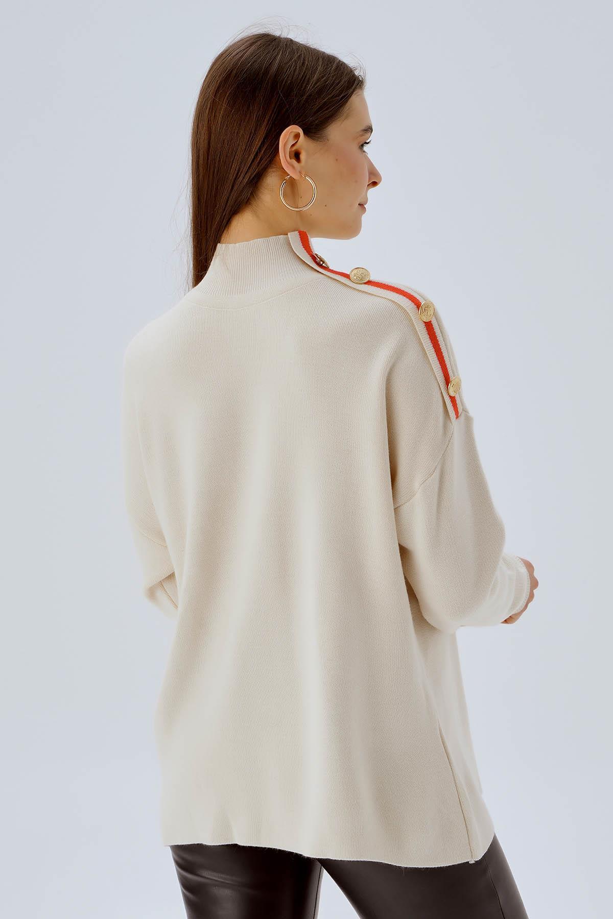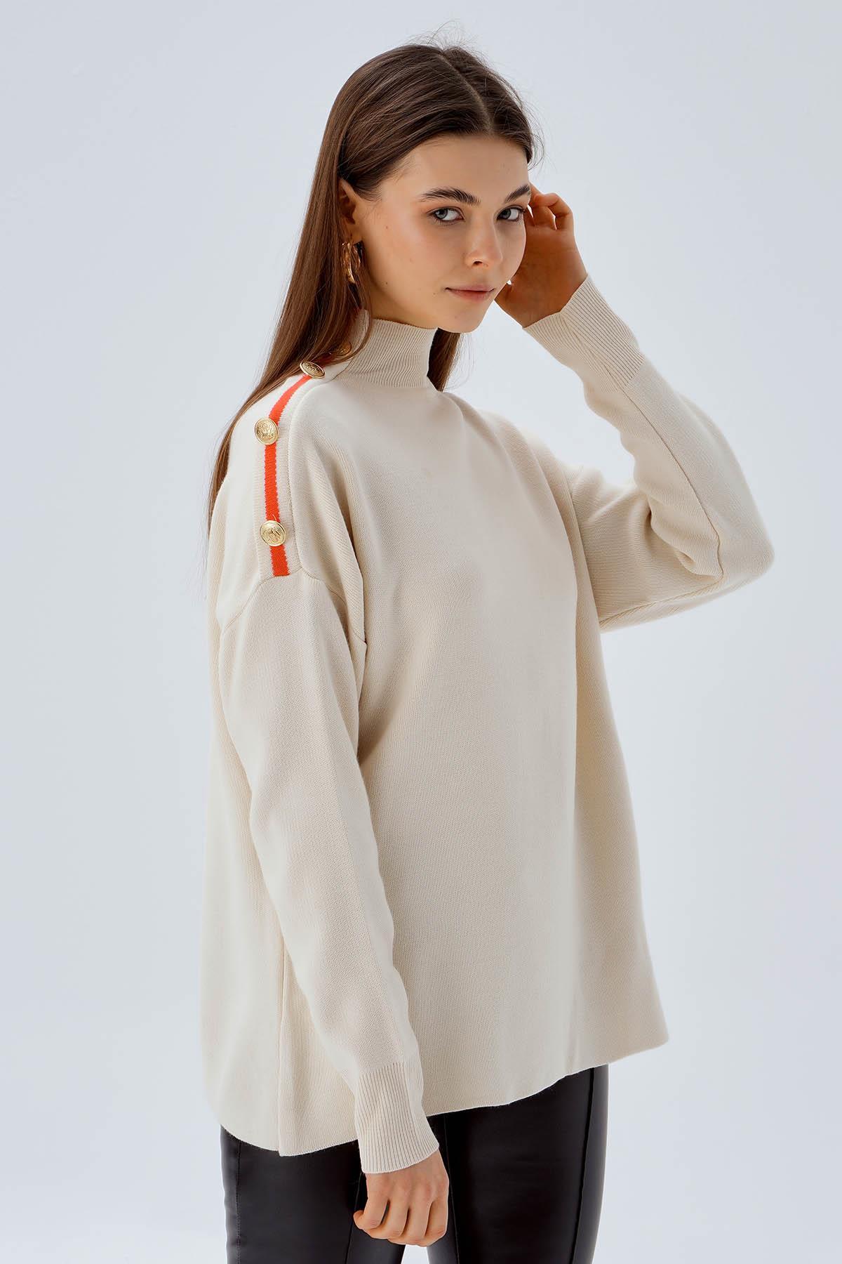 Ekru Omuz Şerit Detay Düğmeli Kazak 3075