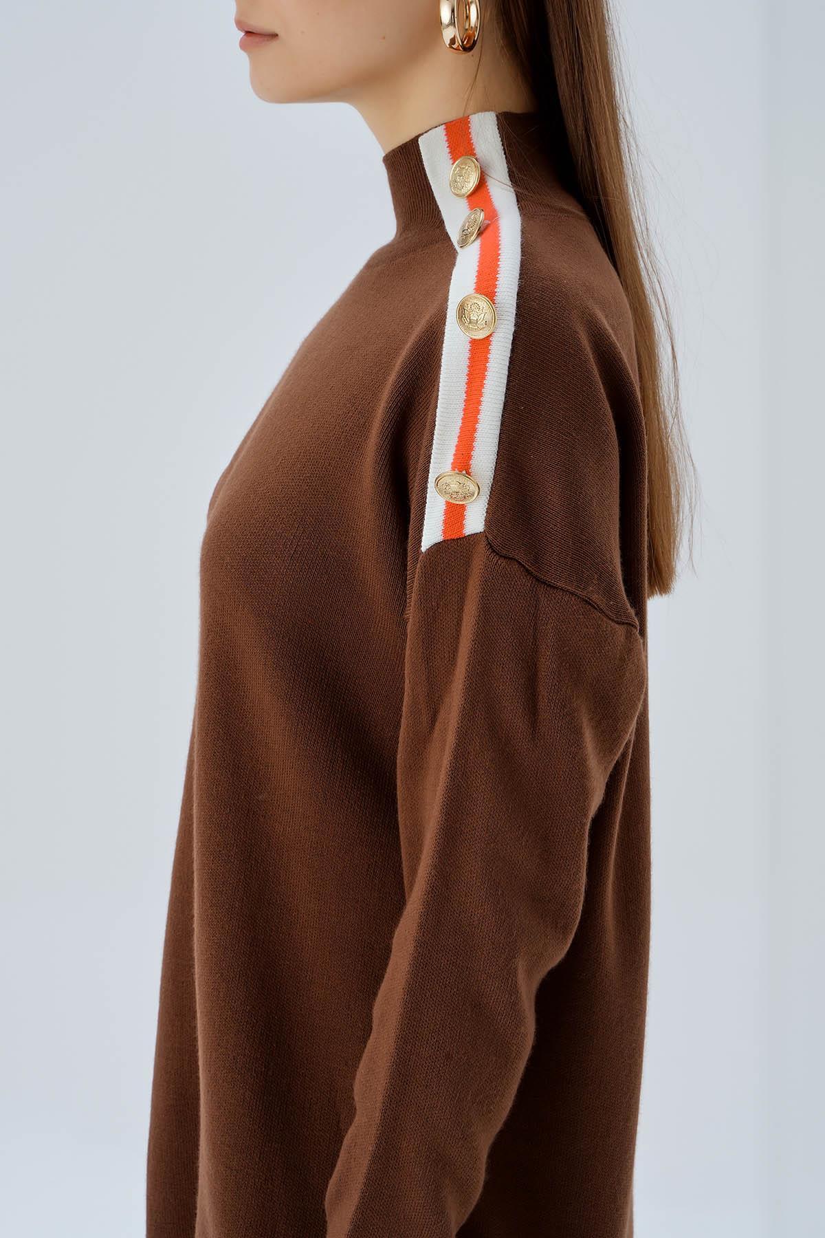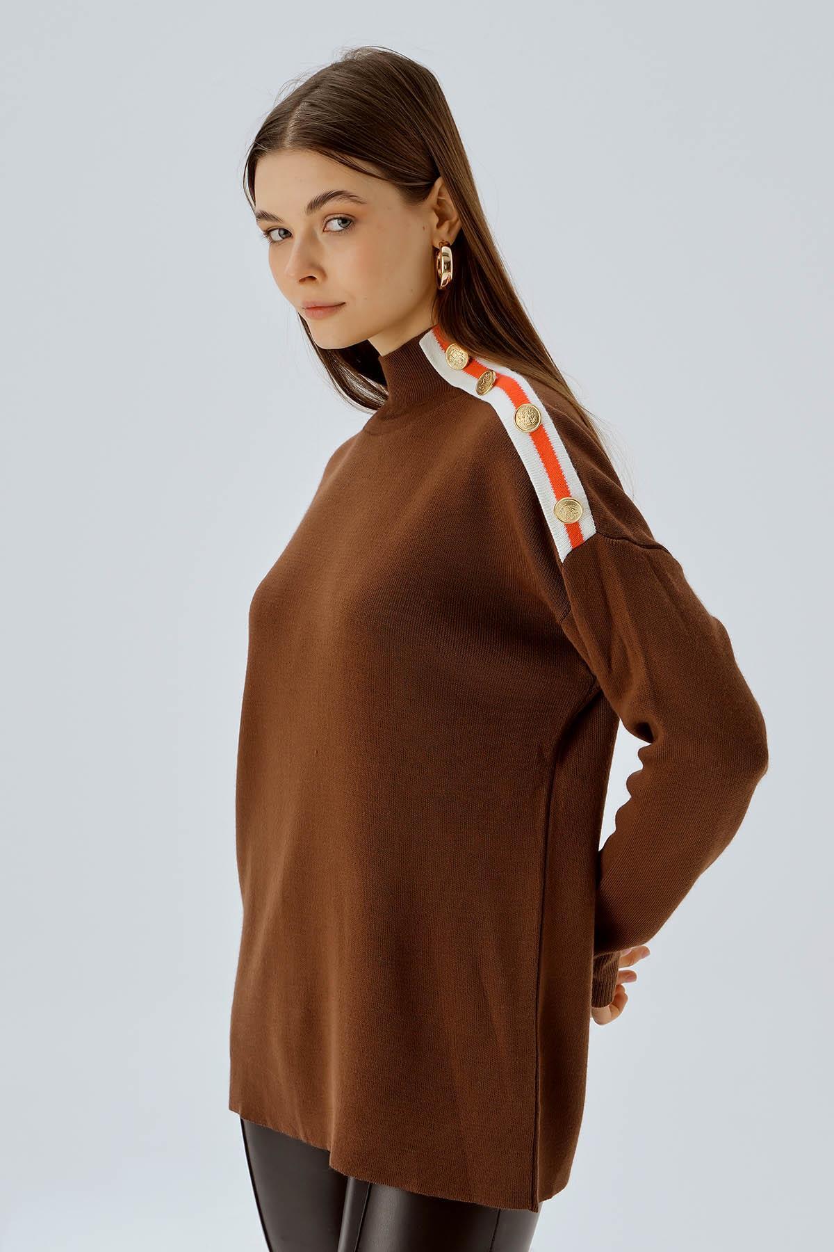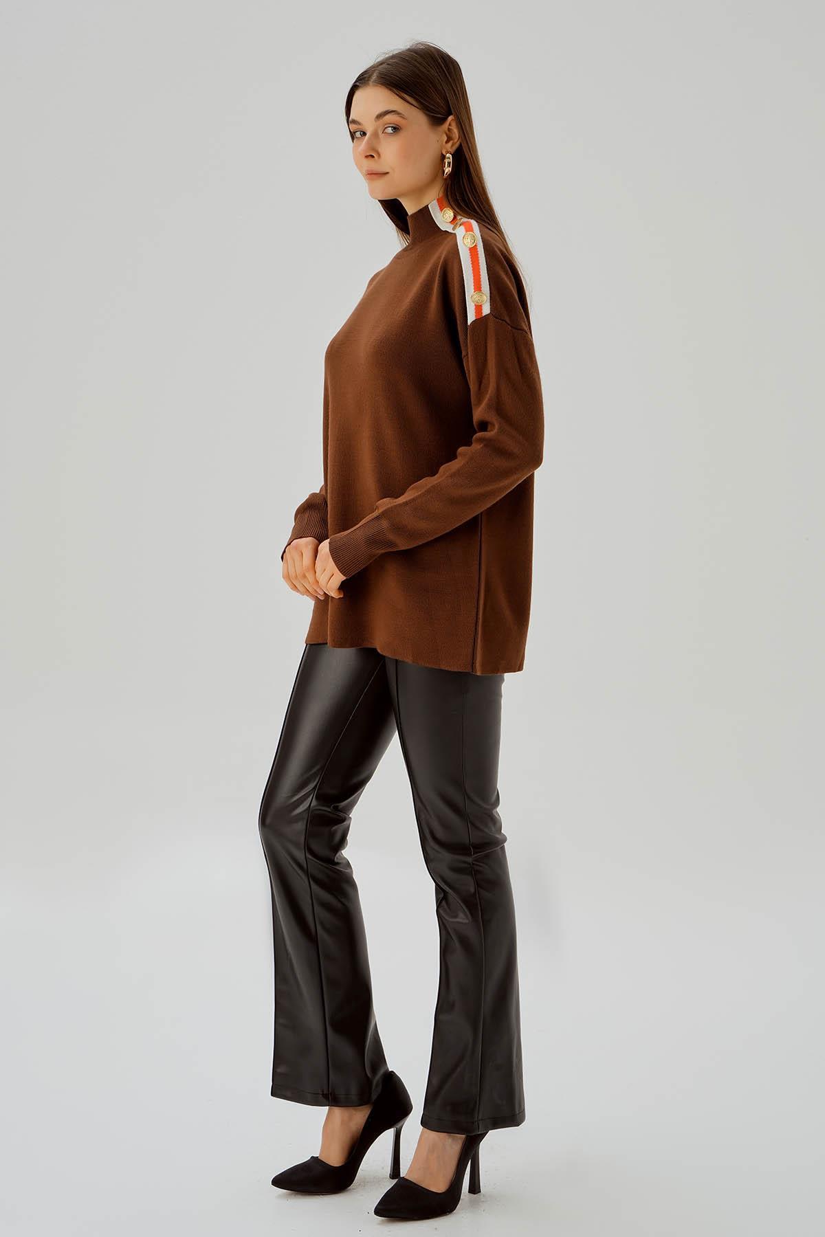 Kahve Omuz Şerit Detay Düğmeli Kazak 3075