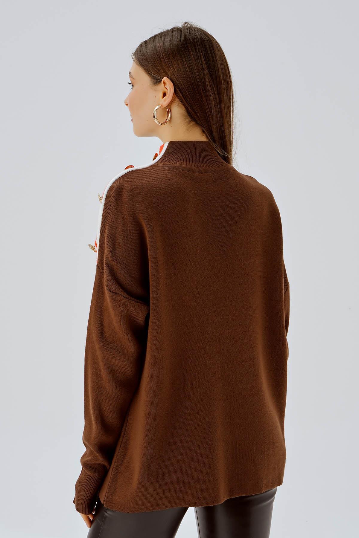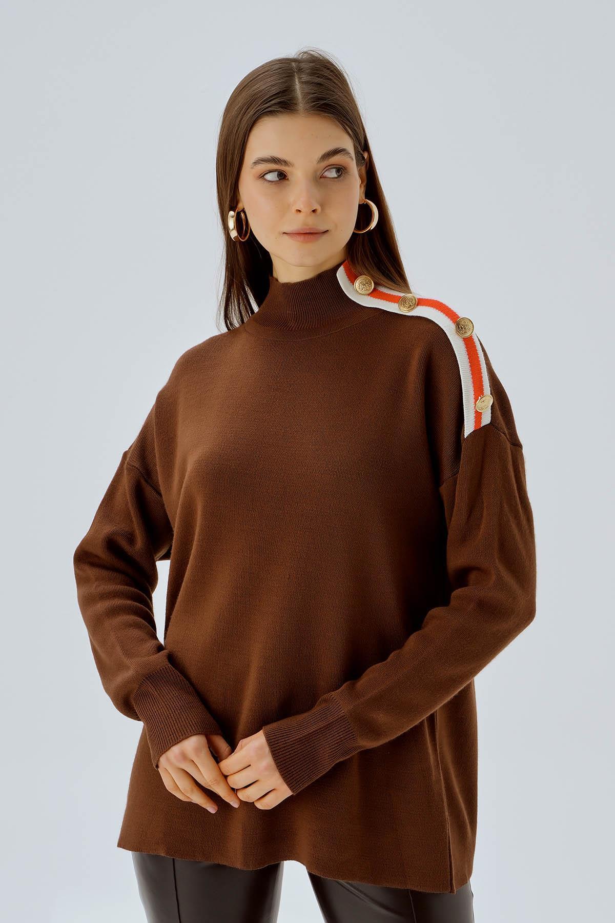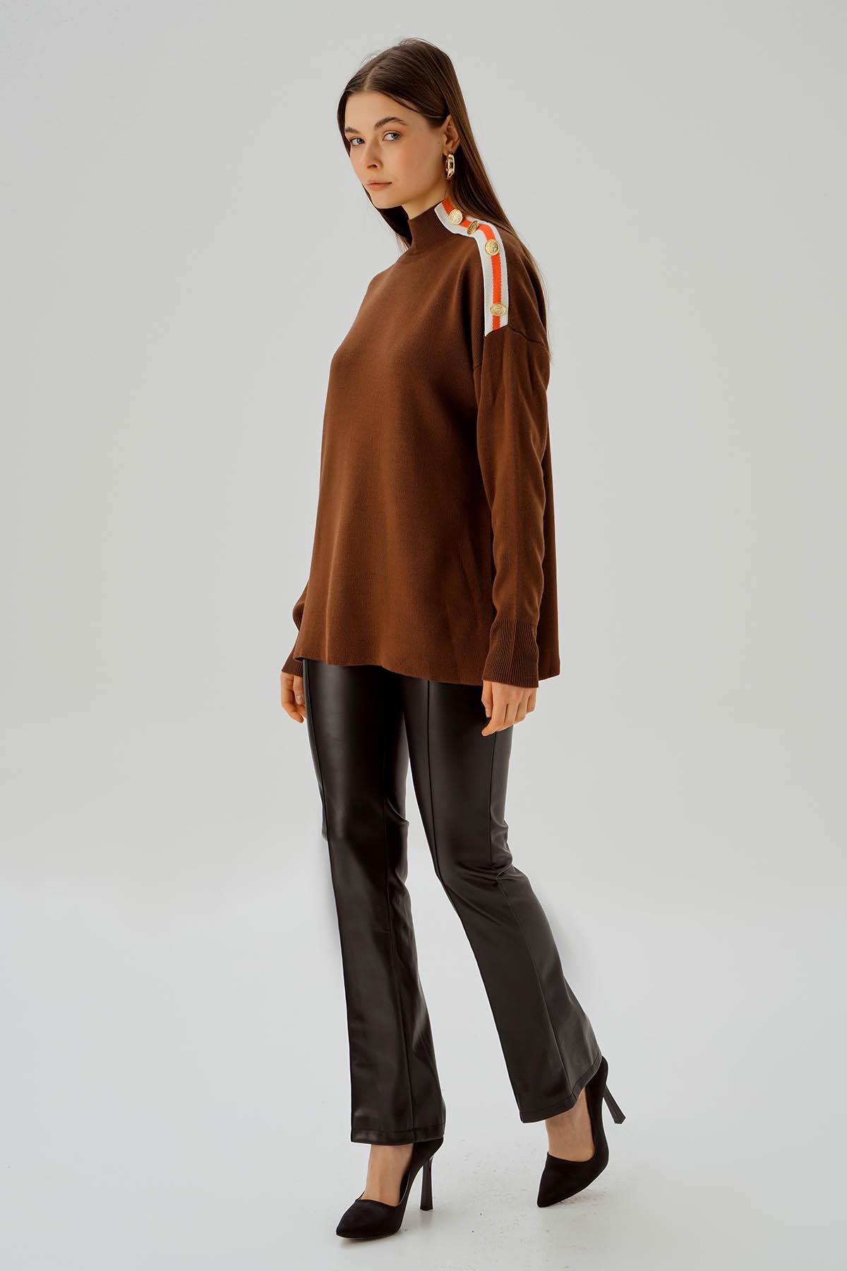 Kahve Omuz Şerit Detay Düğmeli Kazak 3075