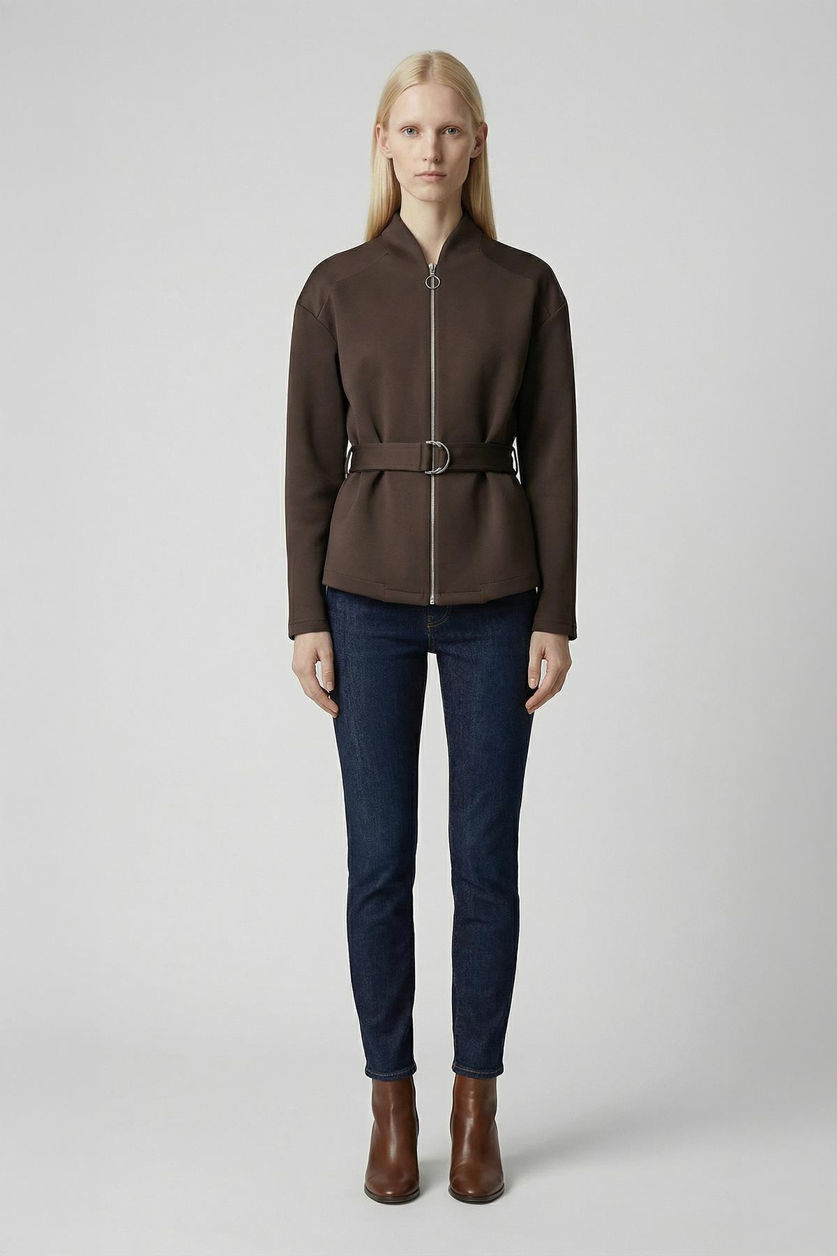 3075A Bel Bağlamalı Fermuarlı Hırka Kahve