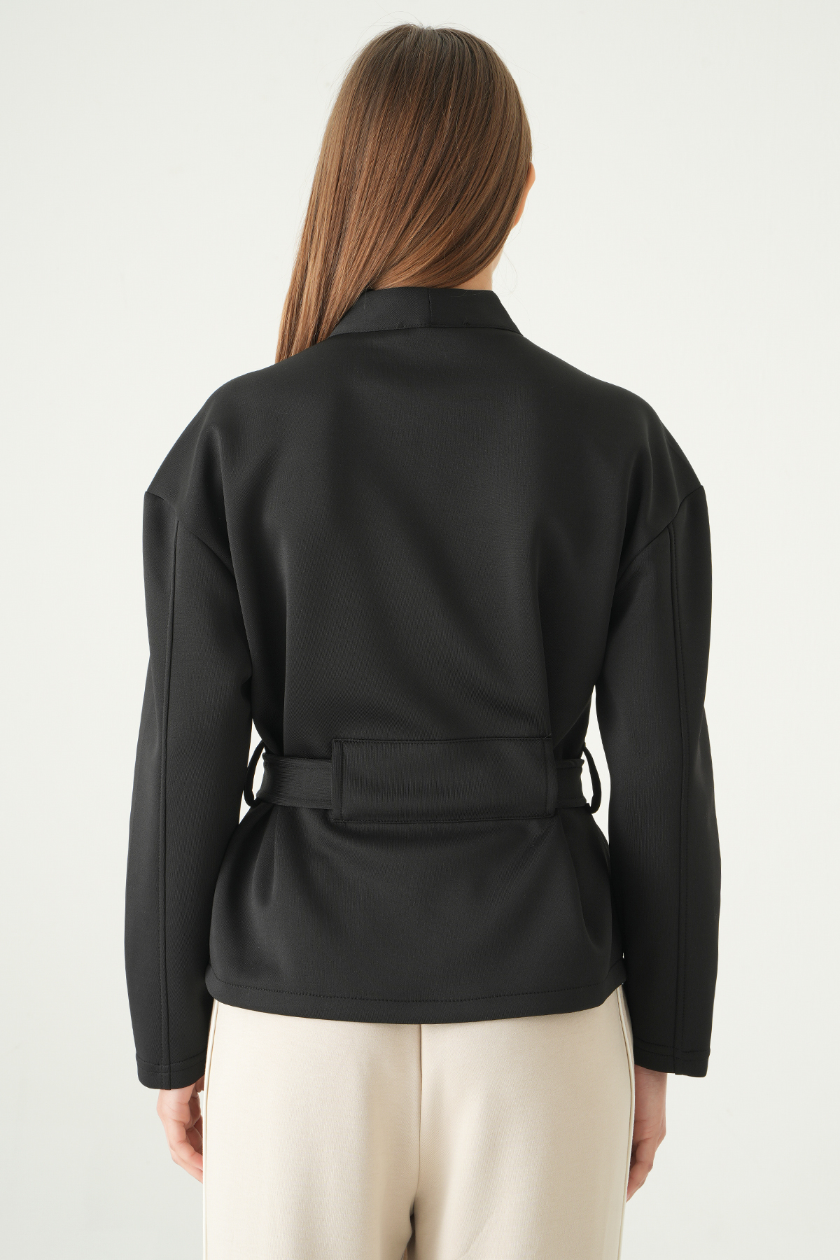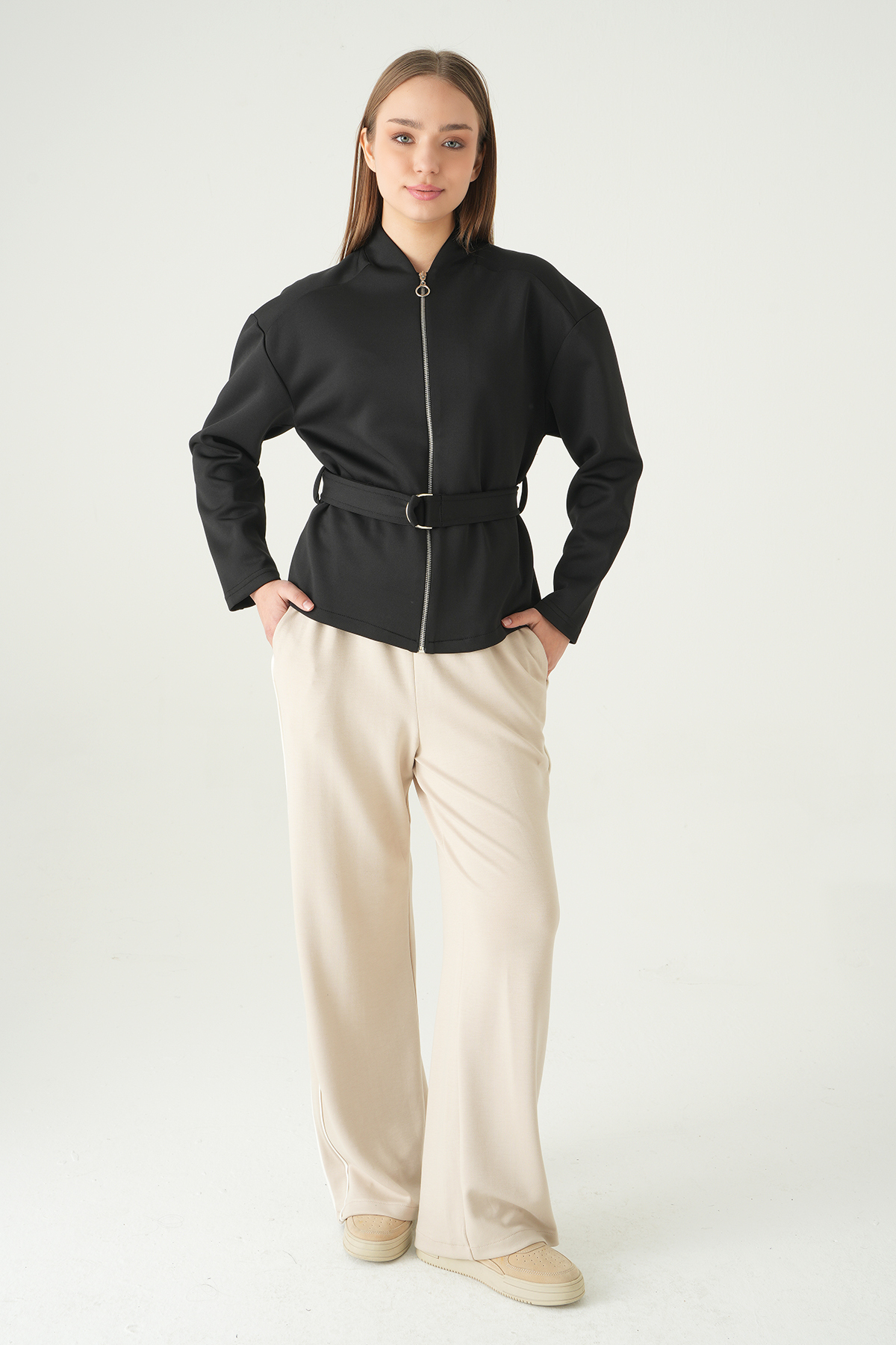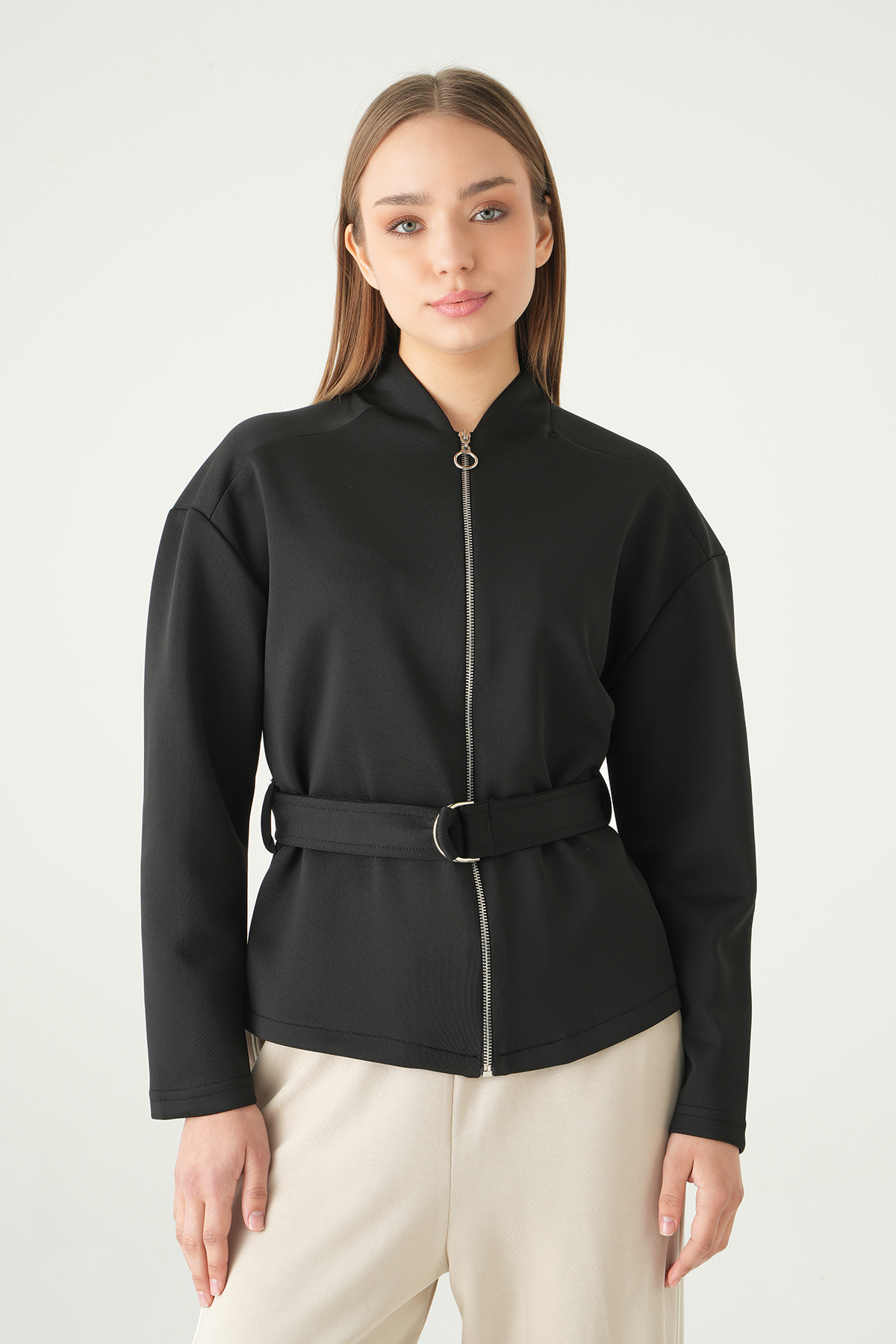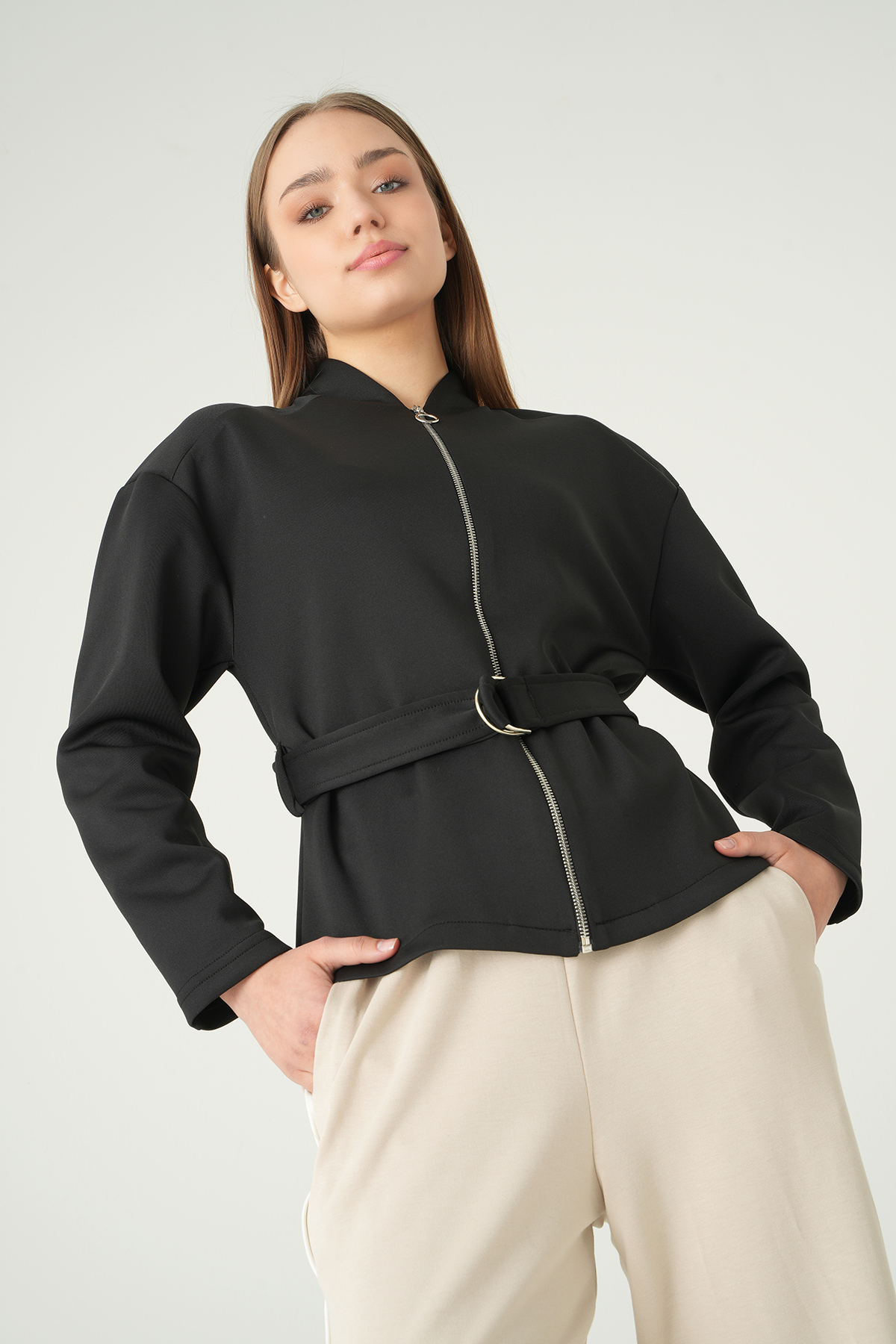 Siyah Bel Bağlamalı Fermuarlı Hırka 3075A