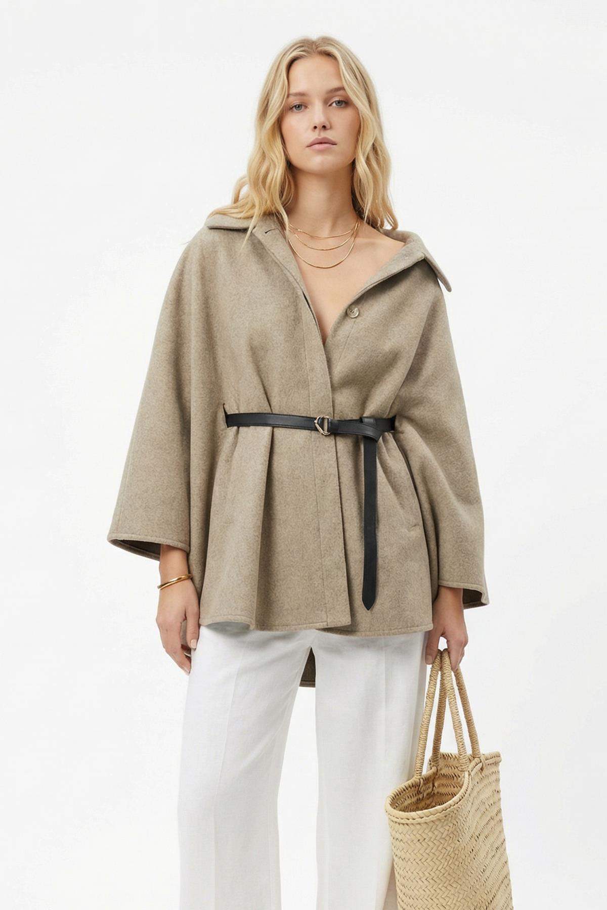 Bej Gömlek Yaka Kuşaklı Panço Kadın Kaban 3099A