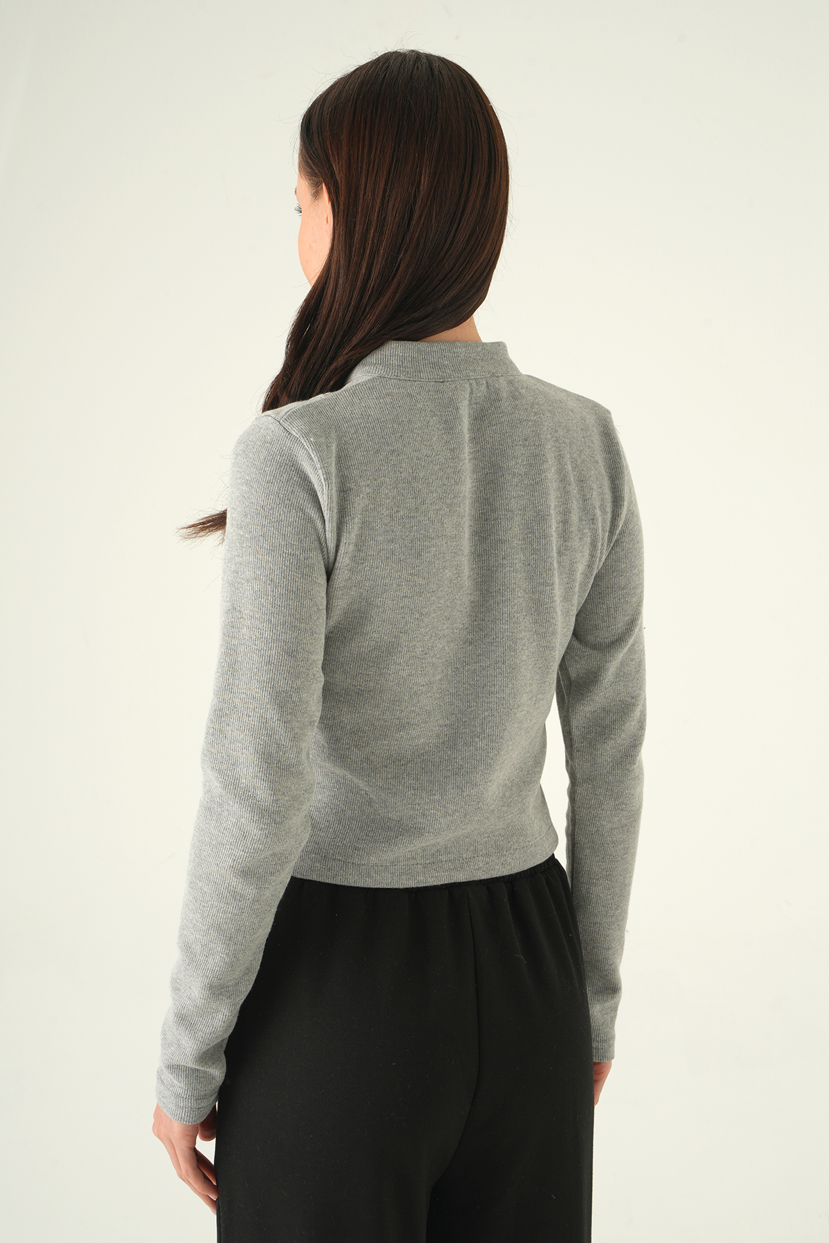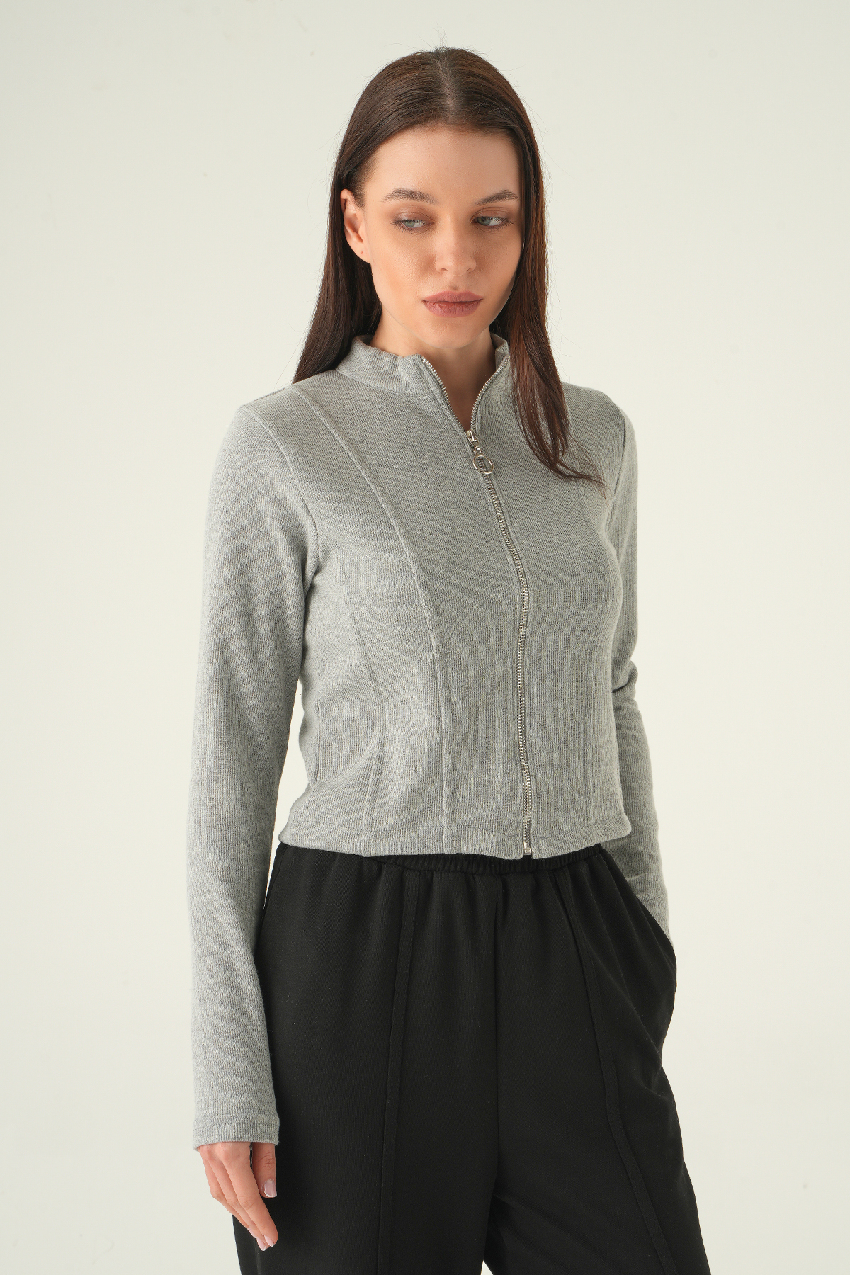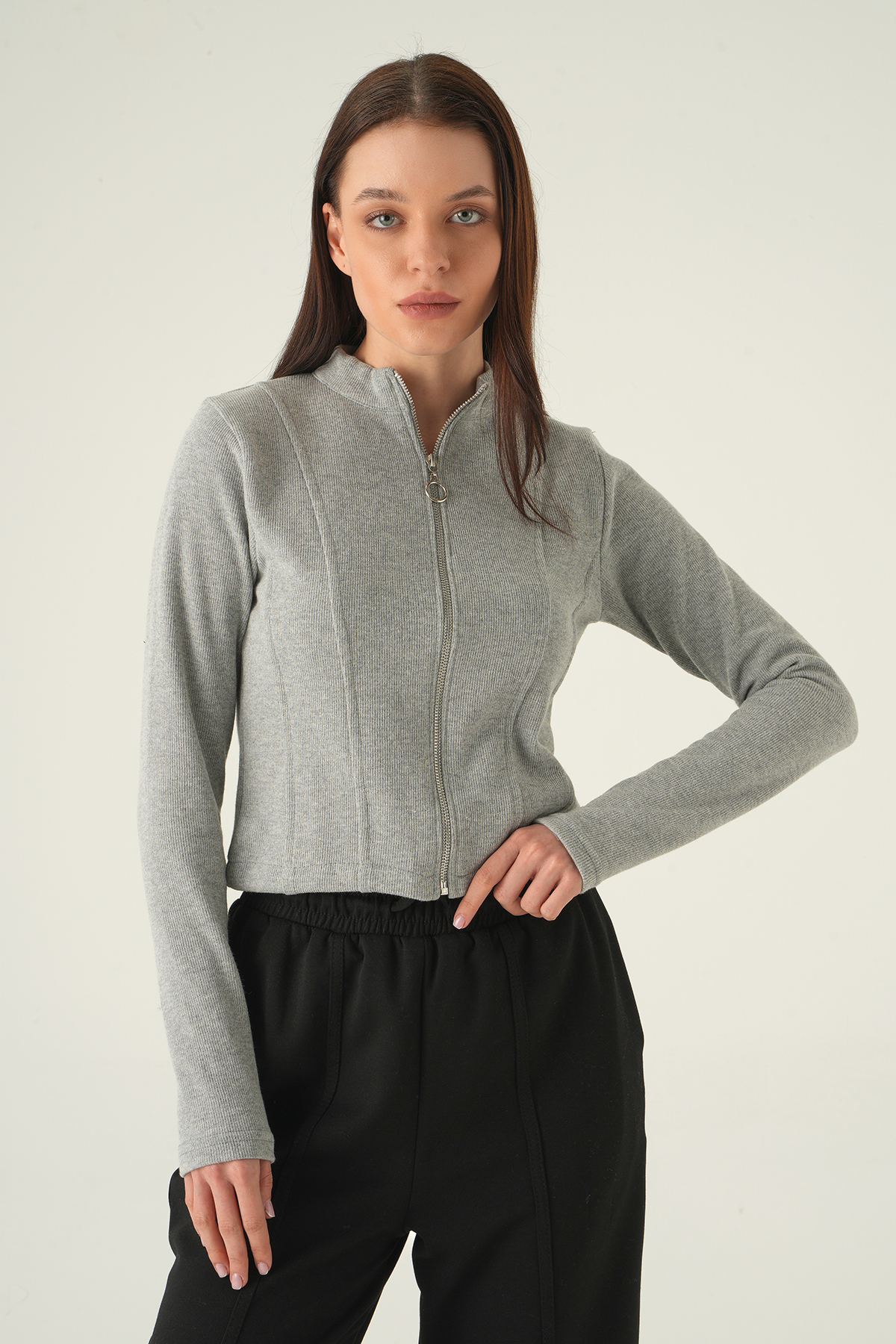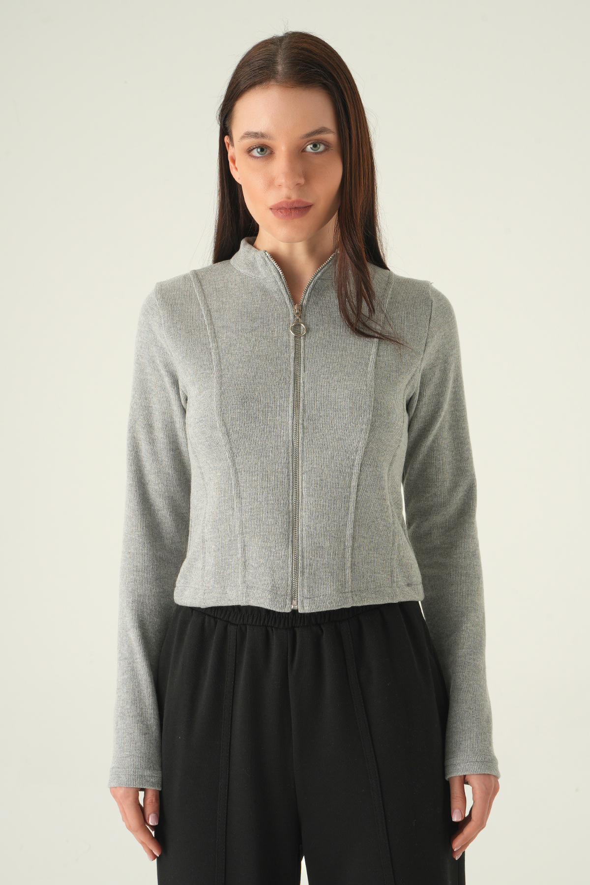 Gri Ön Fermuarlı Kısa Hırka 3080A