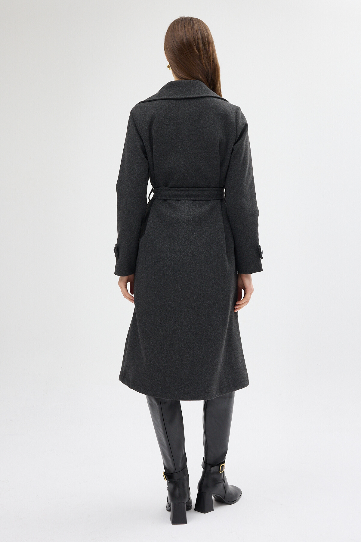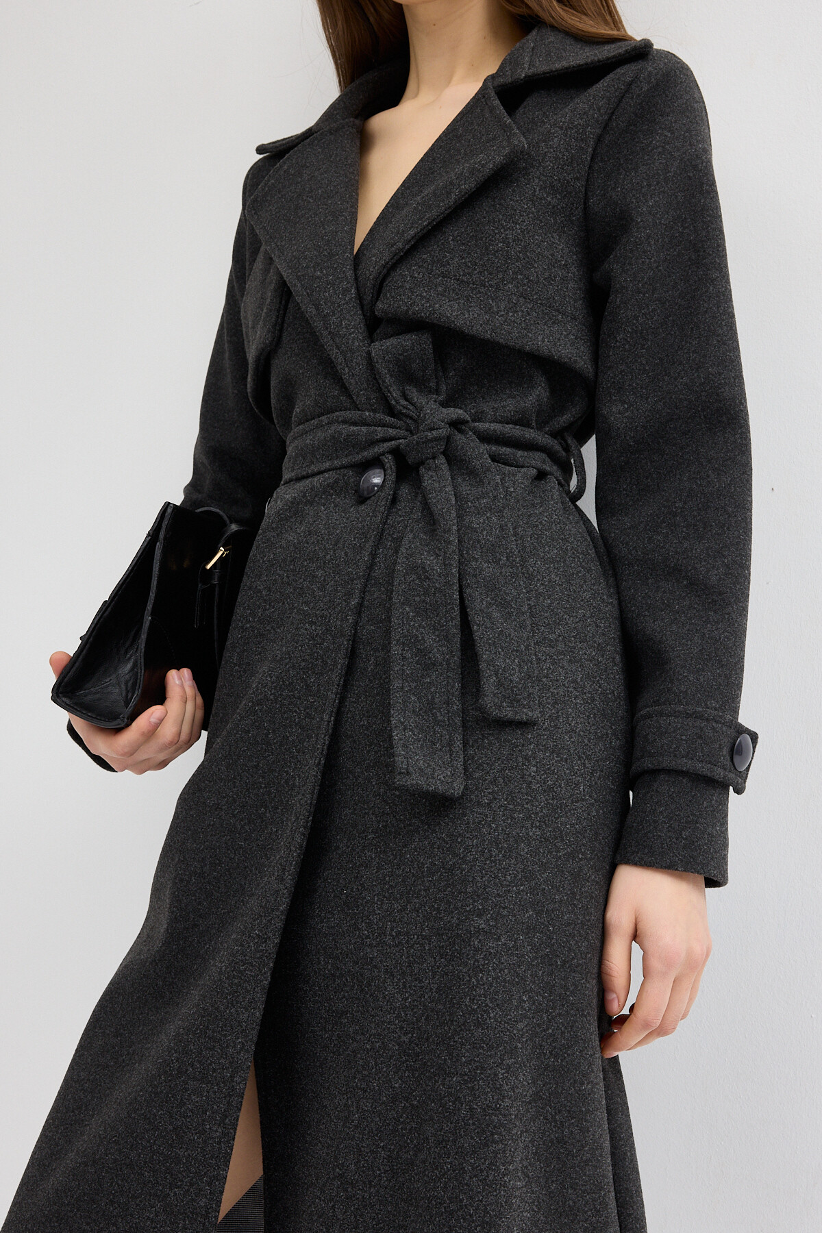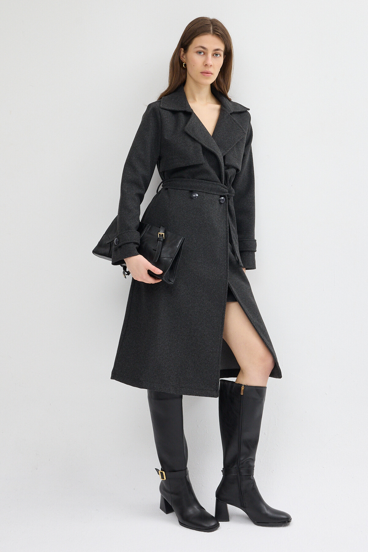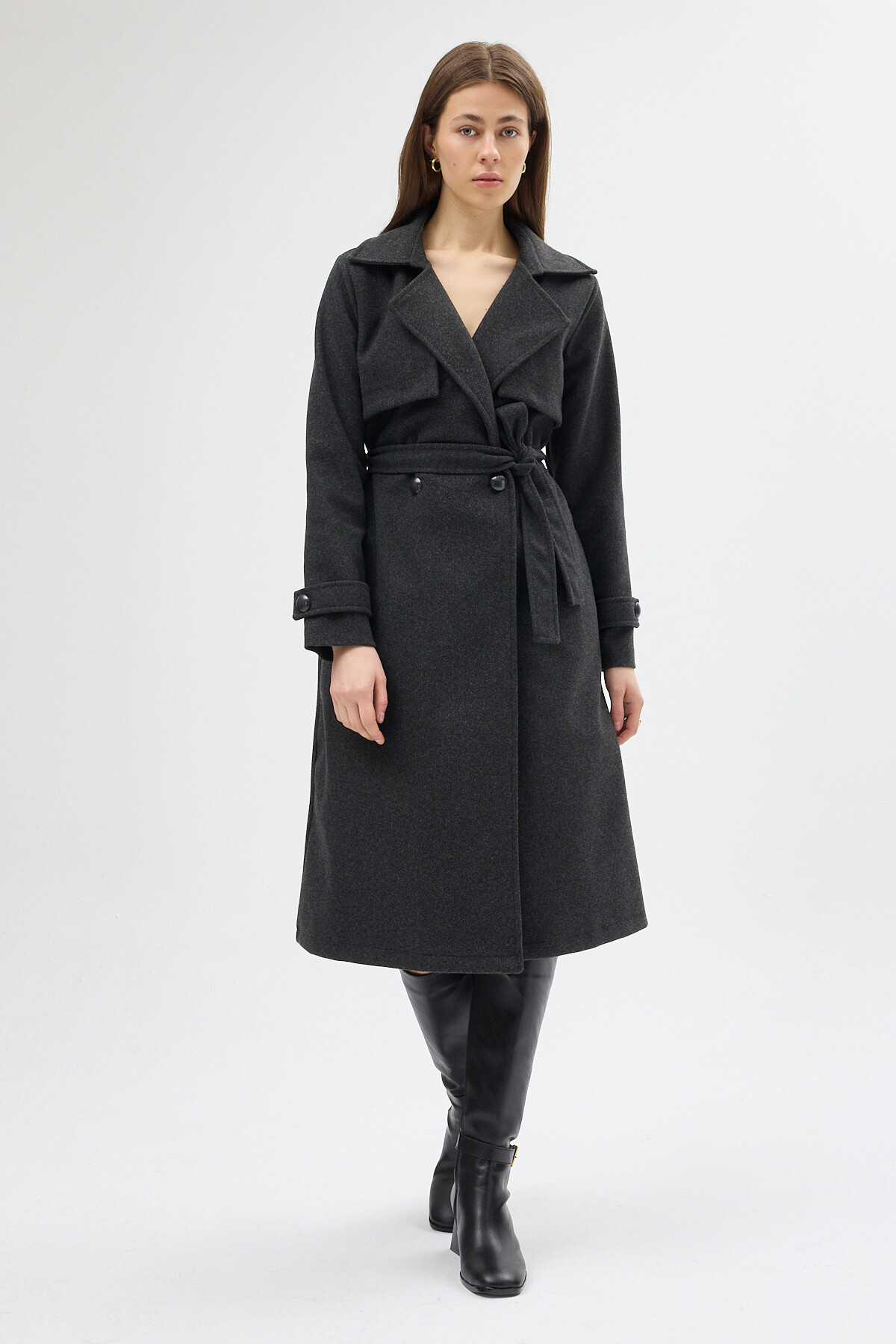 Antrasit Kuşaklı Yaka Detaylı Uzun Kadın Trenç Kaban 3095A