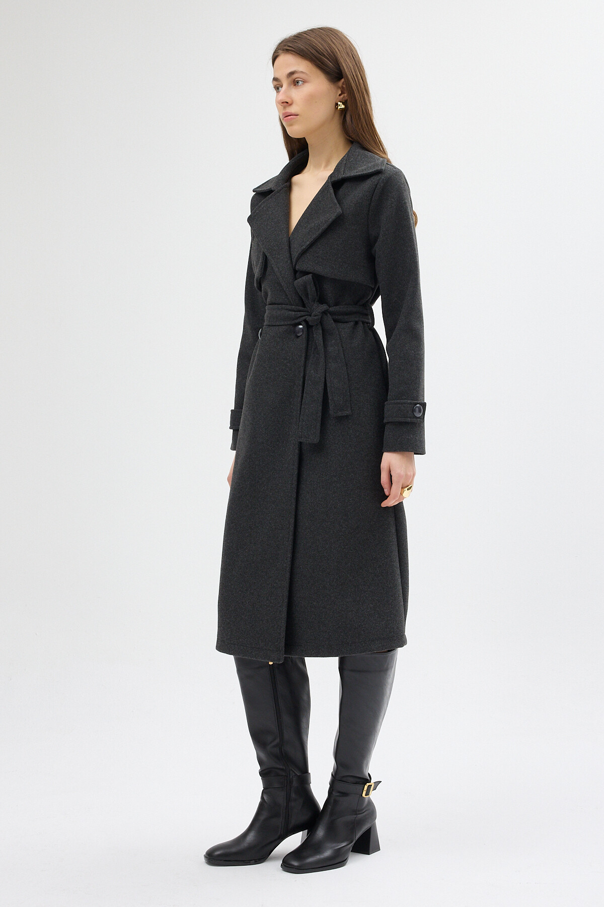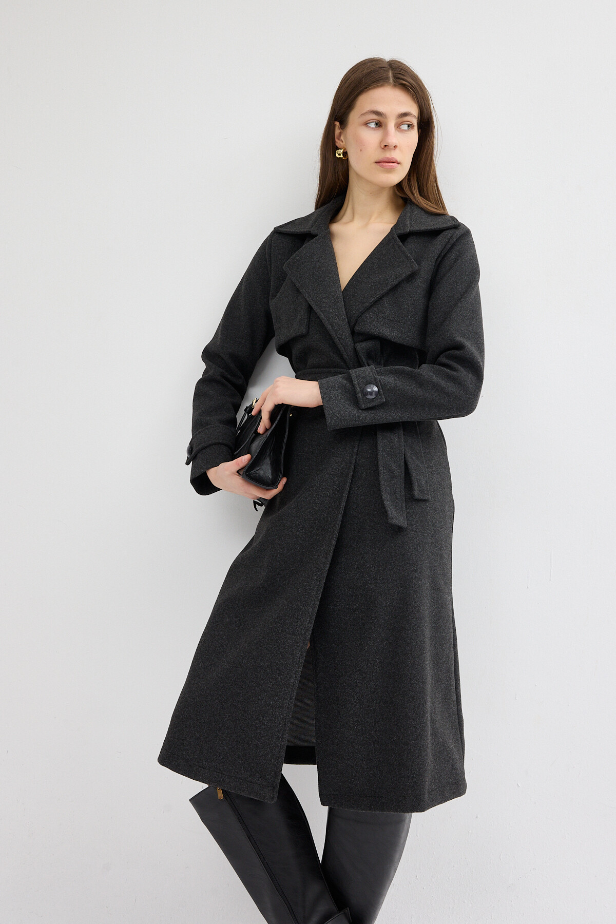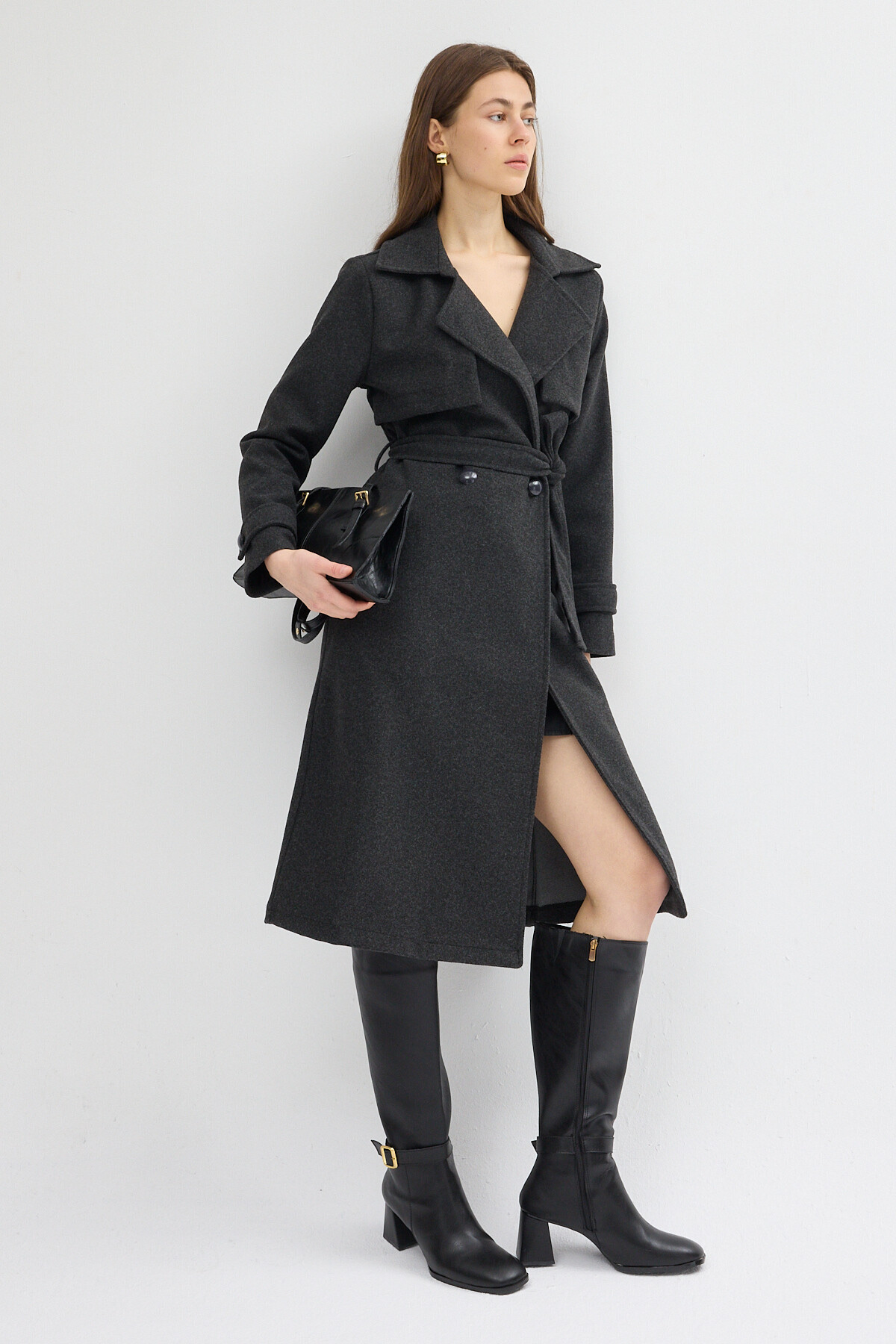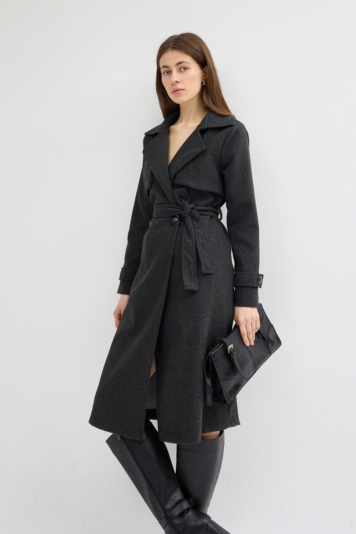Antrasit Kuşaklı Yaka Detaylı Uzun Kadın Trenç Kaban 3095A