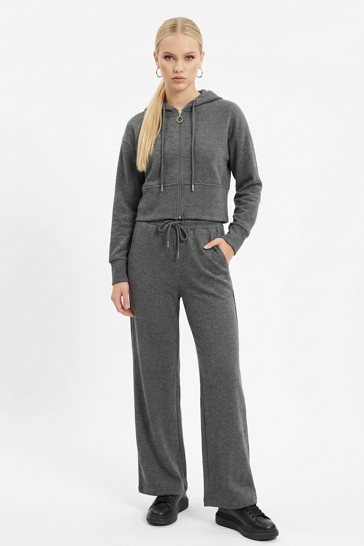 Antrasit Kapüşonlu Fermuarlı Triko Örme Pantolon Kadın Takım 2460